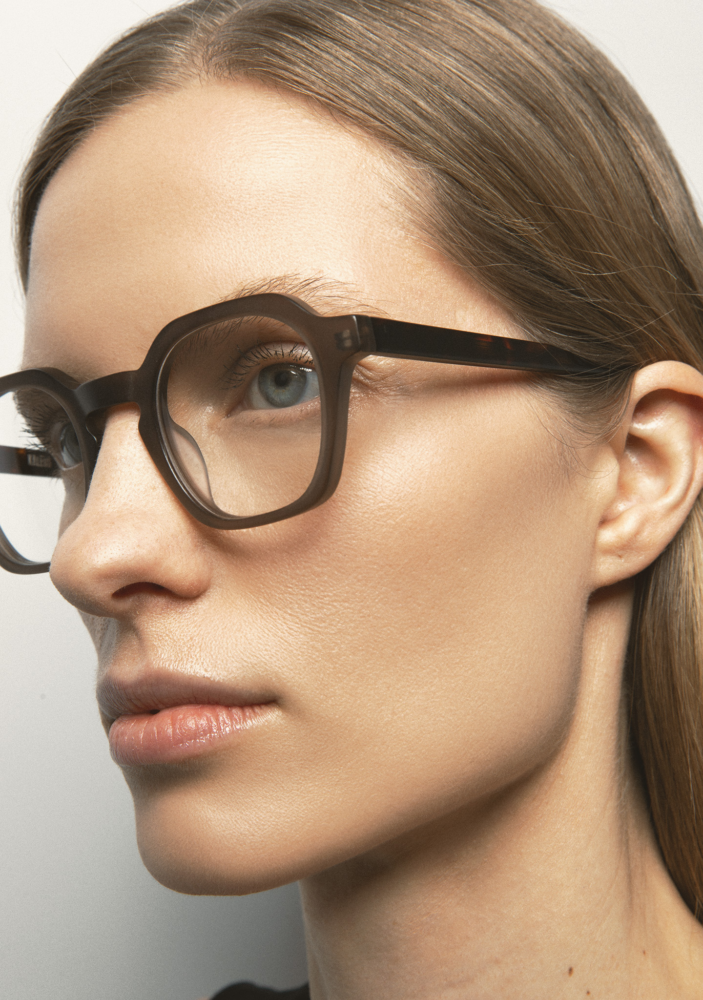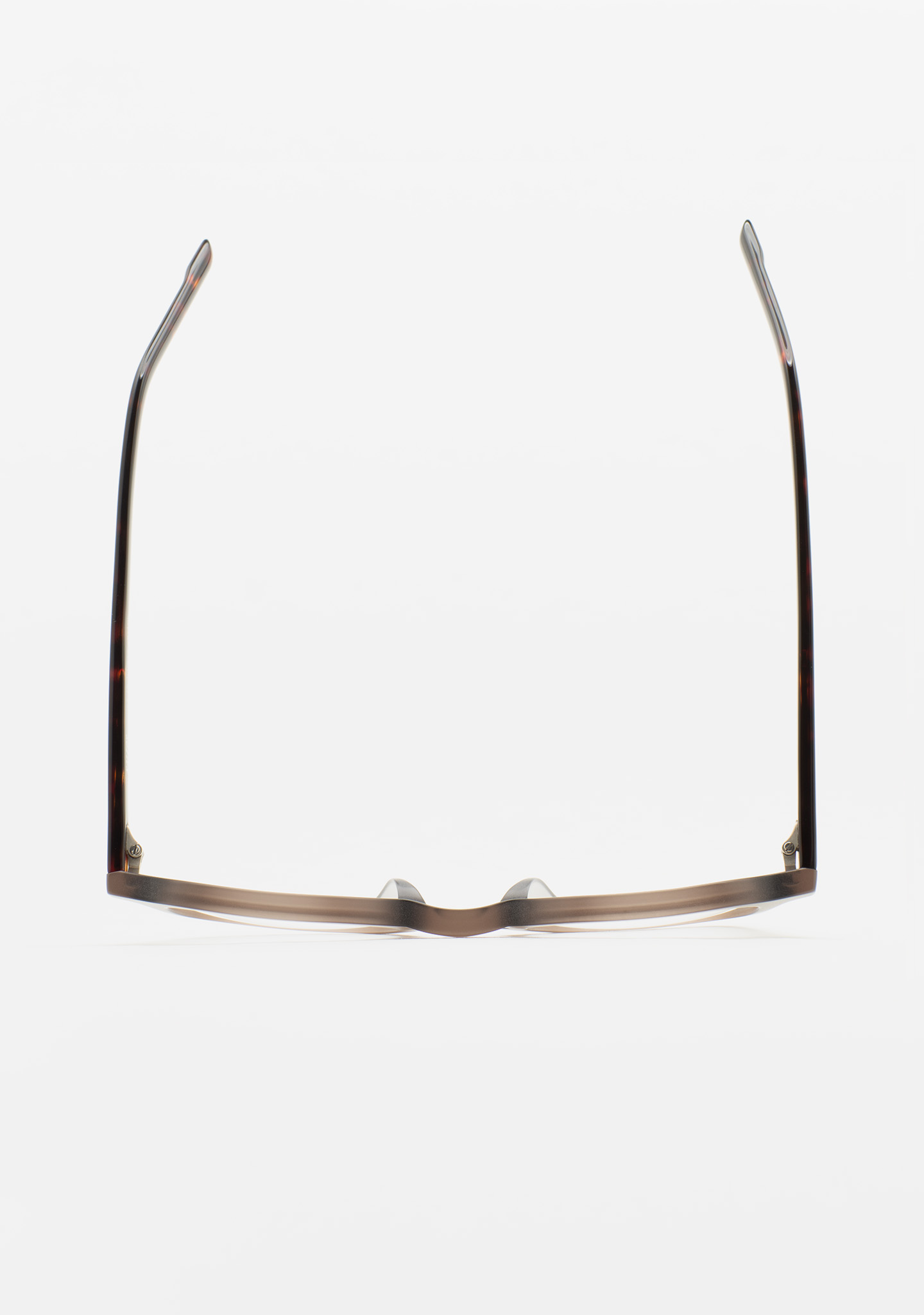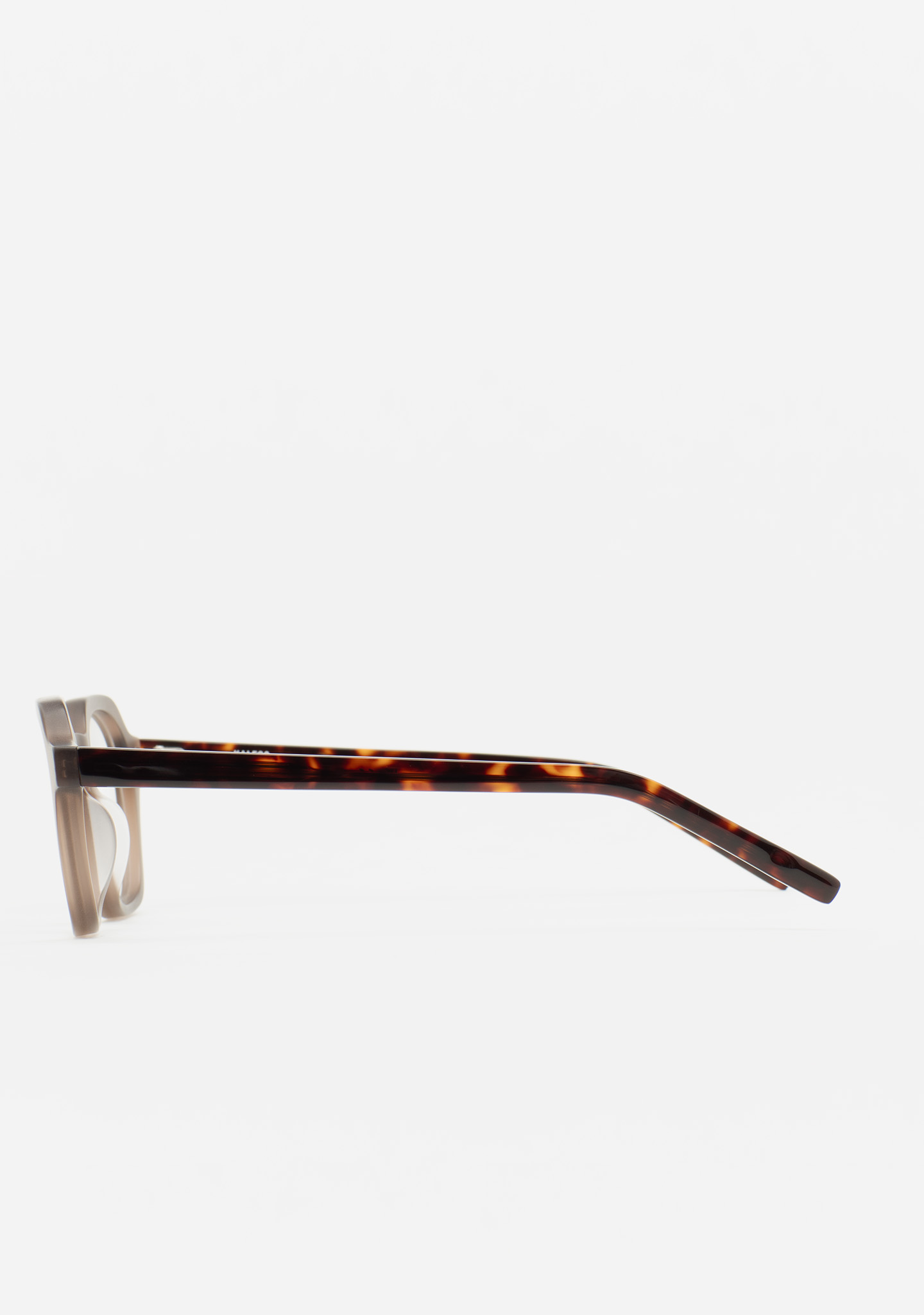 Quadratische Korrekturbrille. Design mit markanten Details. Front aus mattem transparentem hellbraunem Acetat mit dunkelbraunen Havana-Acetatbügeln. Integrierte Acetat-Nasenpads. Handgefertigt.