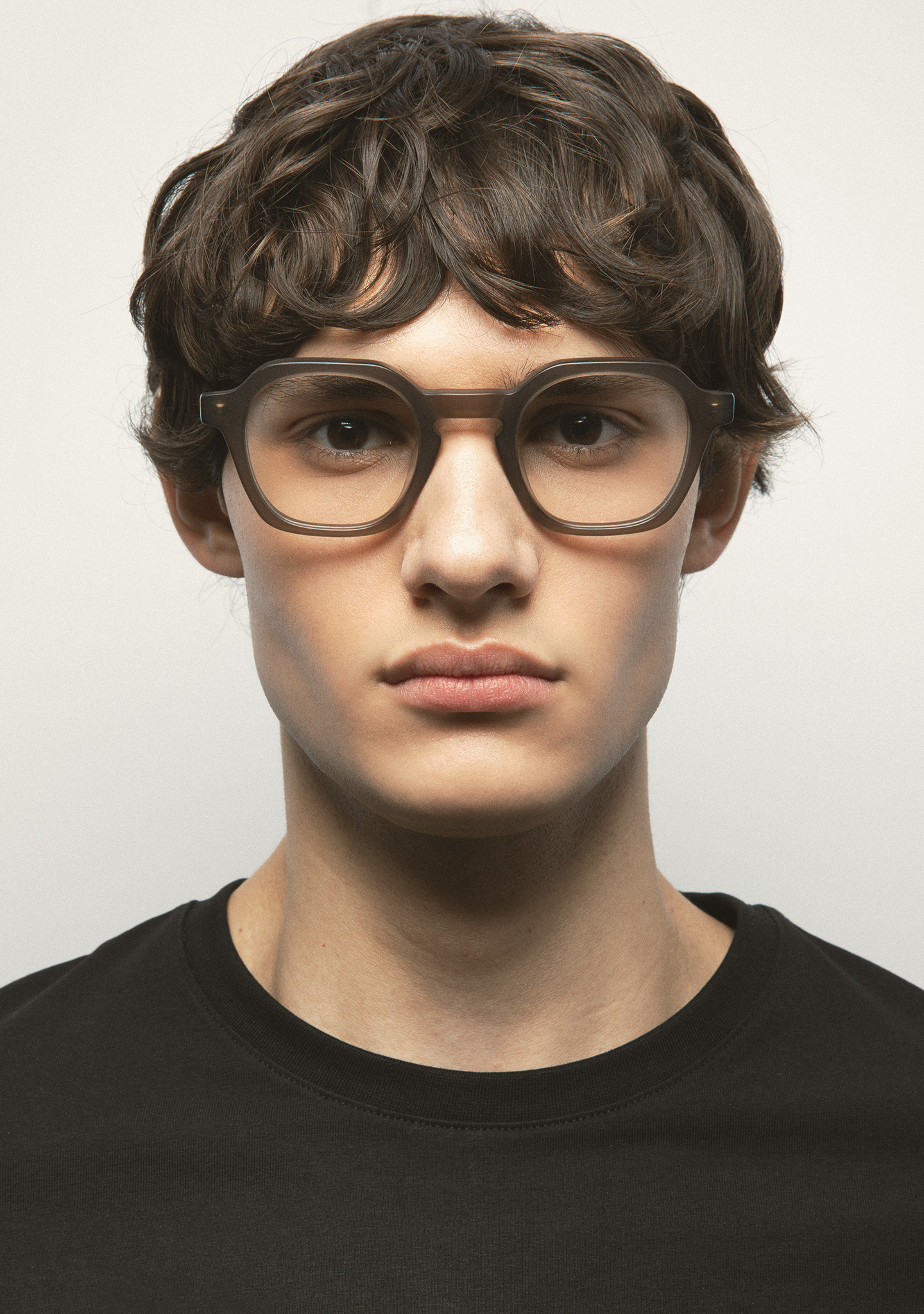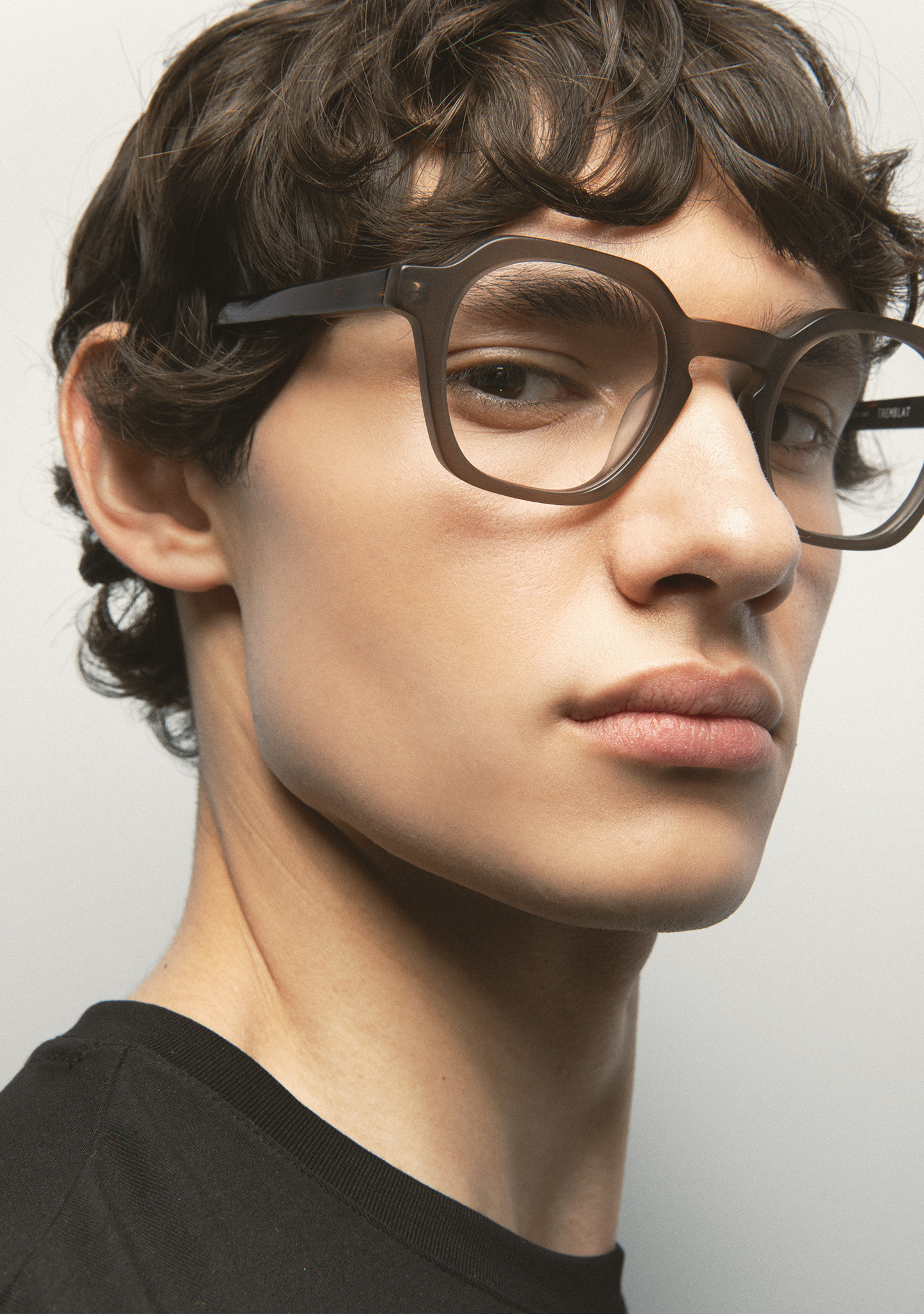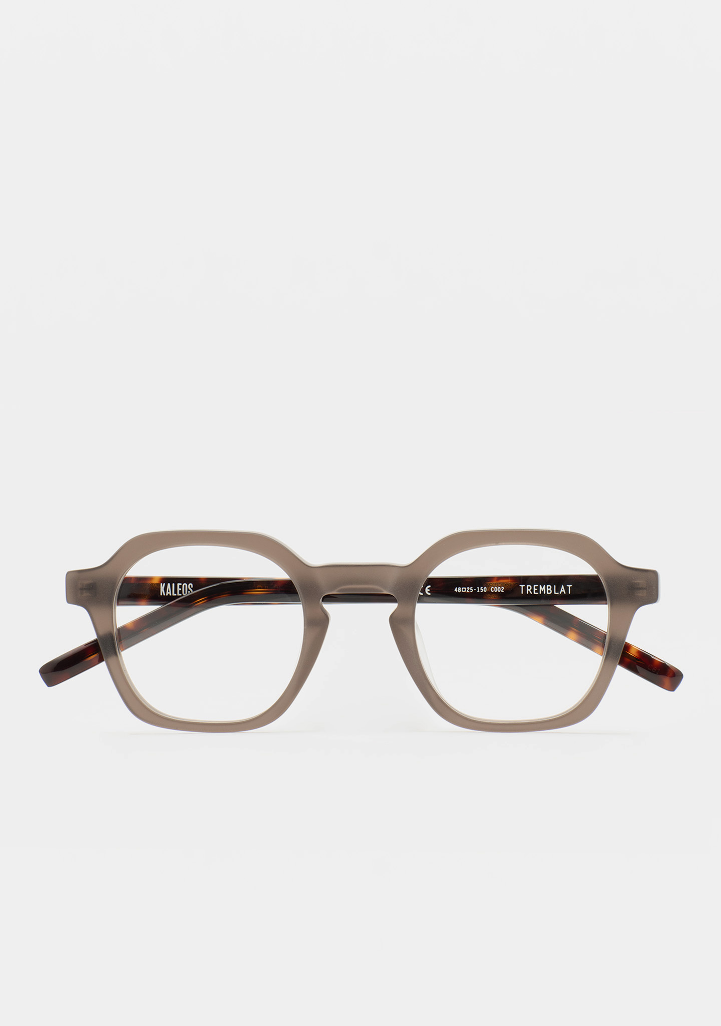 Quadratische Korrekturbrille. Design mit markanten Details. Front aus mattem transparentem hellbraunem Acetat mit dunkelbraunen Havana-Acetatbügeln. Integrierte Acetat-Nasenpads. Handgefertigt.