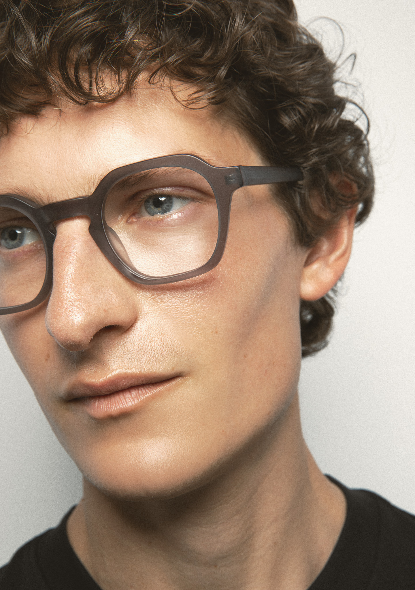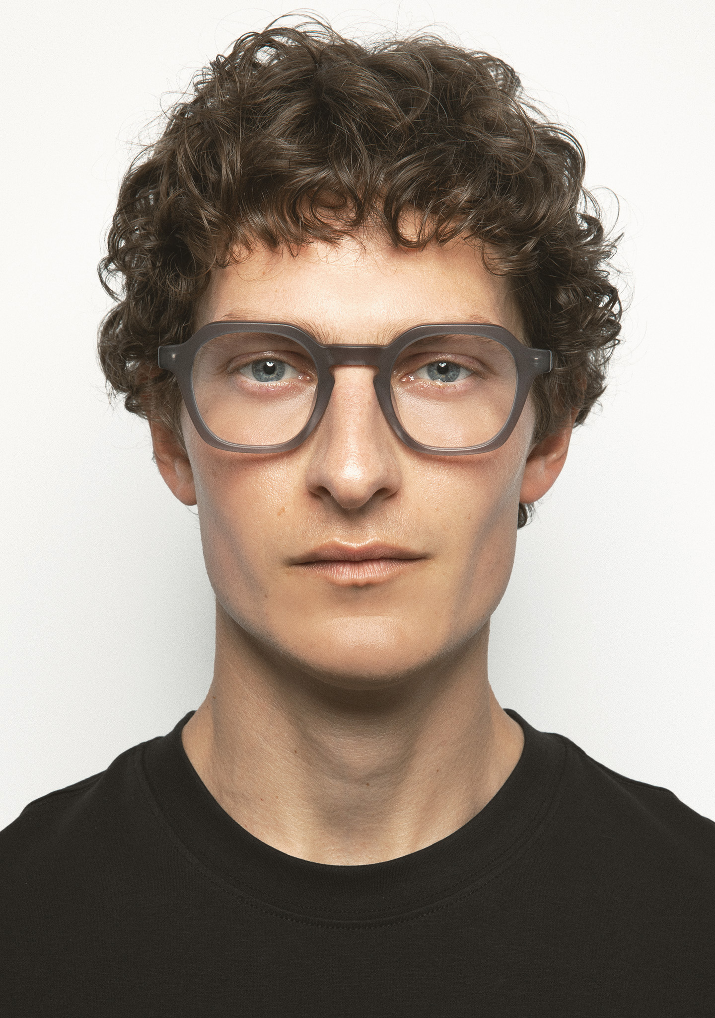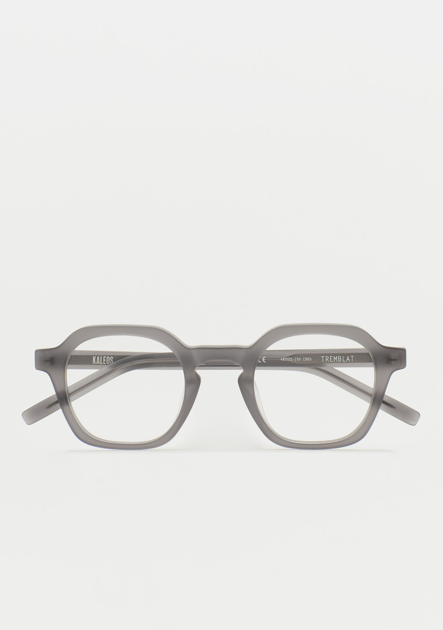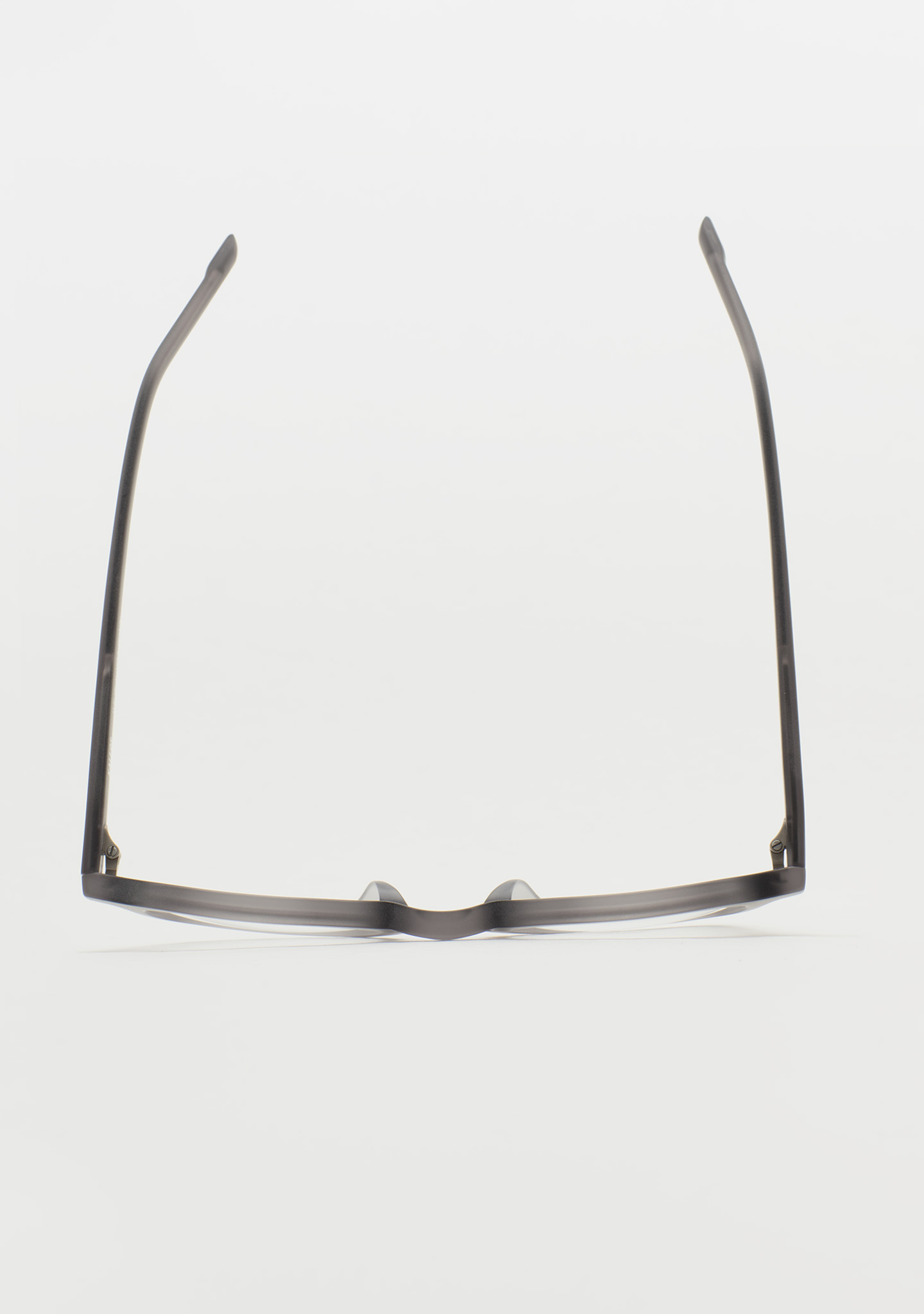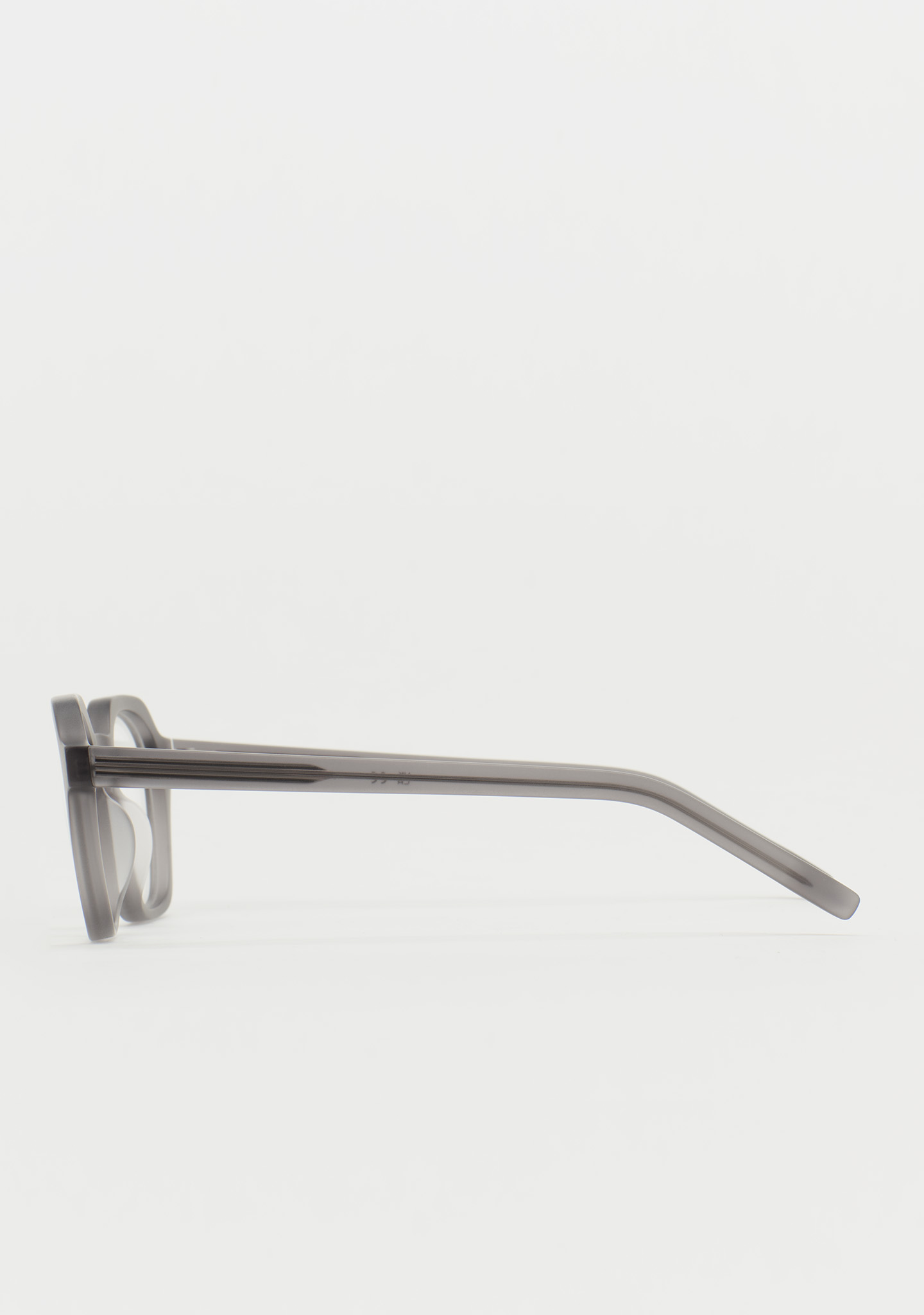Quadratische Korrekturbrille. Design mit markanten Details. Front und Bügel aus mattem transparentem grauem Acetat. Integrierte Acetat-Nasenpads. Handgefertigt.
