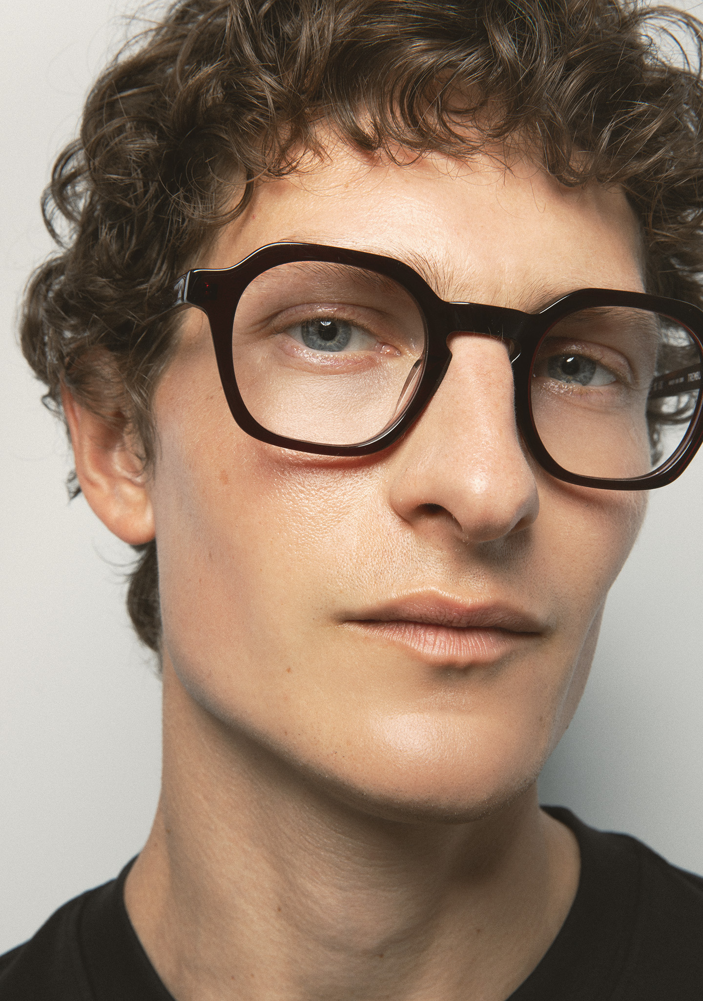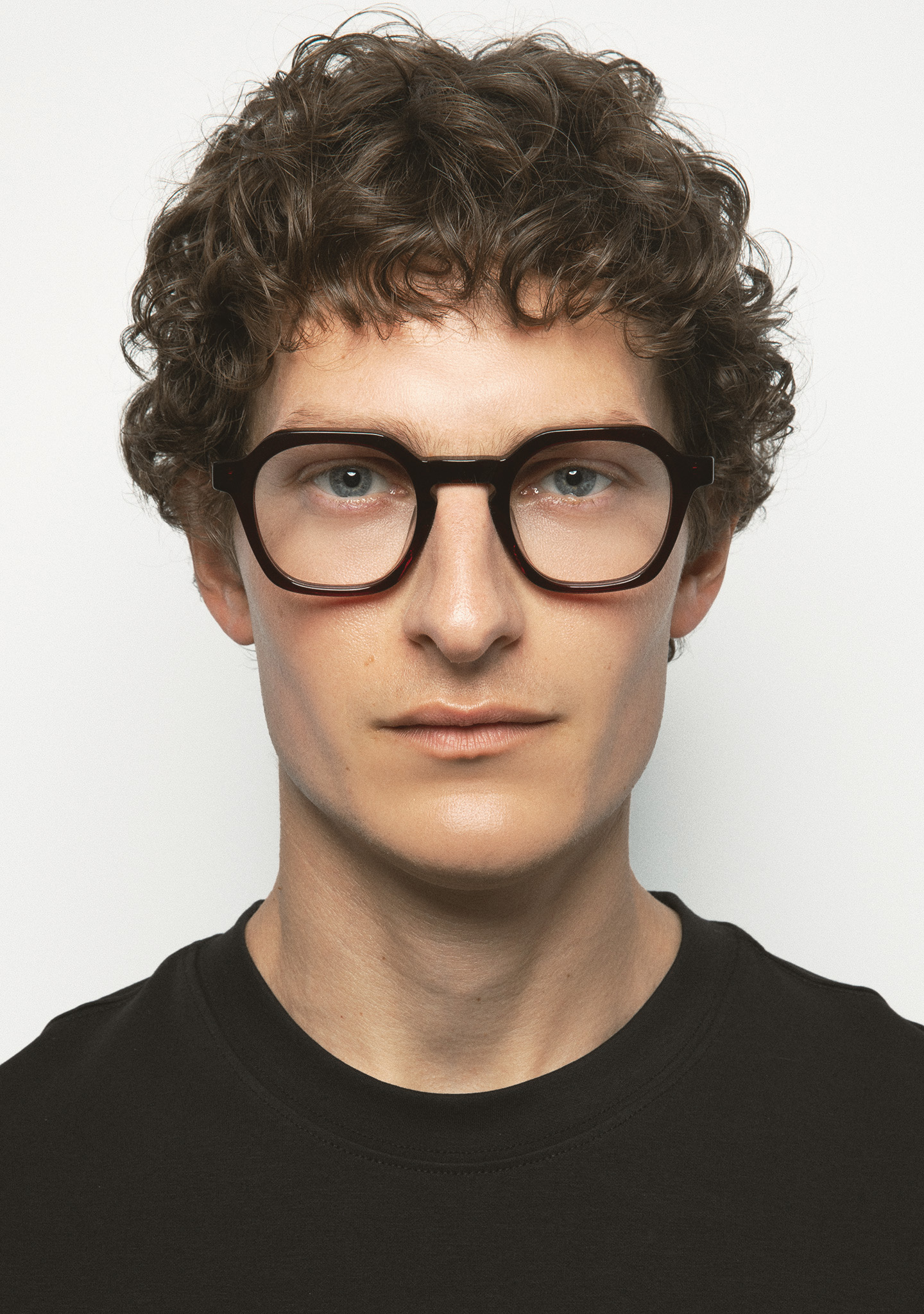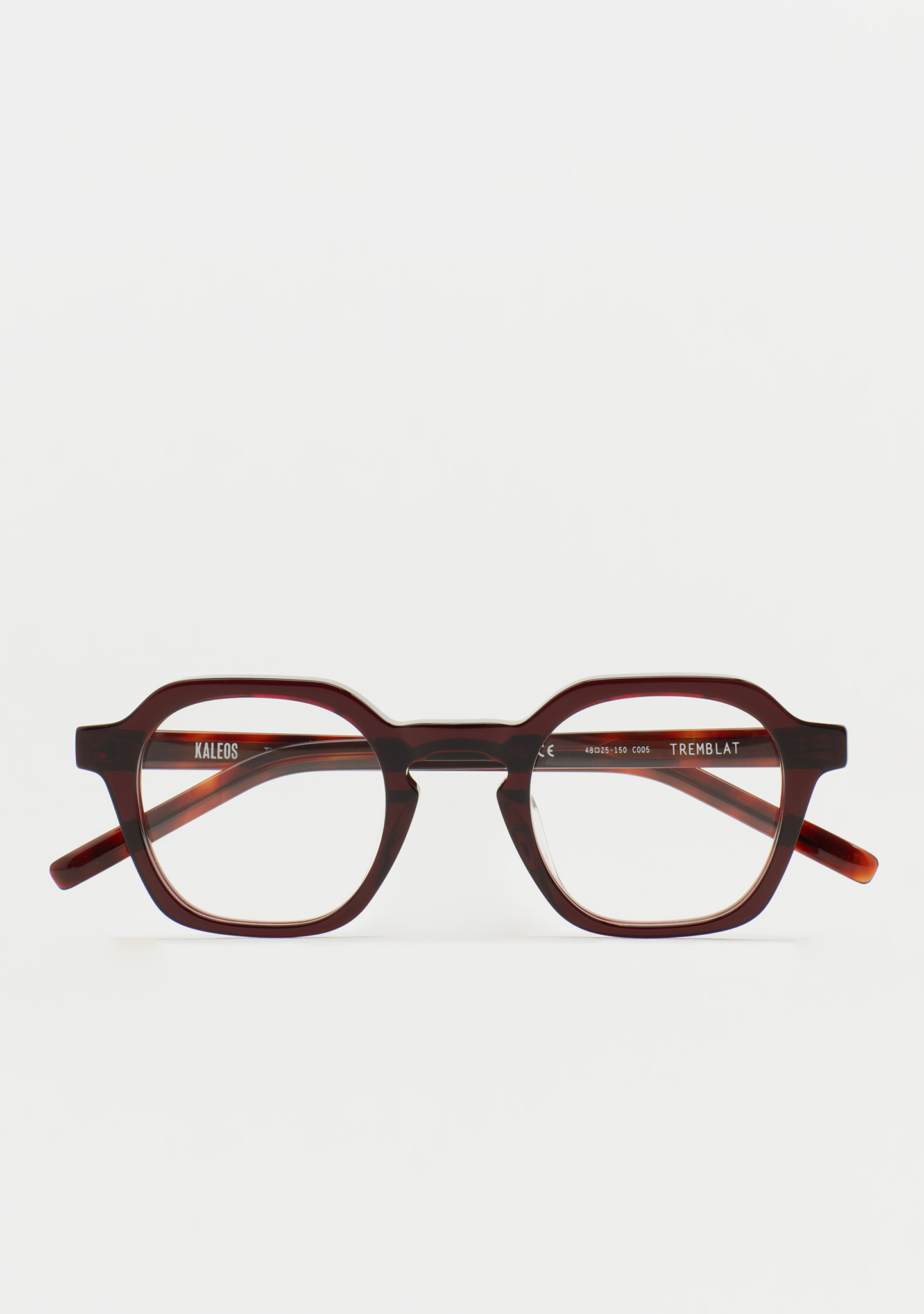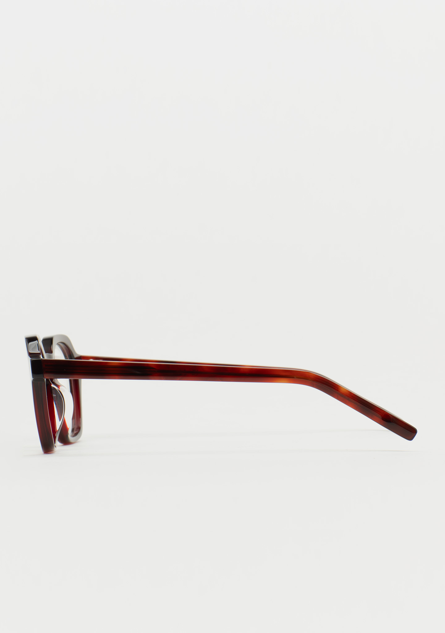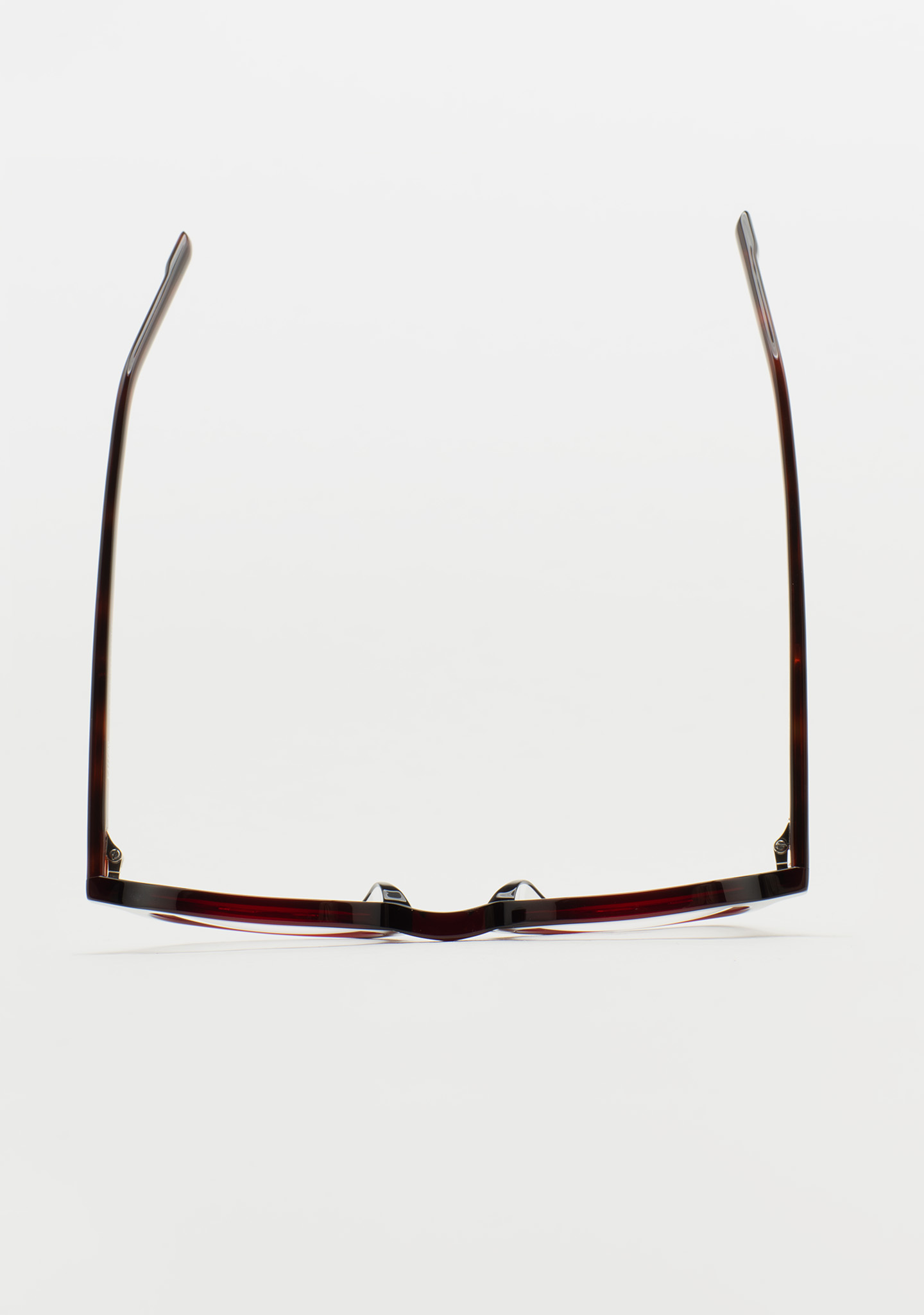 Quadratische Korrekturbrille. Design mit markanten Details. Front aus dunkeltransparentem bordeauxfarbenem Acetat mit dunkelbraunen Havana-Acetatbügeln. Integrierte Acetat-Nasenpads. Handgefertigt.