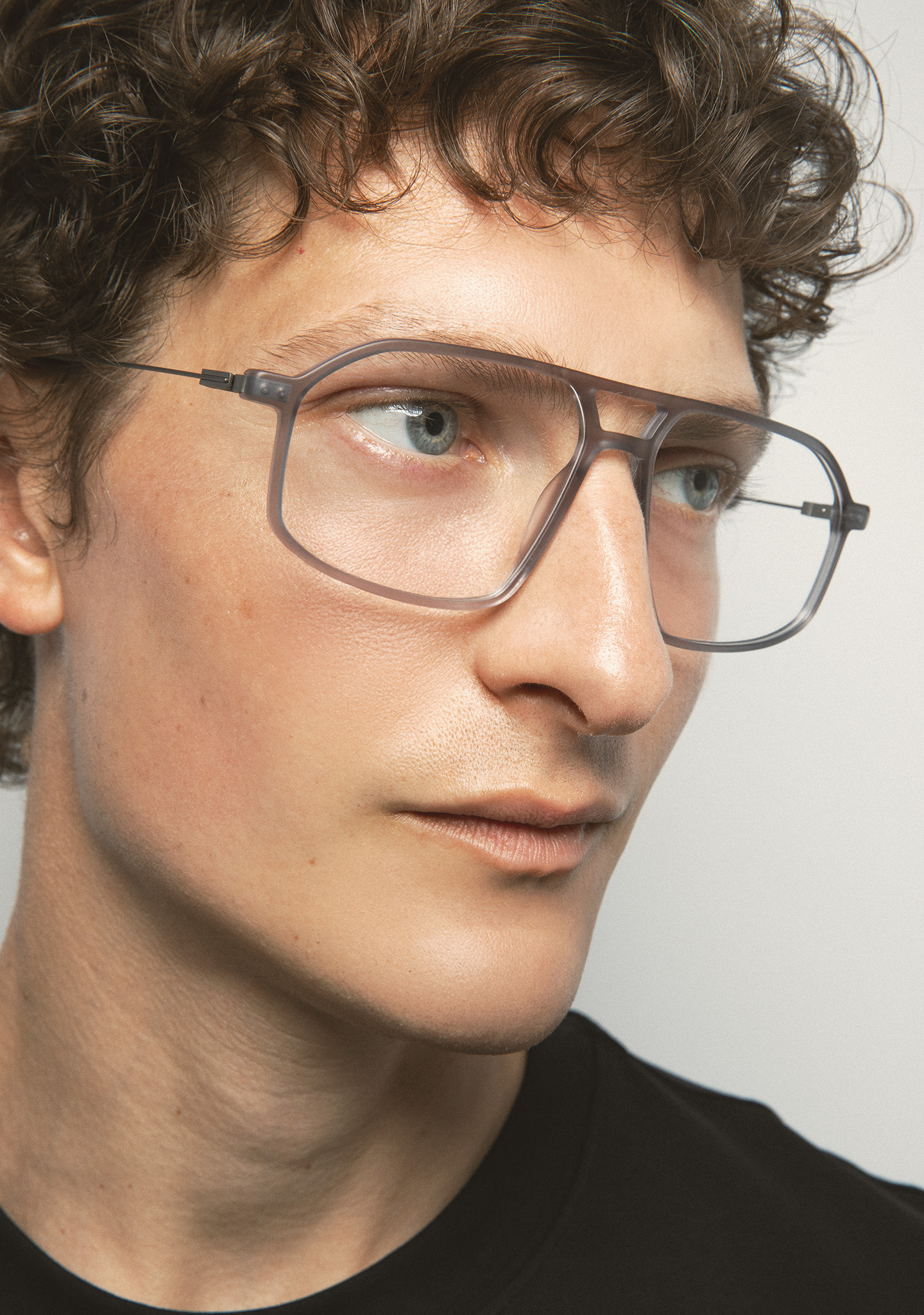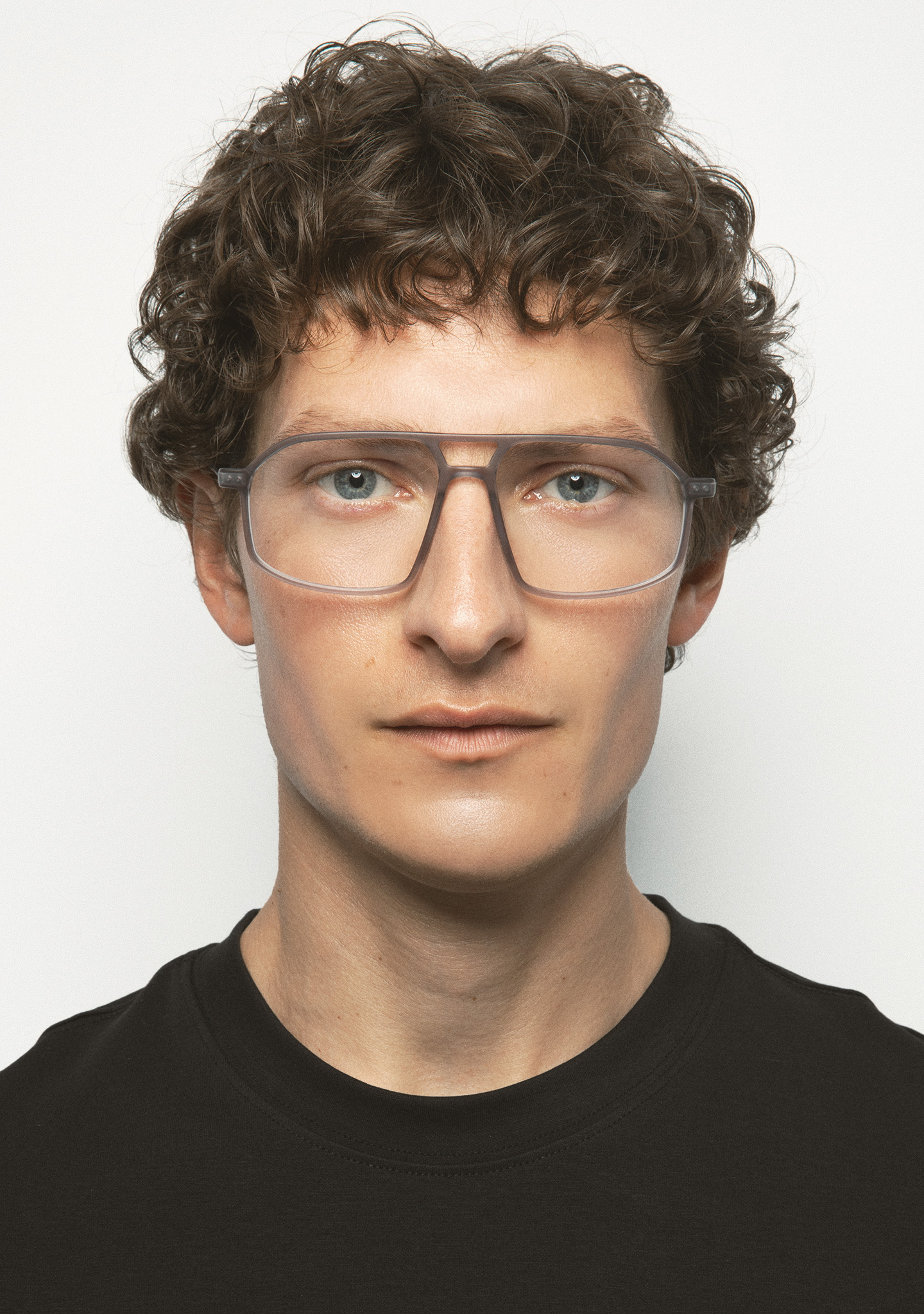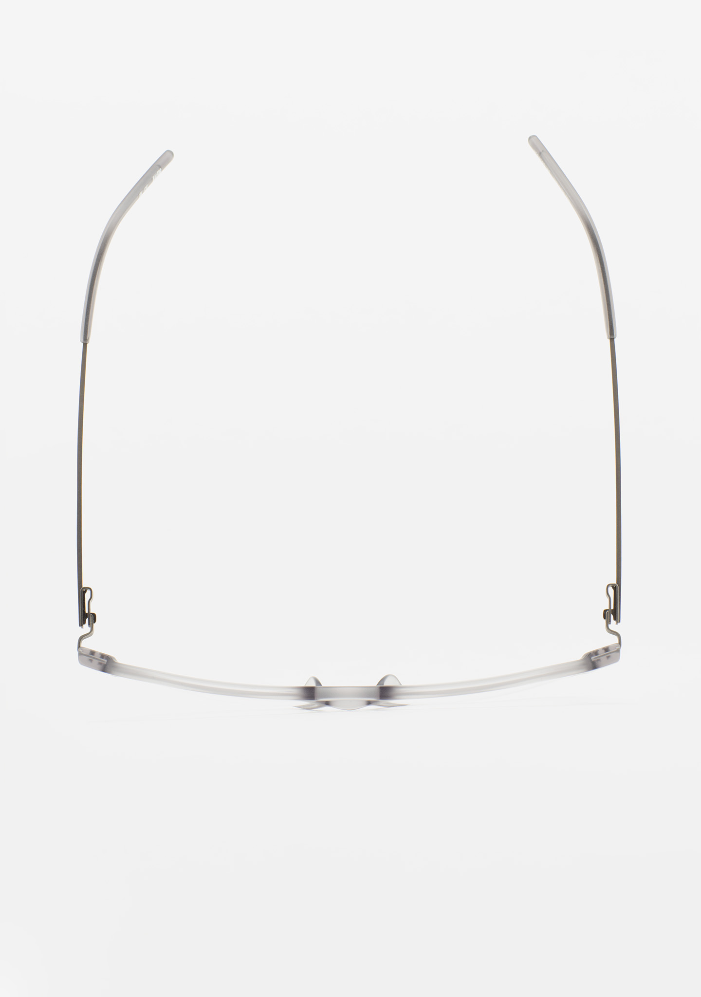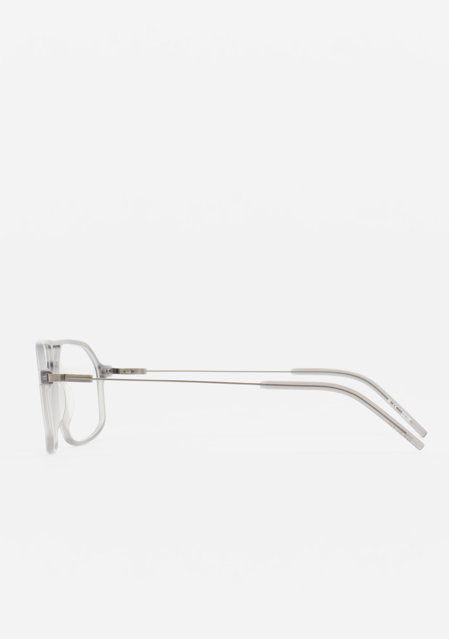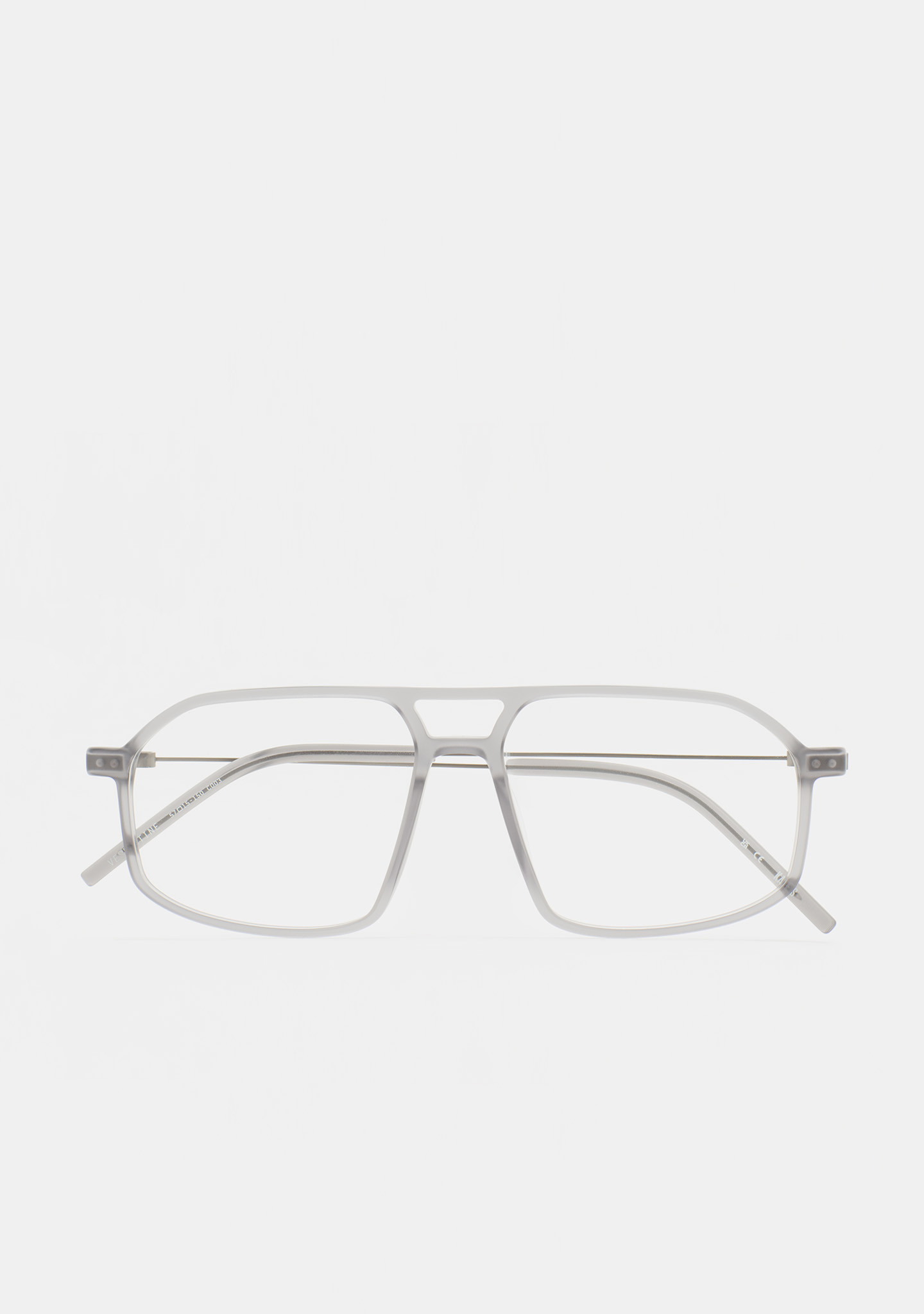 Aviator-Korrekturbrille mit Doppelsteg. Visuelle Architektur für Ihren Blick. Front aus mattem transparentem Kristall-High-Density-Acetat. Bügel aus matt dunkelgrauem Edelstahl mit transparenten Kristall-Acetat-Enden. Neue schraubenlose Scharnierkonstruktion. Integrierte Acetat-Nasenpads. Handgefertigt. Erhältlich in zwei Größen: mittel (M) und groß (L).