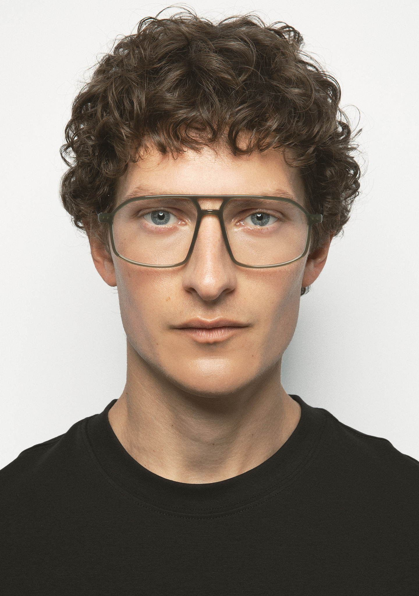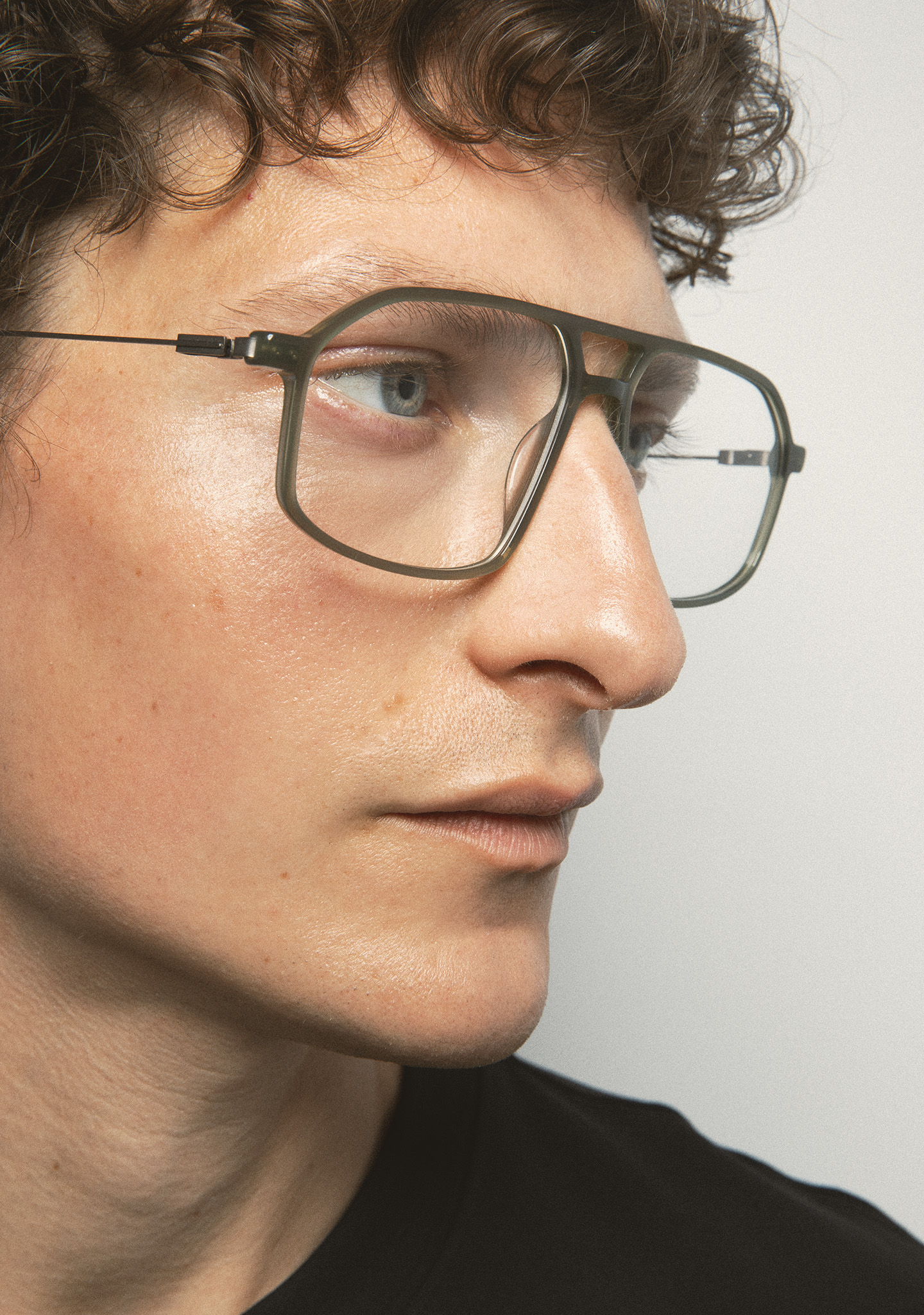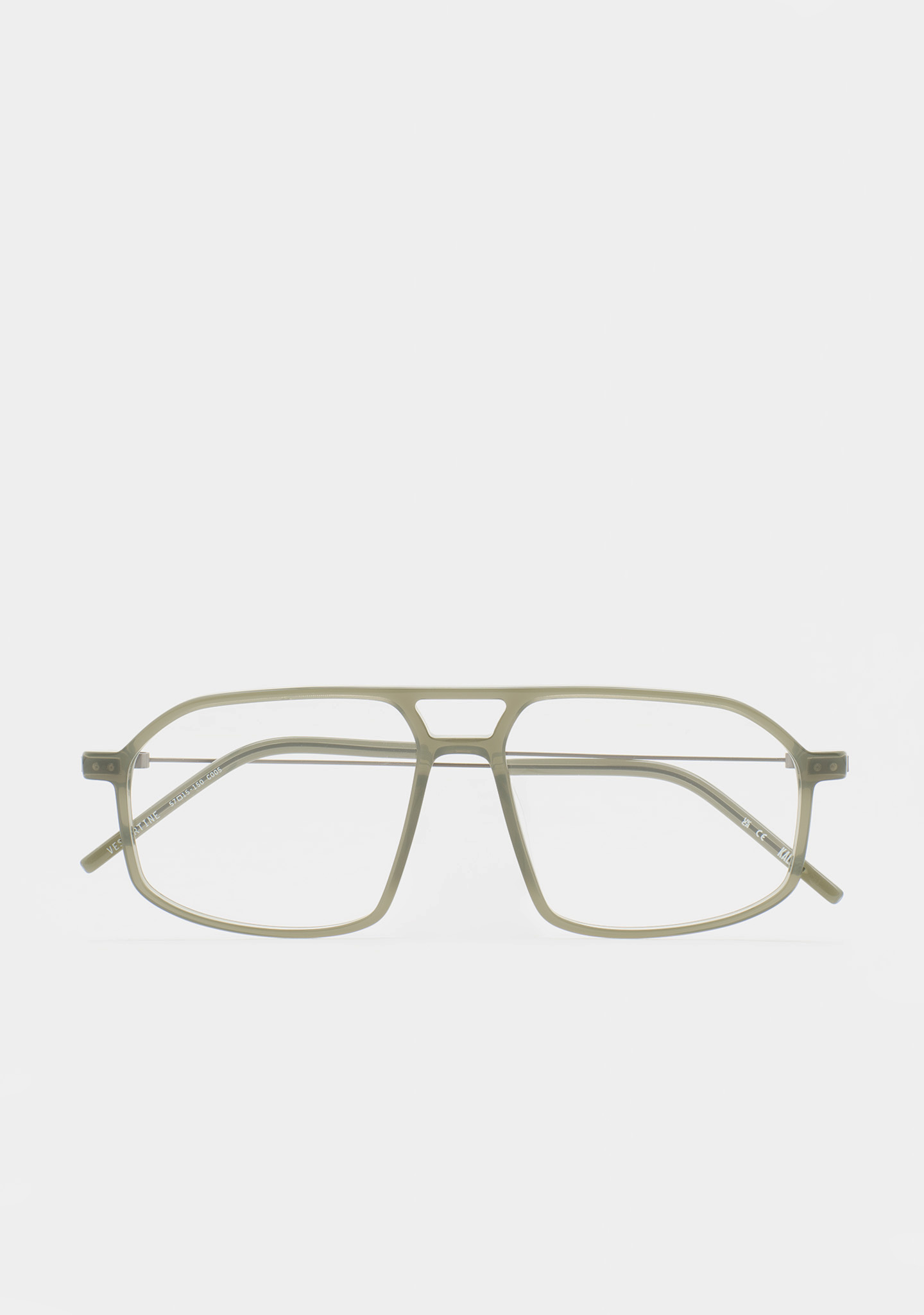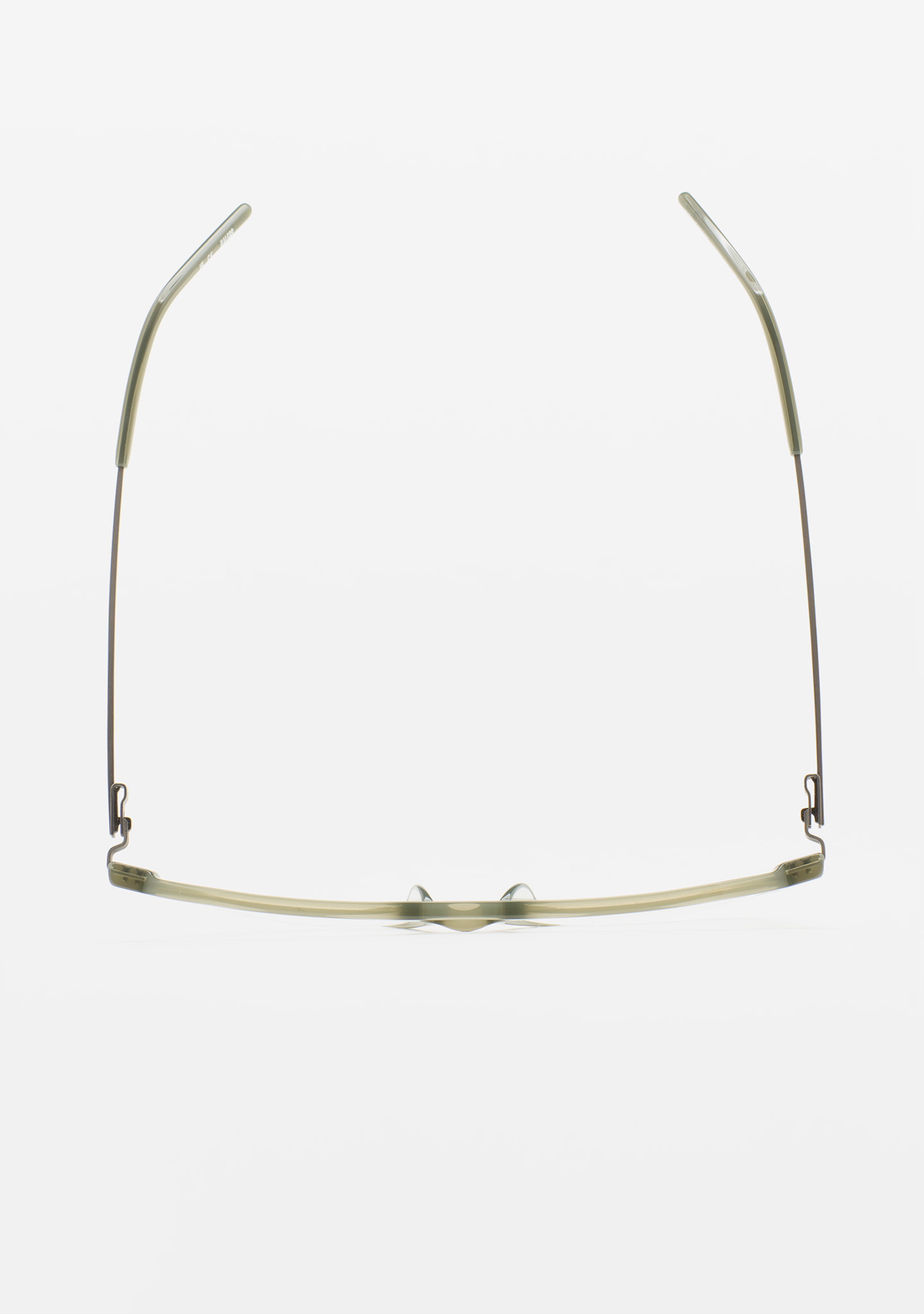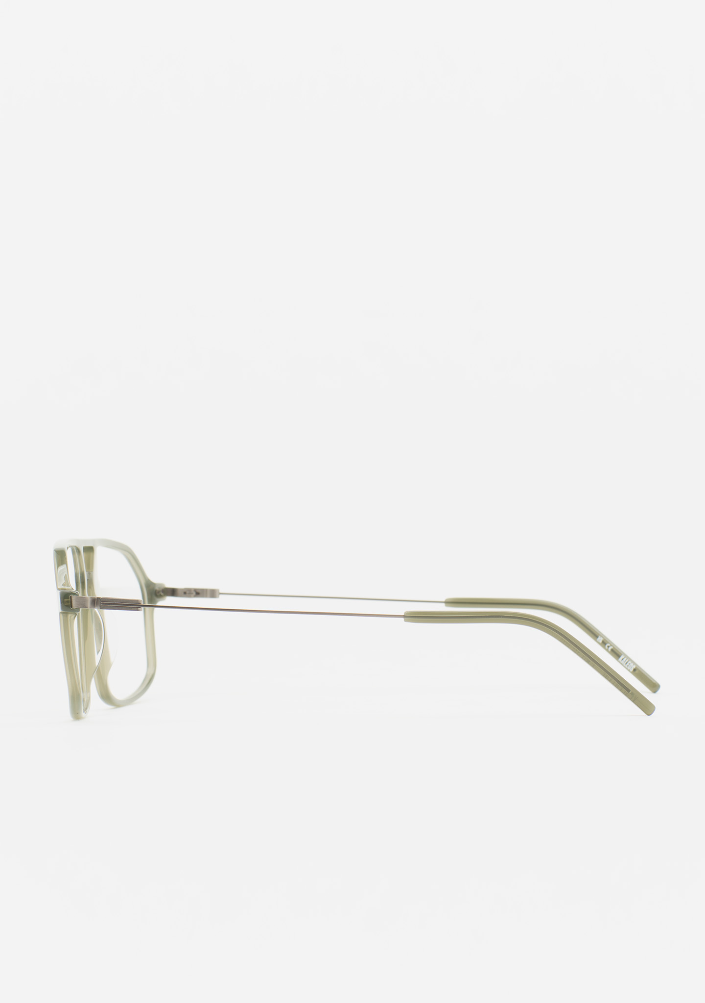 Aviator-Korrekturbrille mit Doppelsteg. Visuelle Architektur für Ihren Blick. Front aus transluzentem grünem High-Density-Acetat. Bügel aus matt dunkelgrauem Edelstahl mit transluzenten grünen Acetat-Enden. Neue schraubenlose Scharnierkonstruktion. Integrierte Acetat-Nasenpads. Handgefertigt. Erhältlich in zwei Größen: mittel (M) und groß (L).