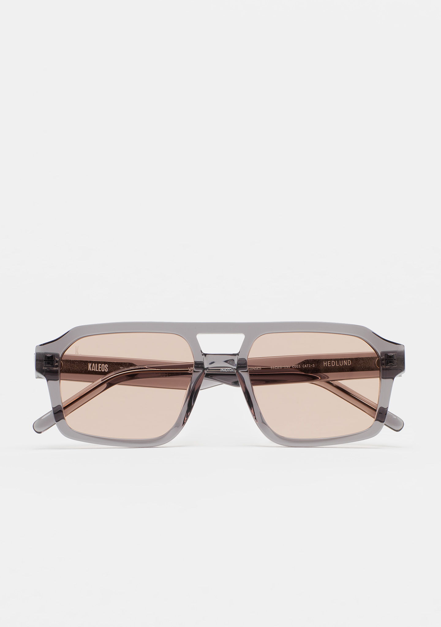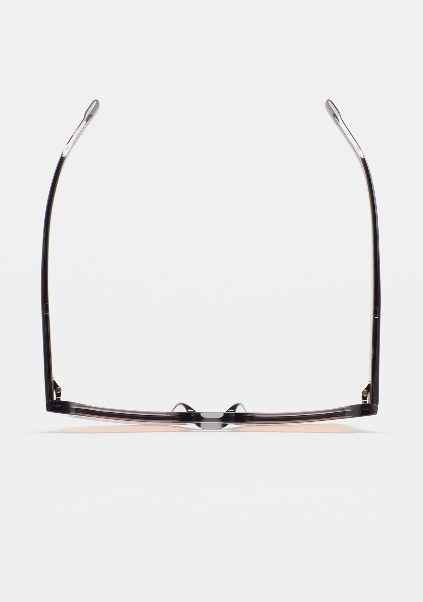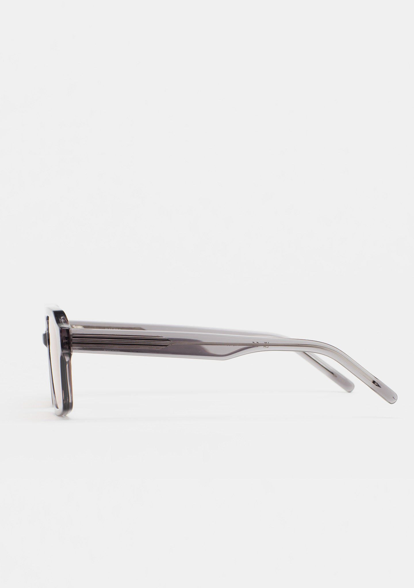 Sonnenbrille in rechteckiger Form mit Doppelsteg. Front und Bügel aus transparentem grauem Acetat. Braune, fototrope Gläser Basis 2 mit UV-Schutz und Antireflexbeschichtung. Kategorie 1-3. Integrierte Acetat-Nasenpads. Handgefertigt.