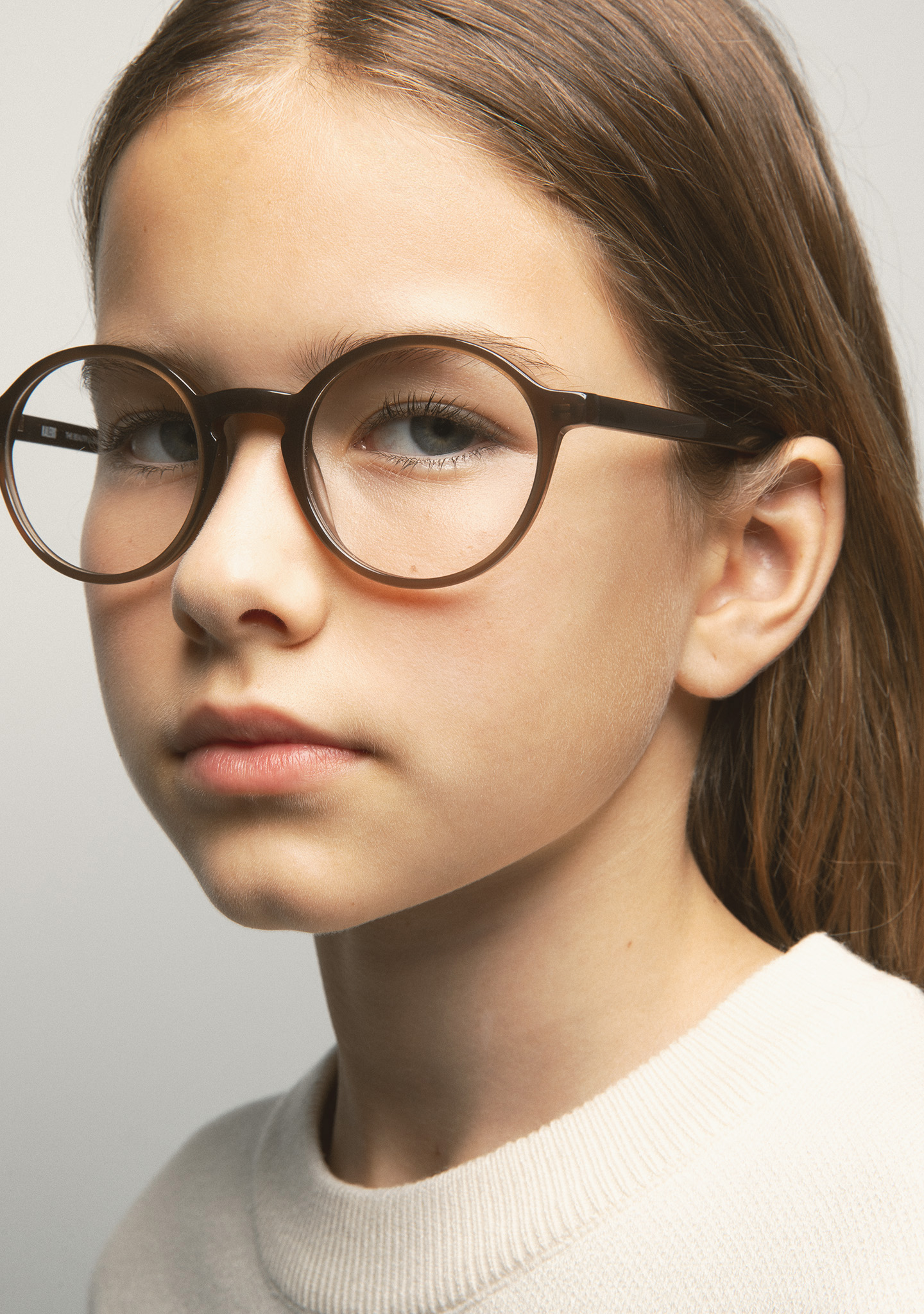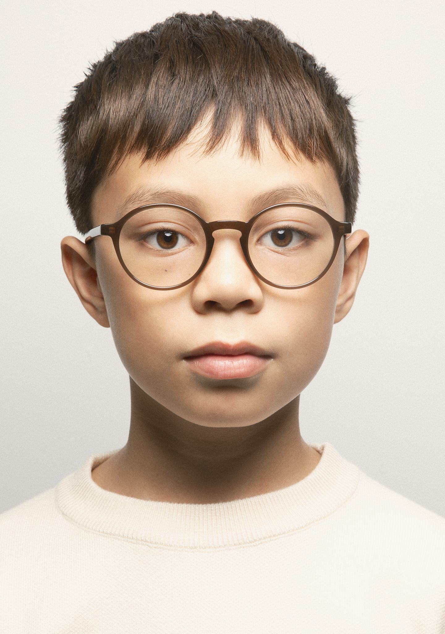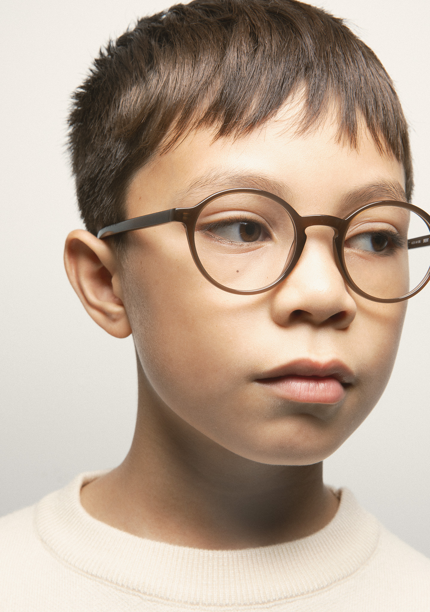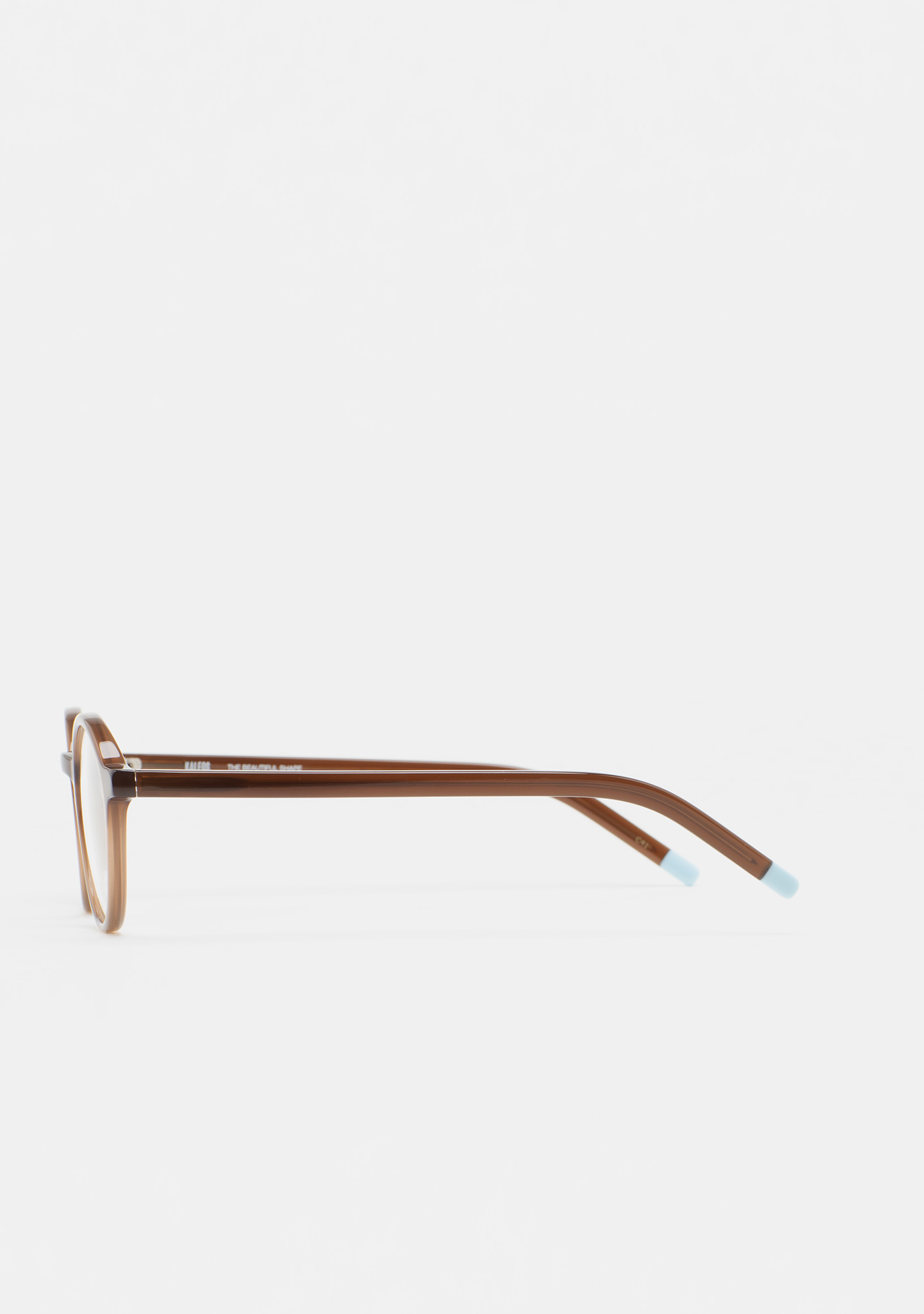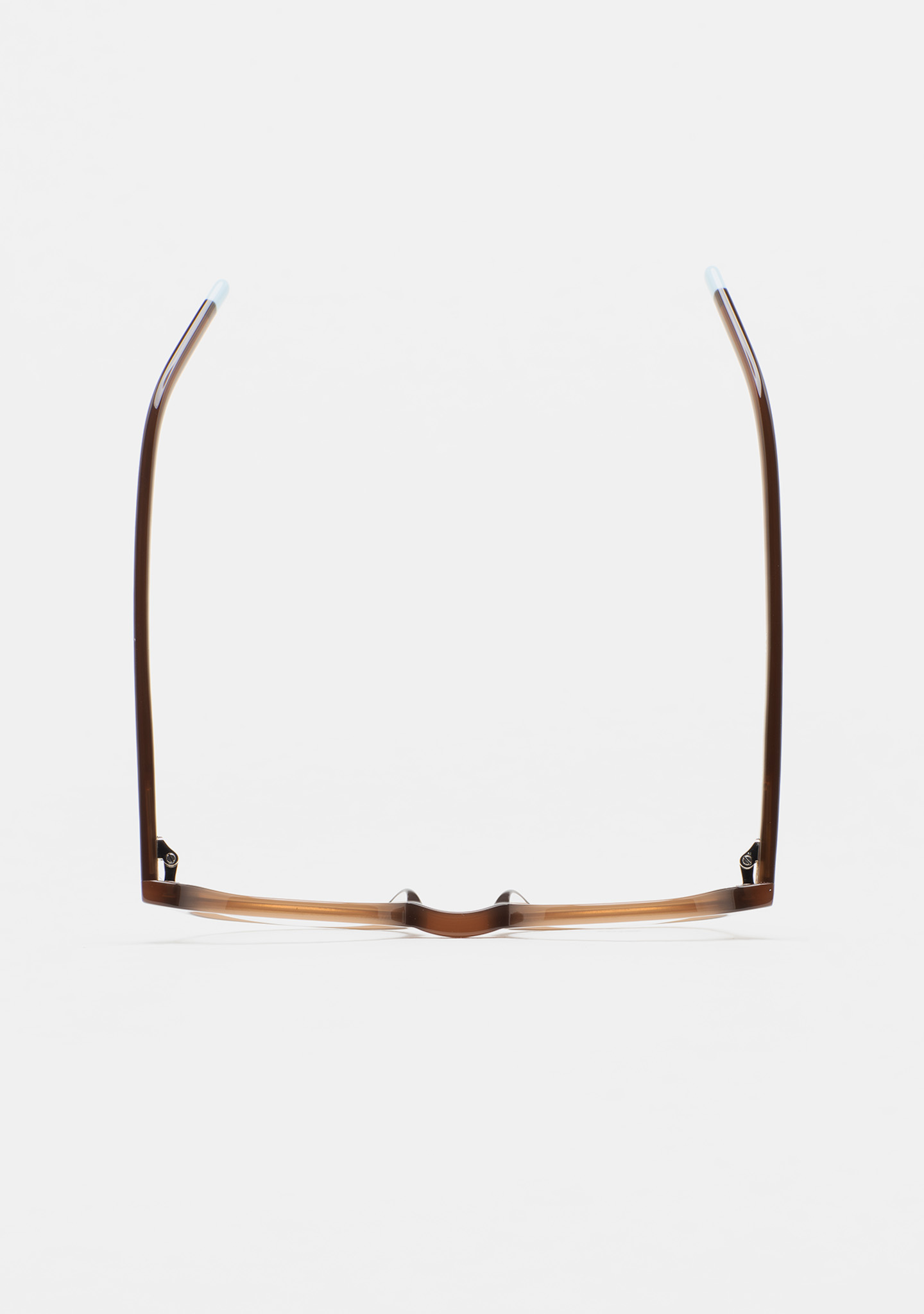 KIDS Sehbrille in Pantos-Form. Front und Bügel aus transparentem braunem Azetat. Bügelenden in Hellblau. Integrierte Stegplättchen aus Azetat. Handgefertigt.