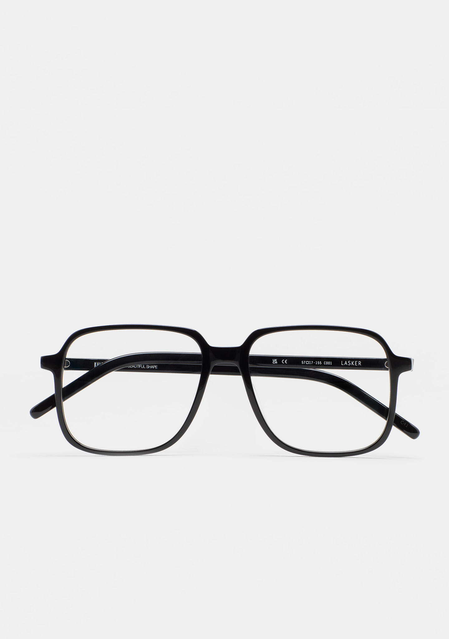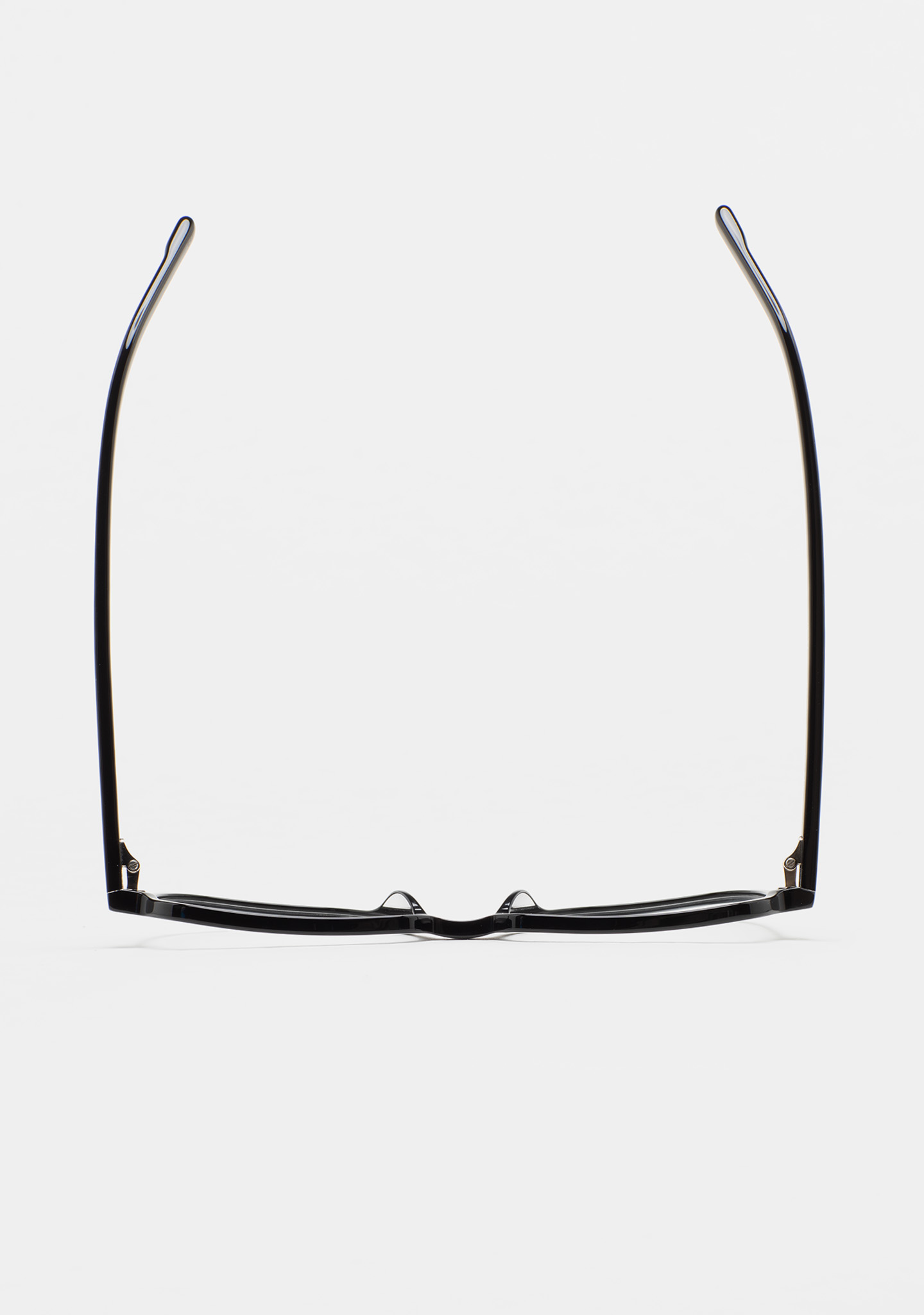 Sehhilfe in quadratischer Form. Front und Bügel aus schwarzem High-Density-Acetat. Integrierte Acetat-Nasenpads. Handgefertigt.
