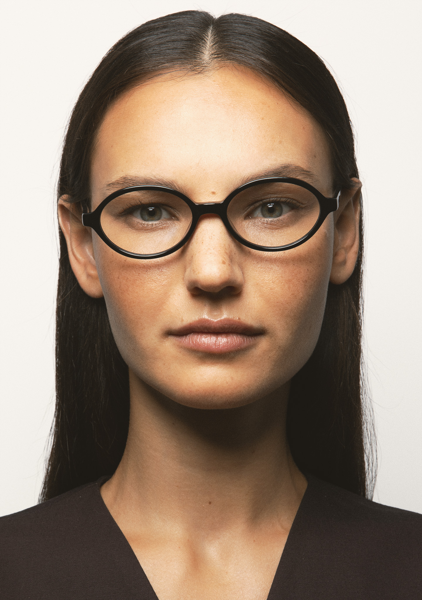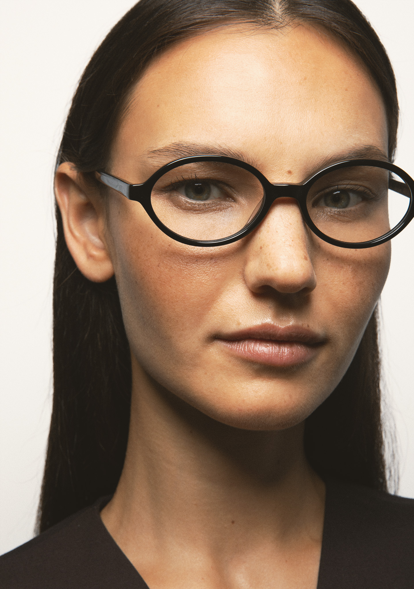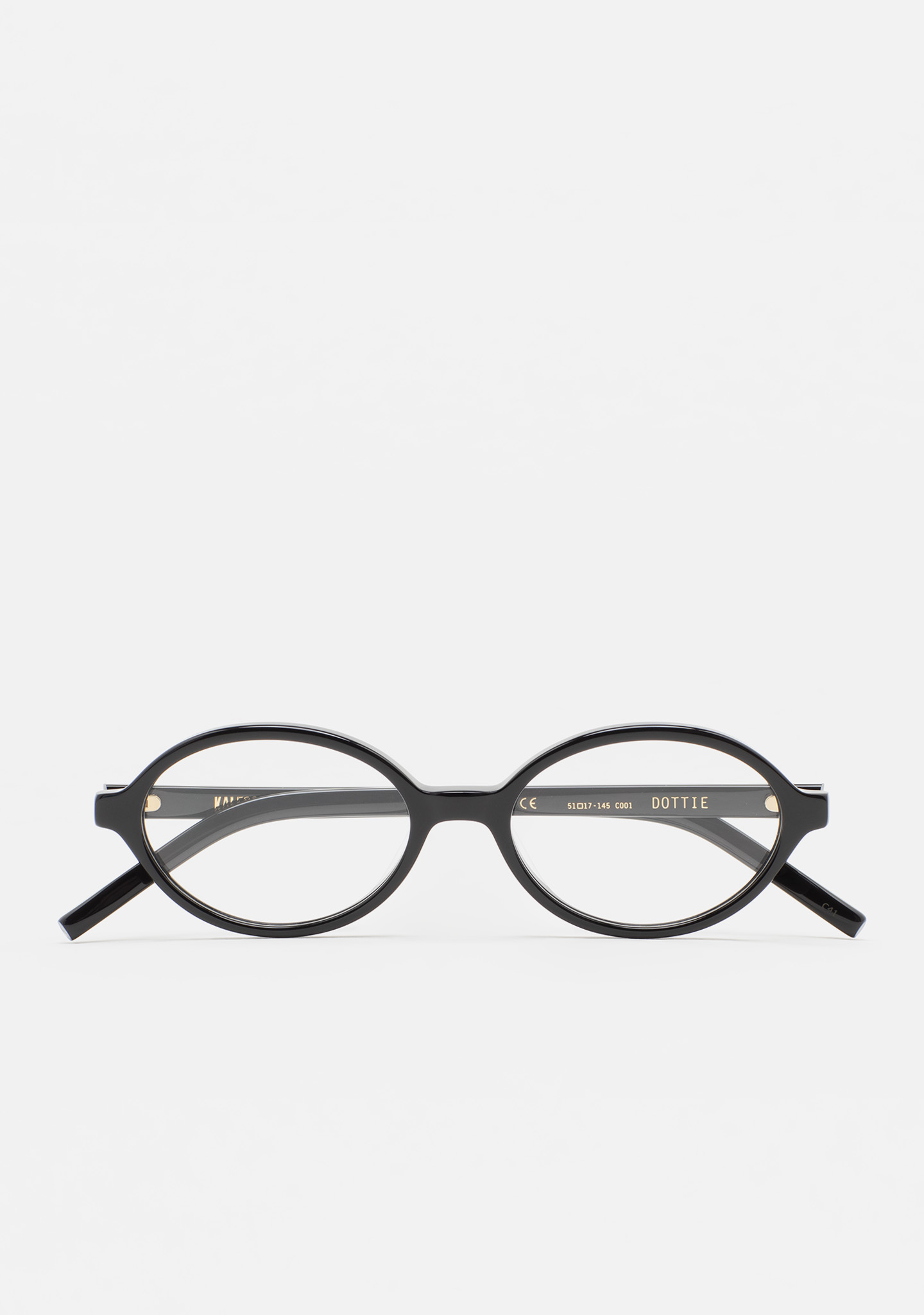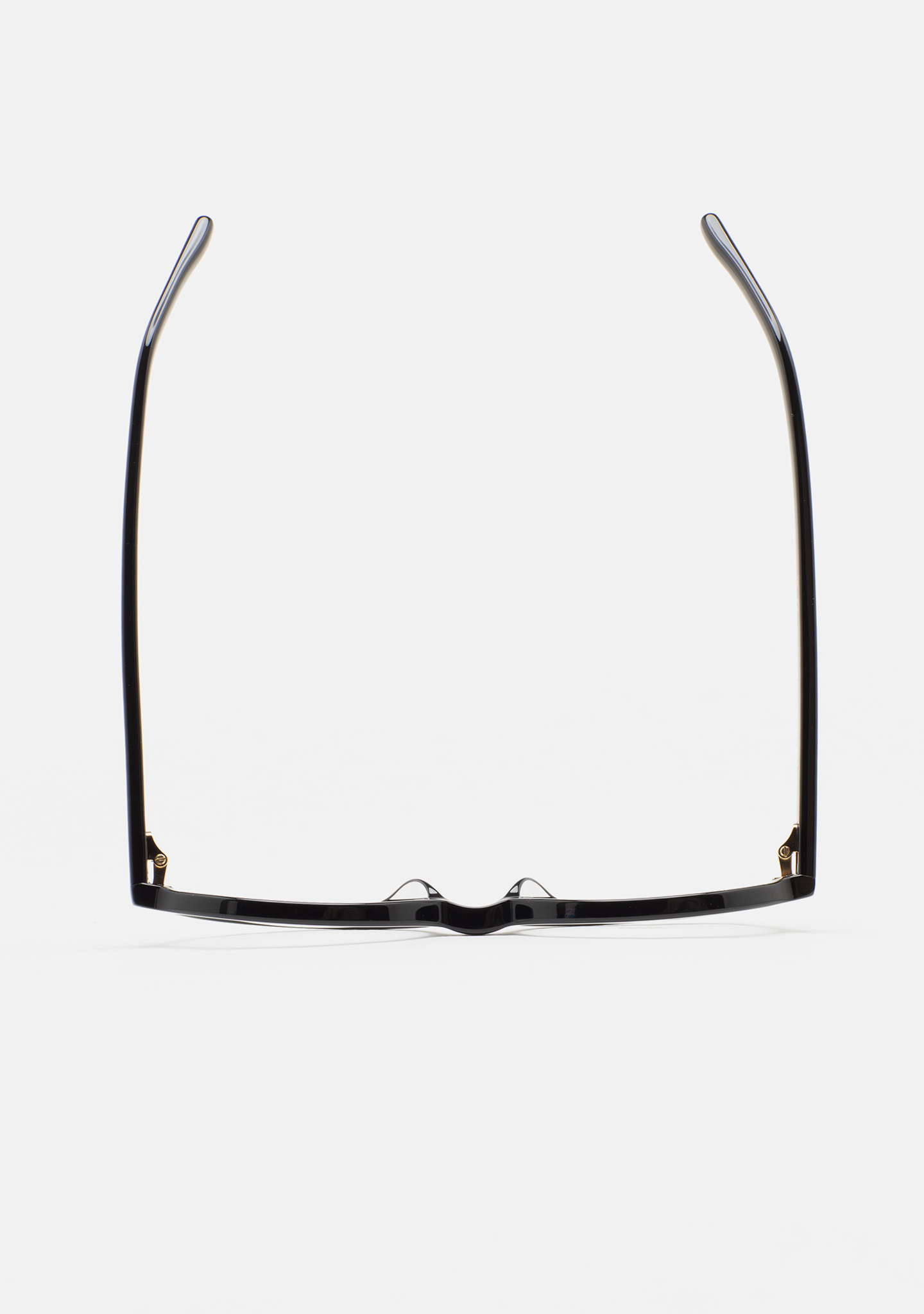 Ovale Brille. Front und Bügel aus schwarzem Acetat. Integrierte Acetat-Nasenpads. Handgefertigt.