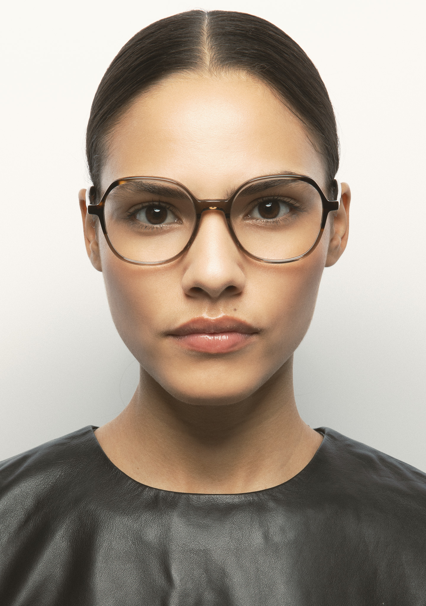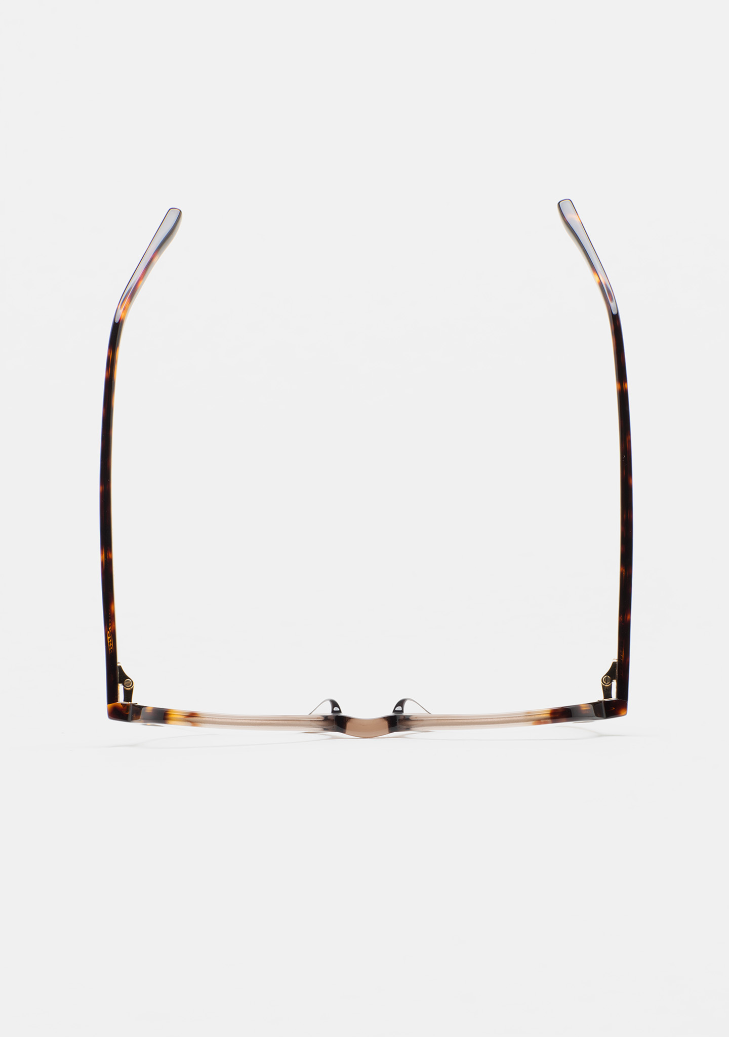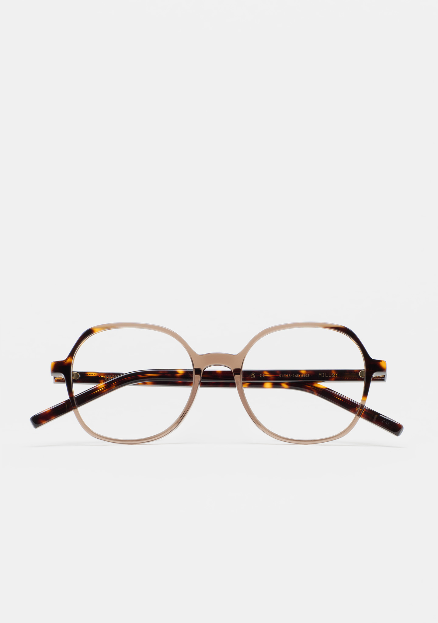 Sehhilfe in runder Form. Vorderseite aus High-Density transluzentem hellbraunem Acetat mit dunkelbraunem havanna Laminat. Bügel aus High-Density dunkelbraunem havanna Acetat. Integrierte Acetat-Nasenpads. Handgefertigt.