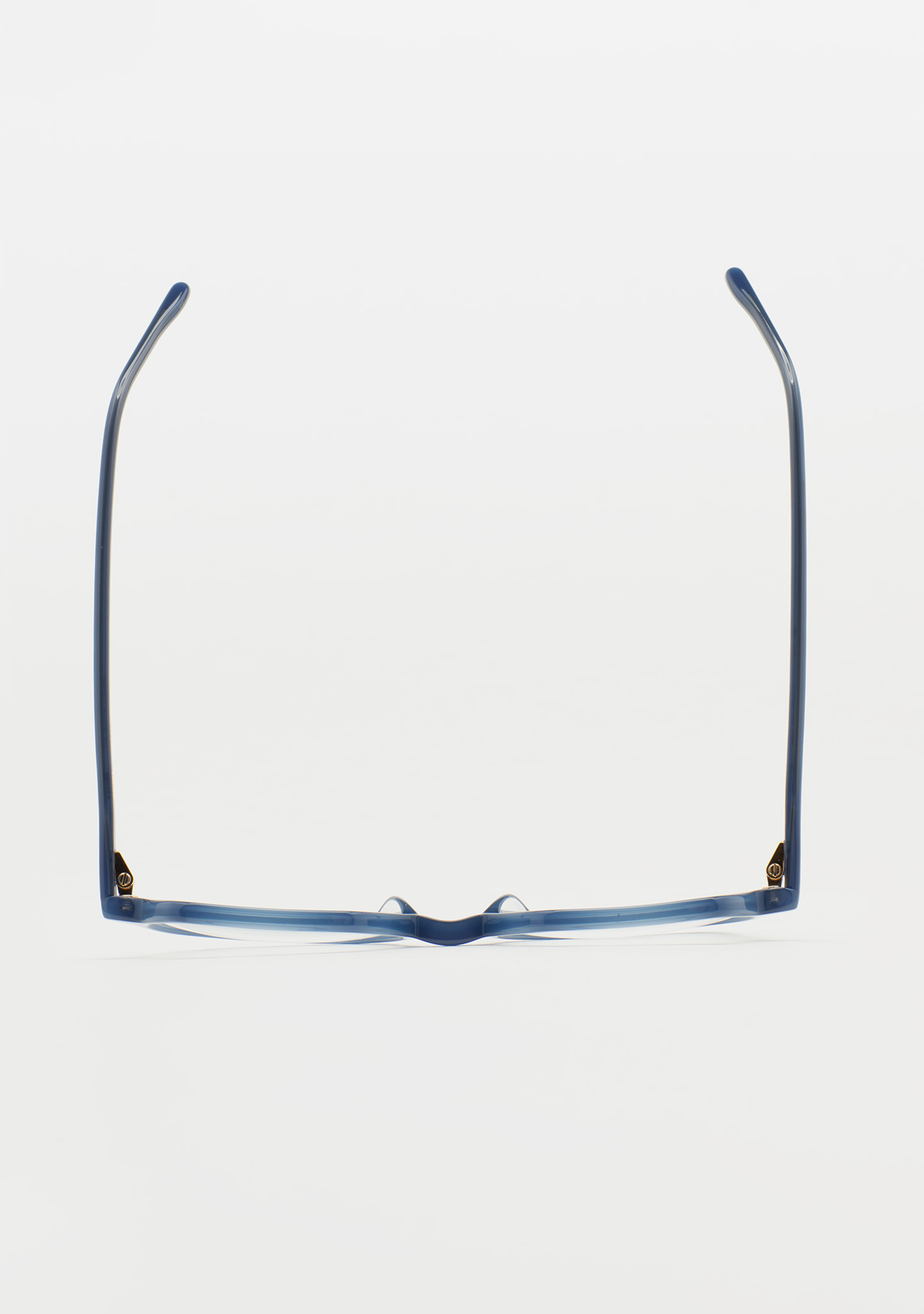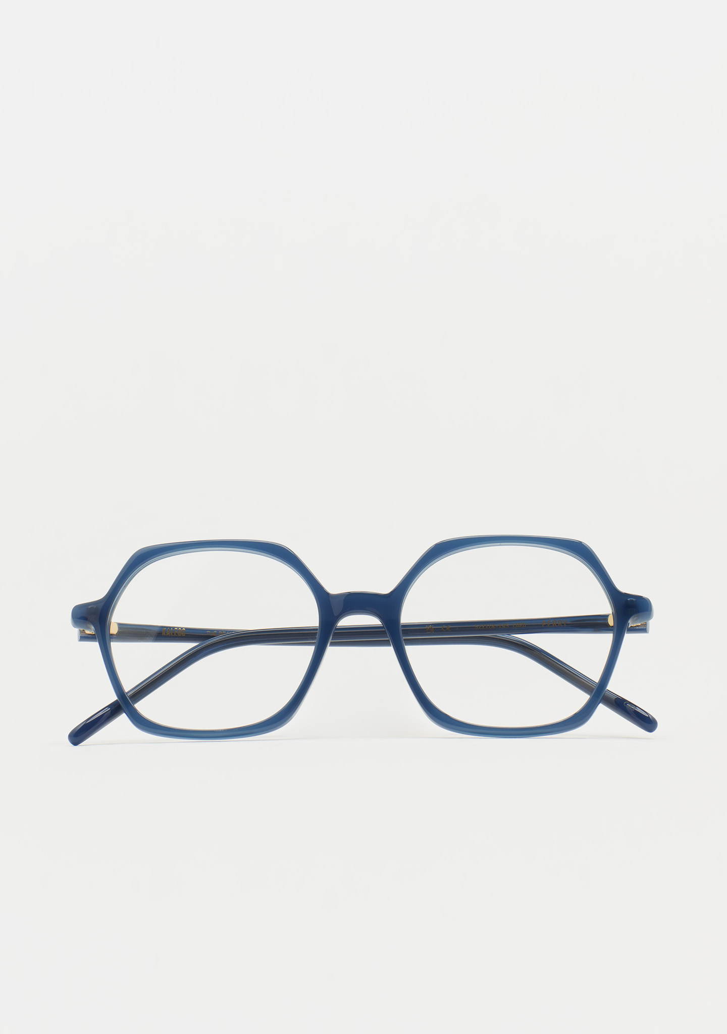 Sechseckige Korrektionsbrille. Minimalismus, der nicht unbemerkt bleibt. Front und Bügel aus transluzentem blauem Acetat. Integrierte Nasenpads aus Acetat. Handgefertigt.