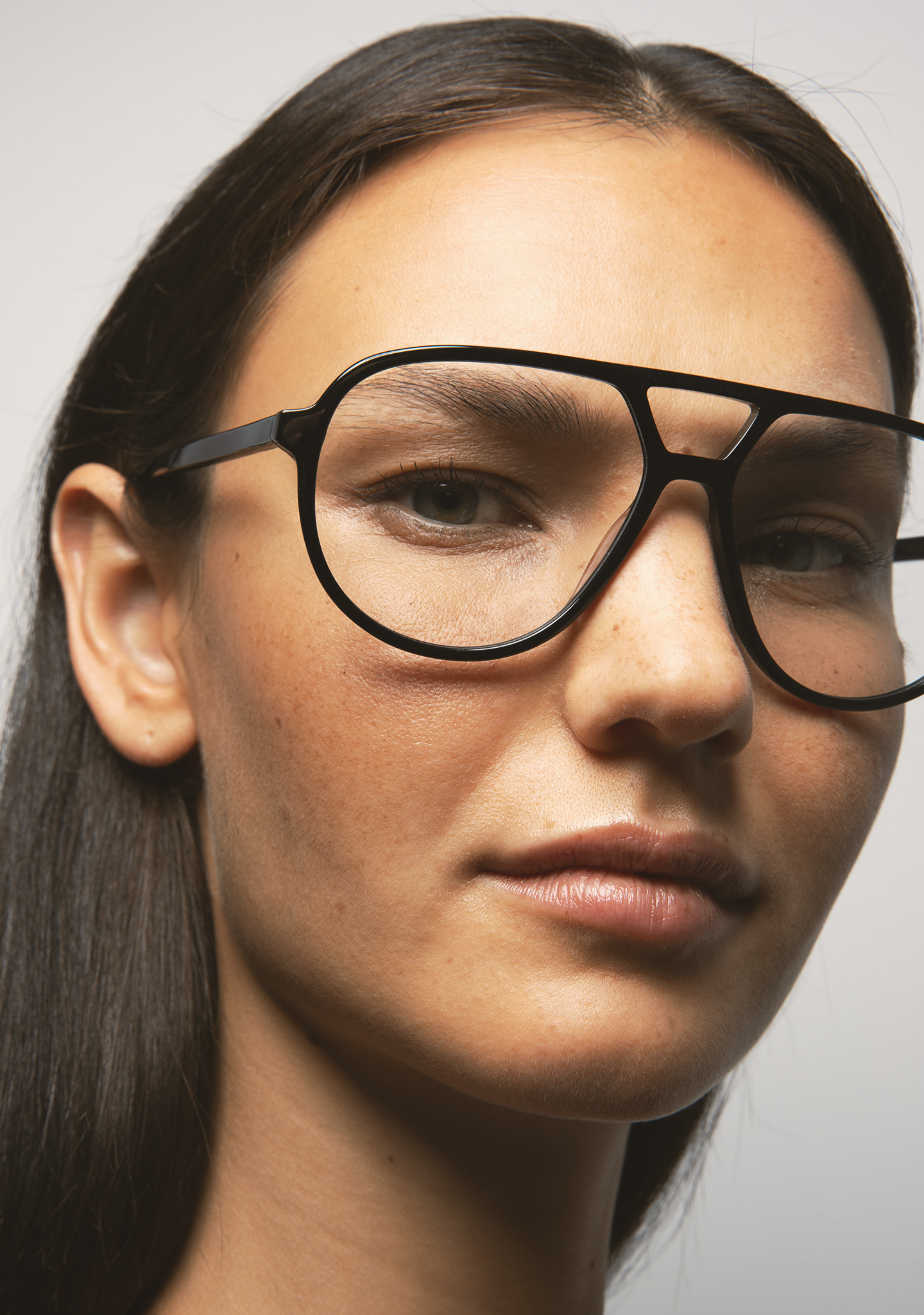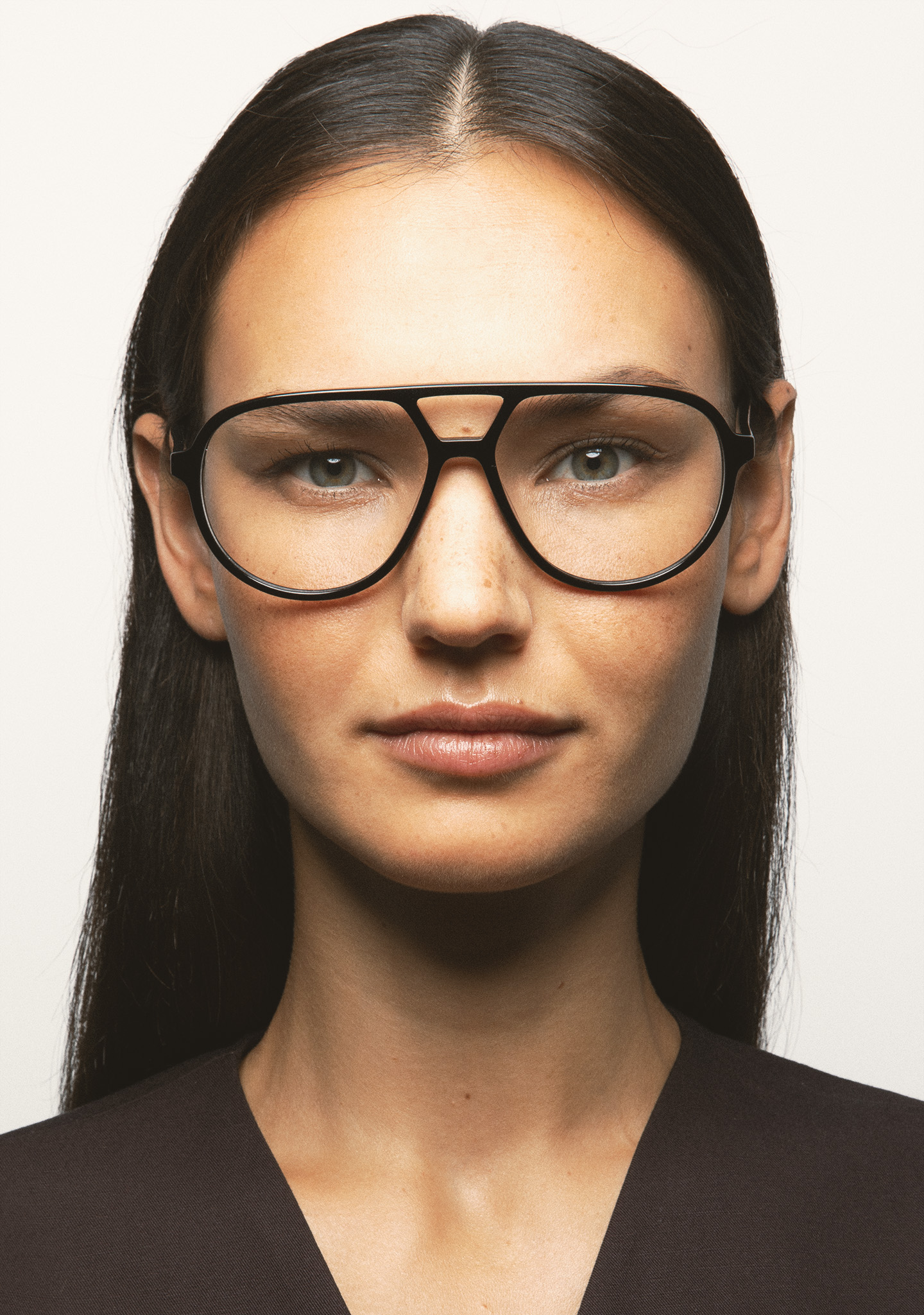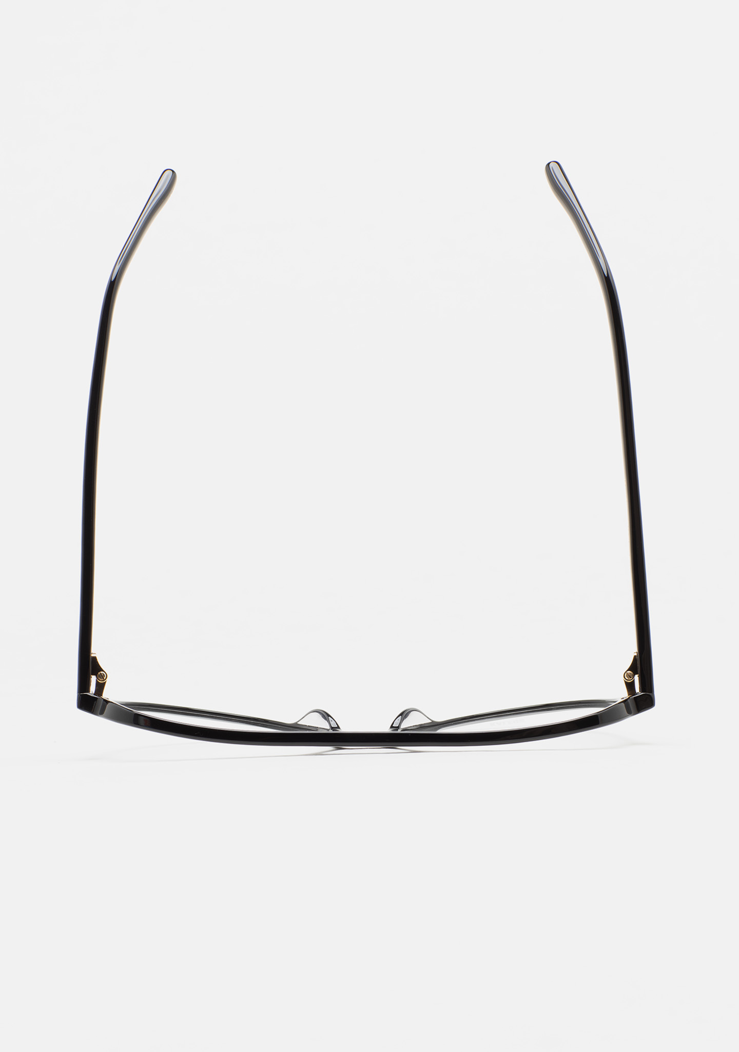 Pilotenförmige Sehhilfe mit Doppelsteg. Vorderseite und Bügel aus High-Density schwarzem Acetat. Integrierte Acetat-Nasenpads. Handgefertigt.