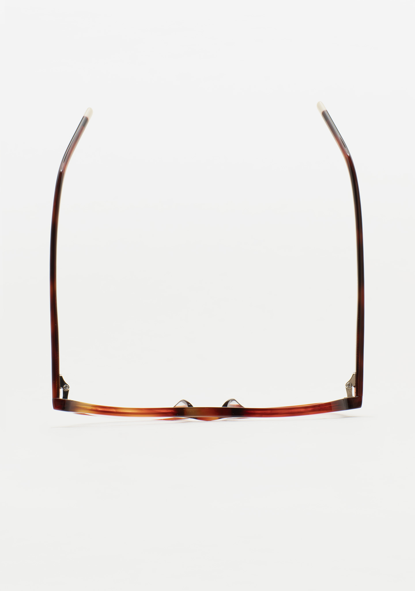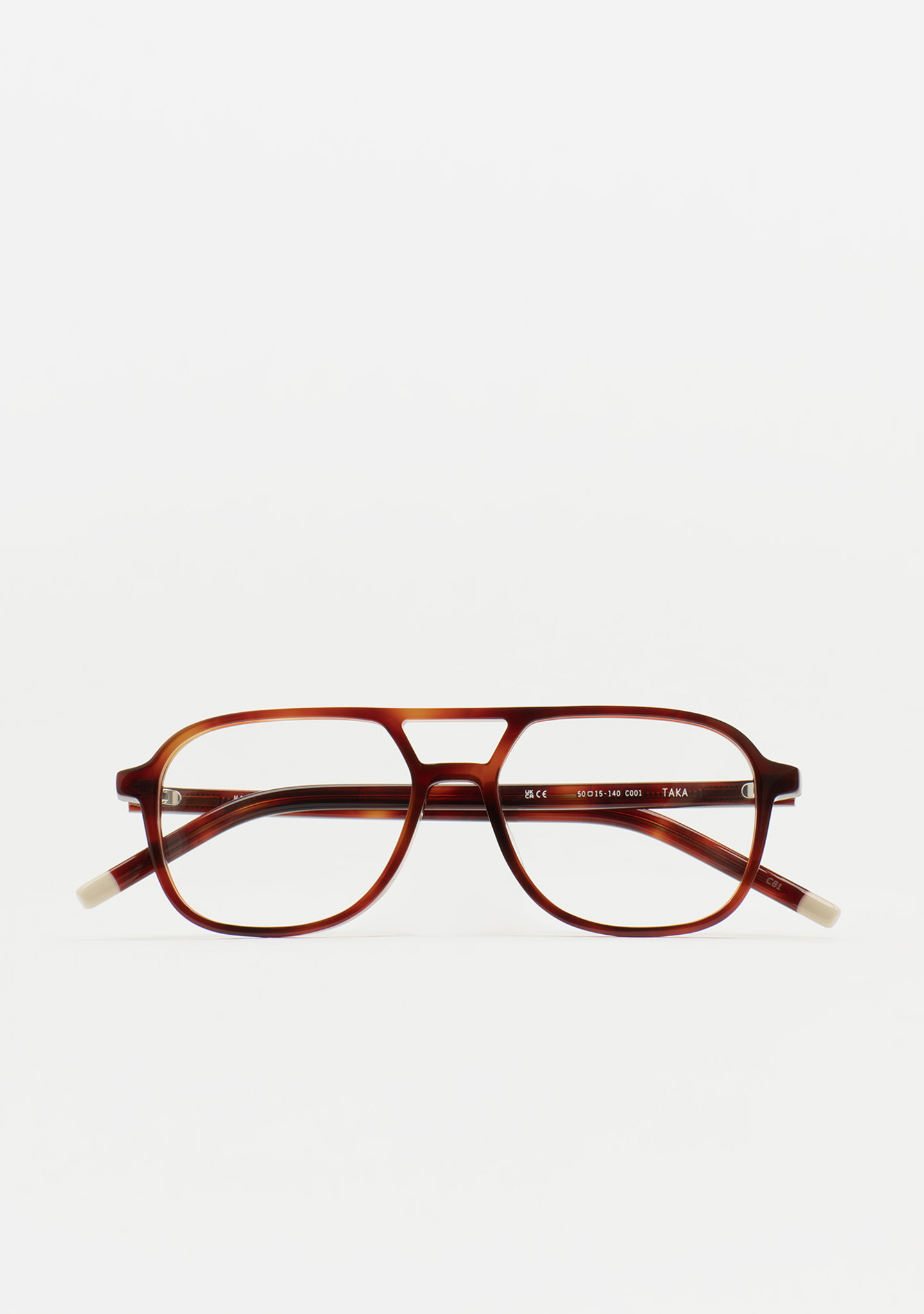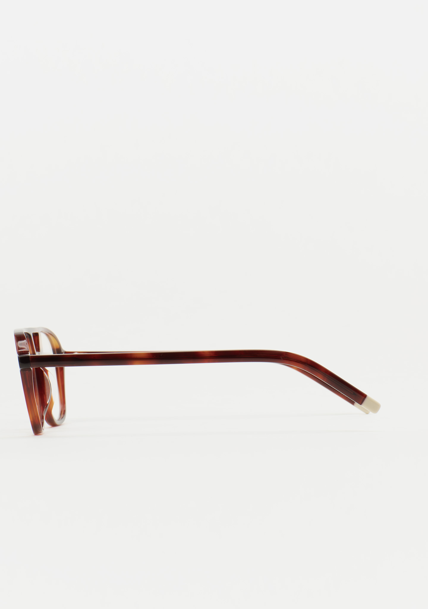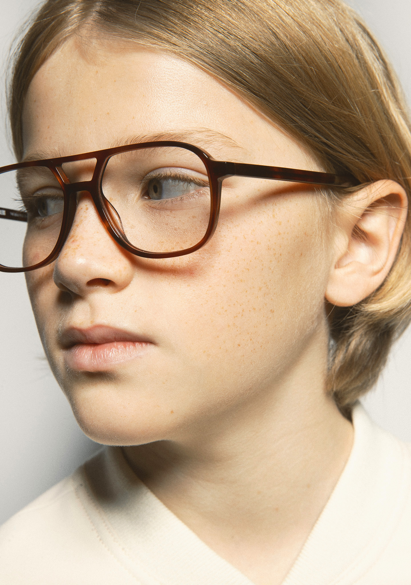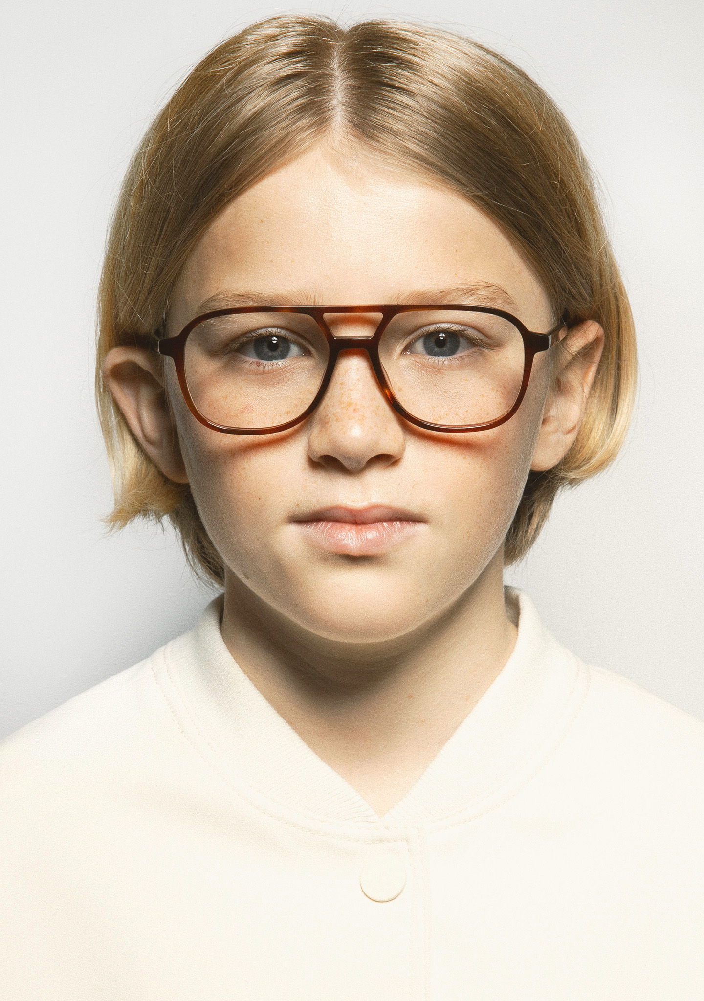 Aviatorförmige optische Kinderbrille mit Doppelsteg. Front und Bügel aus dunkelbraunem Havana-Acetat. Bügel mit beigefarbenen Enden. Integrierte Acetat-Nasenpads. Handgefertigt.