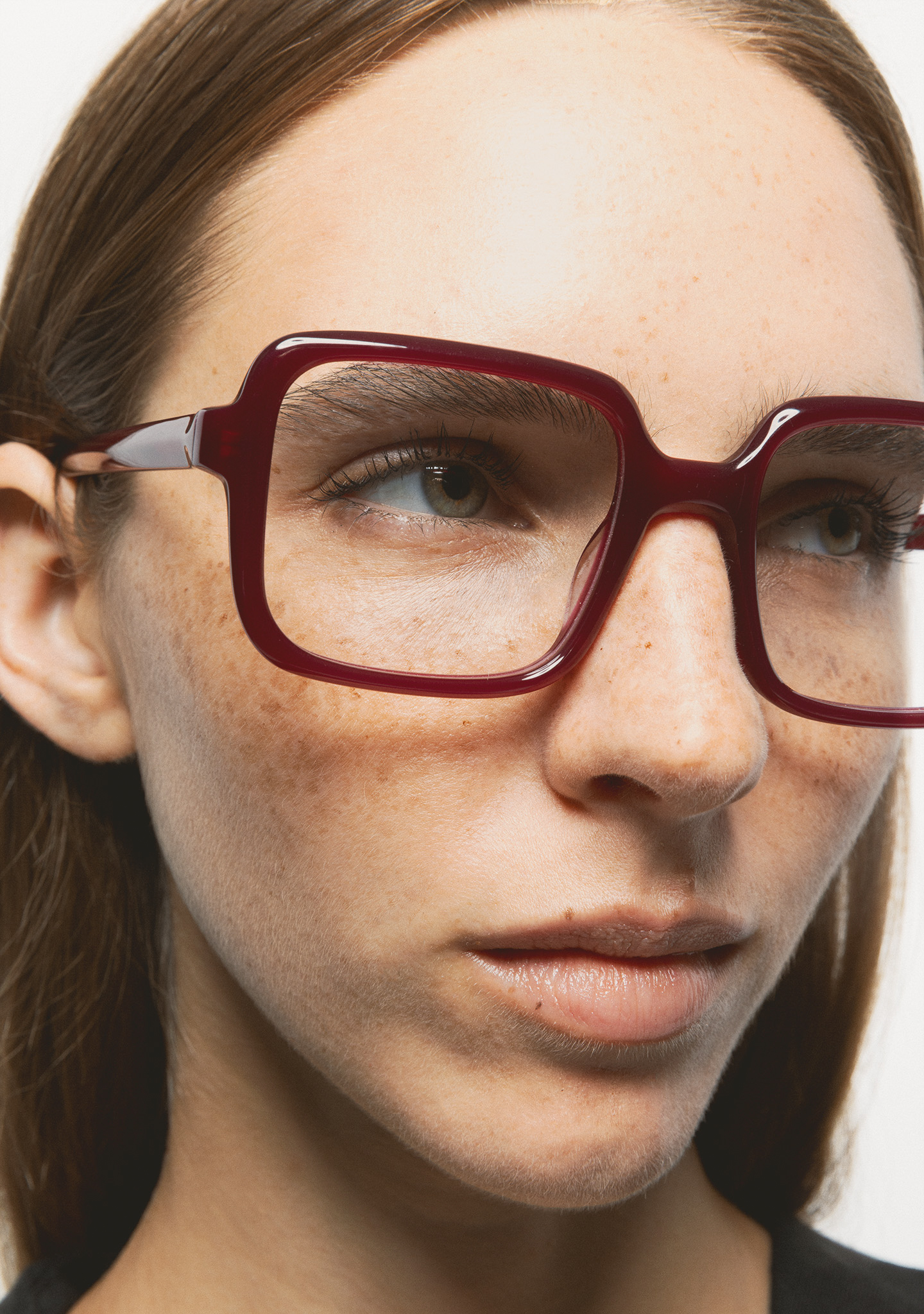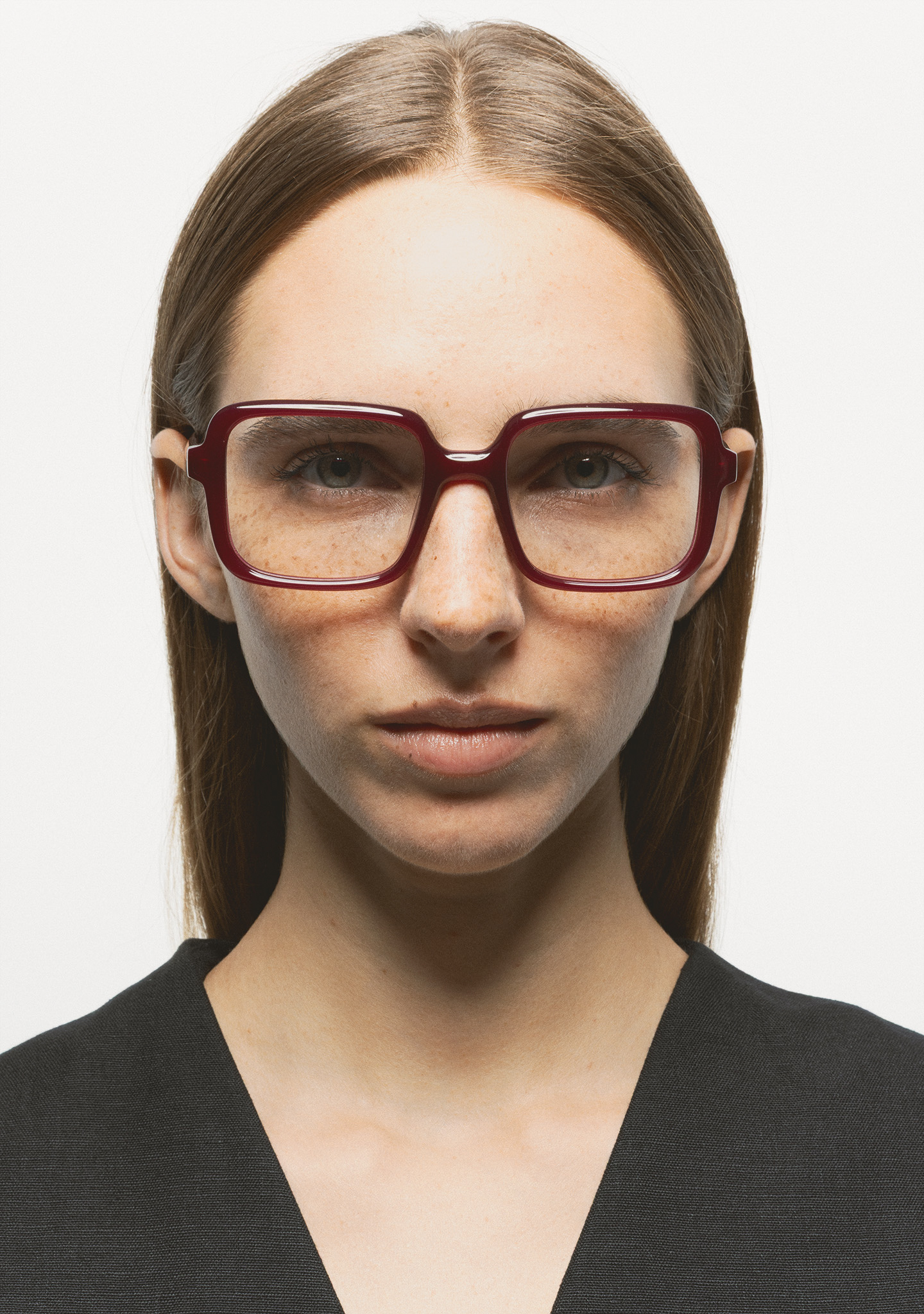 Quadratische Korrektionsbrille. Präsenz, die für sich spricht. Front und Bügel aus transluzentem bordeauxfarbenem Acetat. Fräsung um die Linse. Integrierte Nasenpads aus Acetat. Handgefertigt.