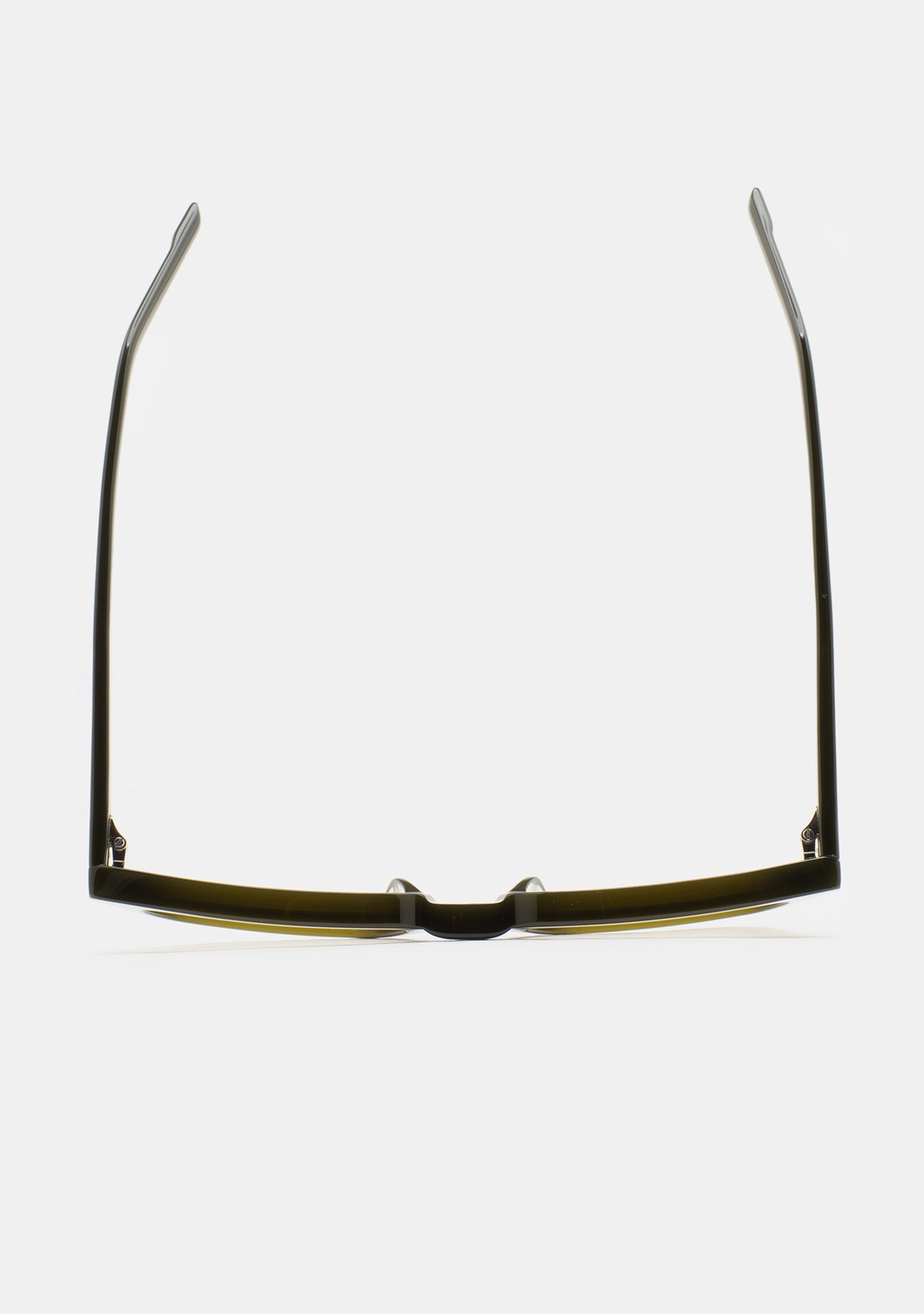Rectangular-shaped sunglasses. Minimalism with personality. Front and temples in green acetate. Yellow photochromic lenses base 2 with UV protection and anti-reflective treatment. Category 1–3 lenses. Integrated acetate nose pads. Handmade.