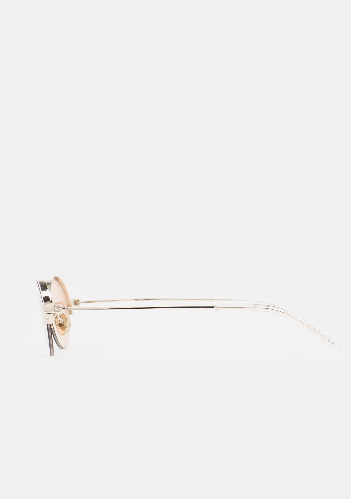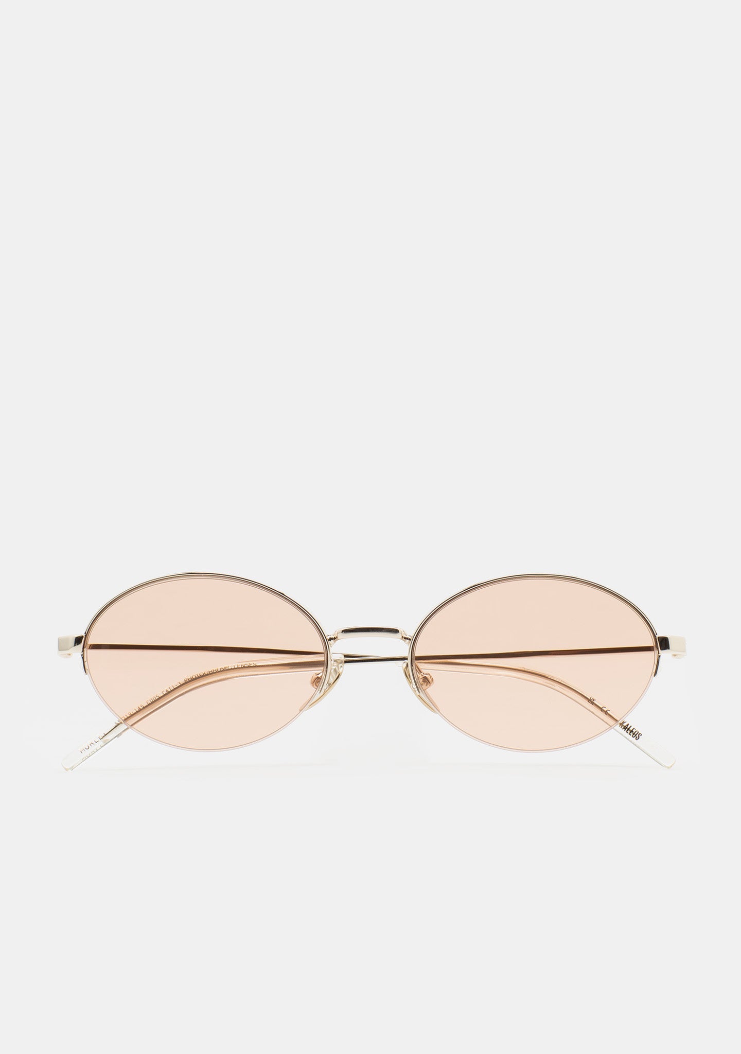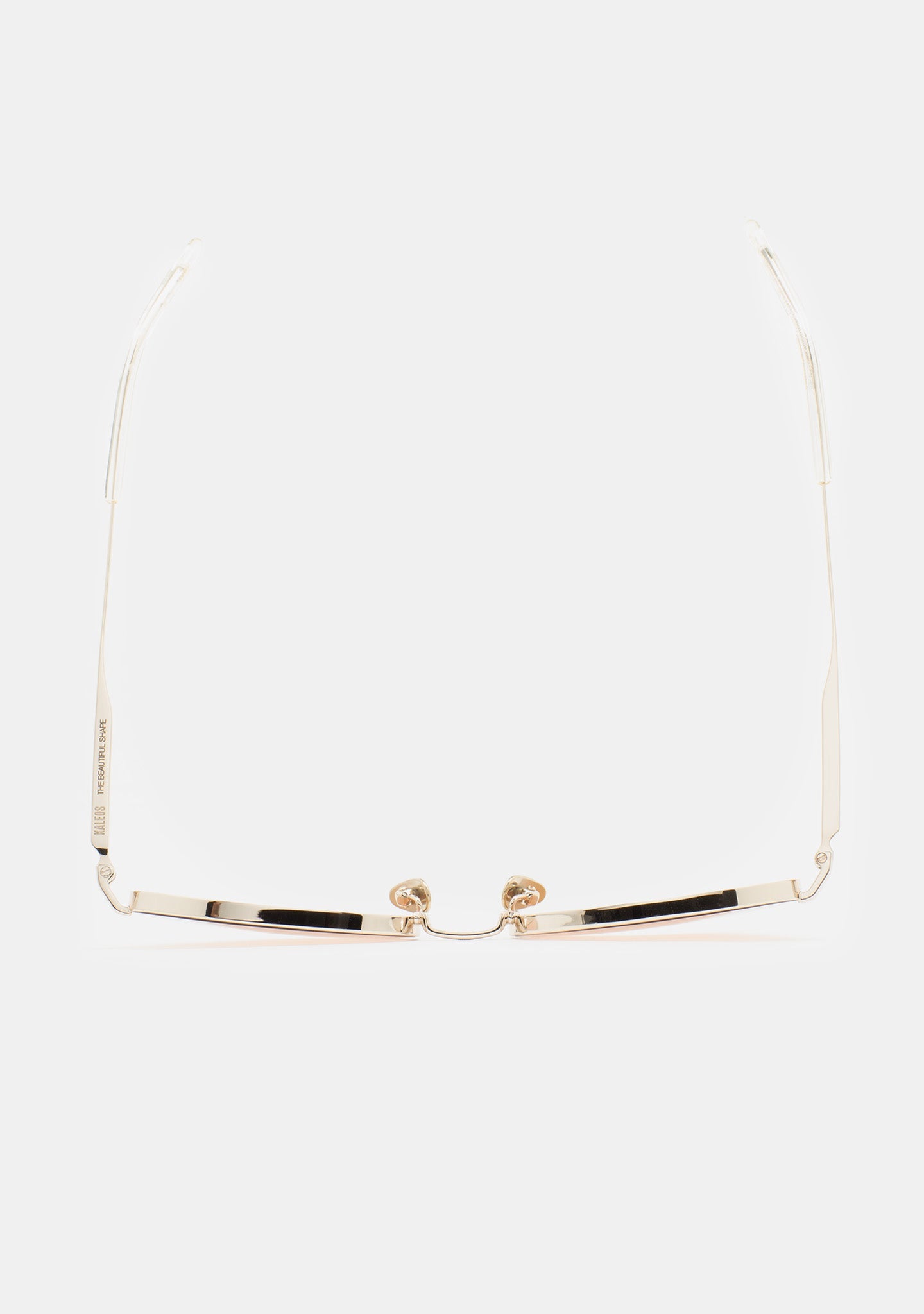 Oval sunglasses. Elegance with an unexpected twist. Semi-rimless front in light gold stainless steel. Temples in light gold stainless steel with crystal acetate tips. Photochromic pink lens base 2 with UV protection and anti-reflective coating. Lens Category 1-3. Incorporated nose pads. Handmade.