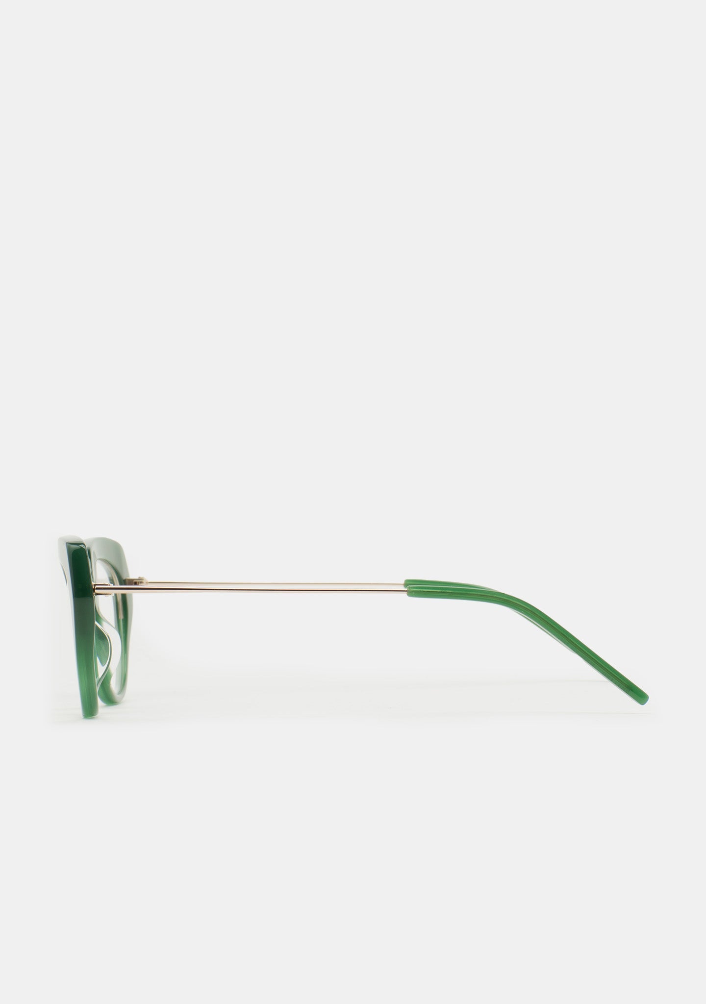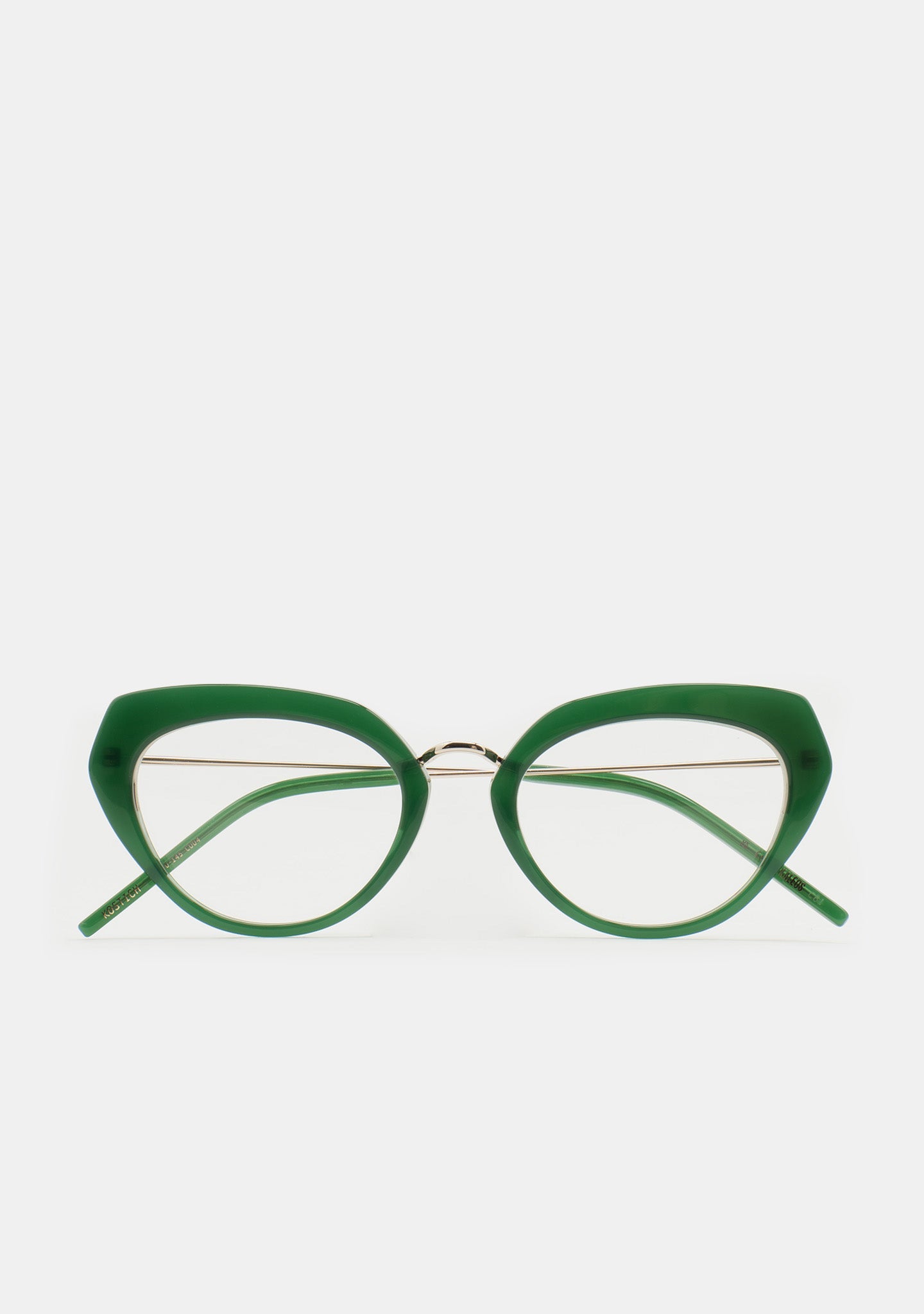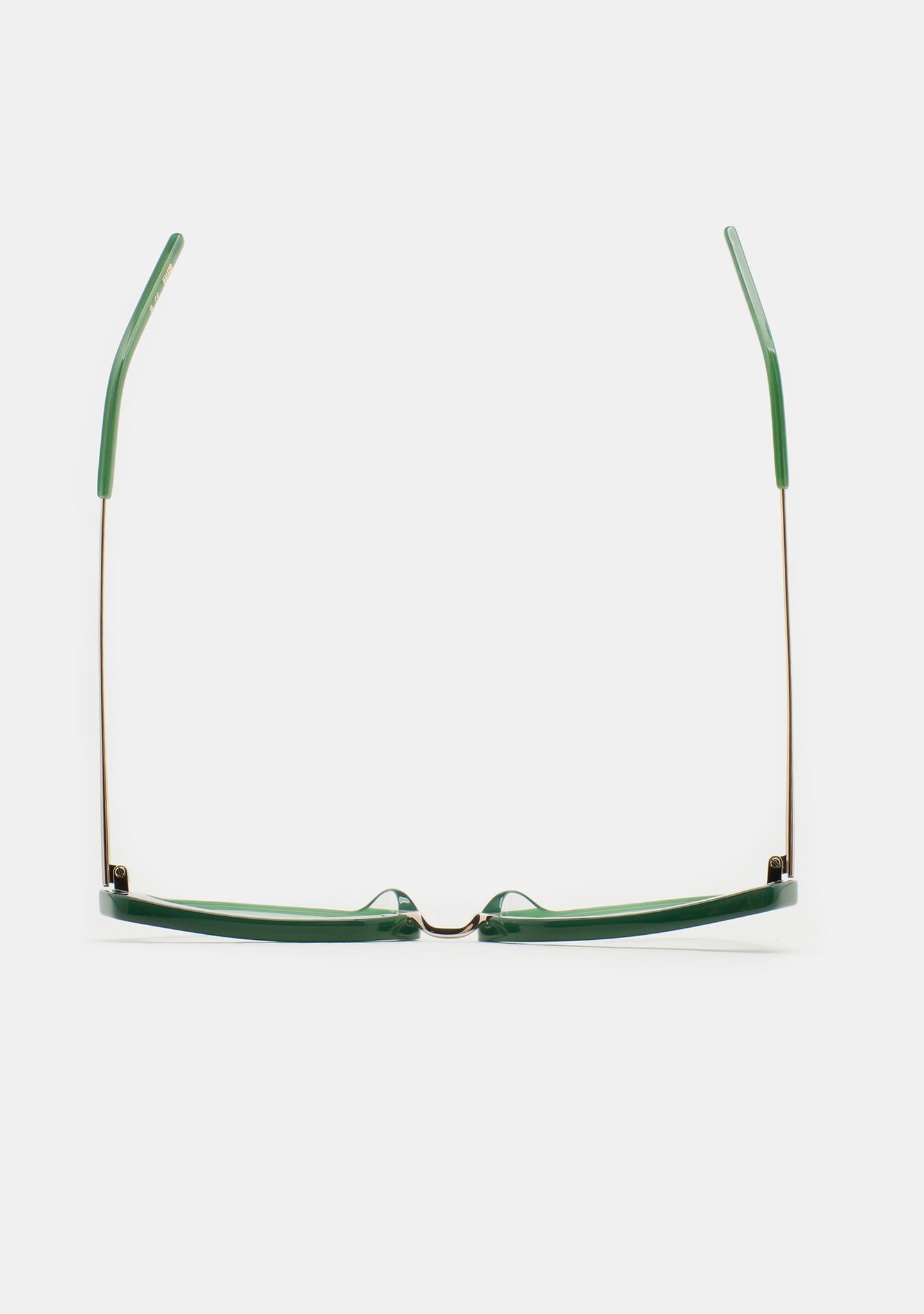 Cat-eye shaped eyeglasses. A bold shape that makes the difference. Translucent green acetate front. Gold-toned stainless steel structure and bridge. Stainless steel temples with dark green translucent acetate tips. Integrated acetate nose pads. Handmade.