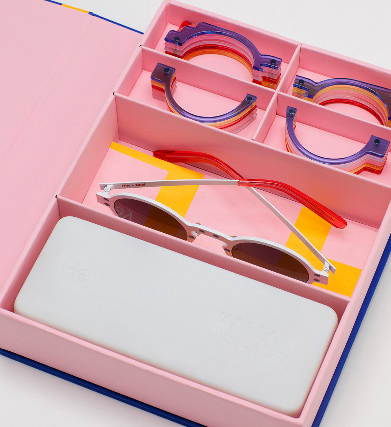 HEY x KALEOS eyewear captures the playful essence of Hey’s colorful universe while embracing a high level of technical complexity. The design is conceived as a modular system that allows multiple frame compositions within a single structure, turning the object into an interactive experience. Complemented by a unique packaging concept, the piece invites users to explore and engage with it beyond its traditional function.