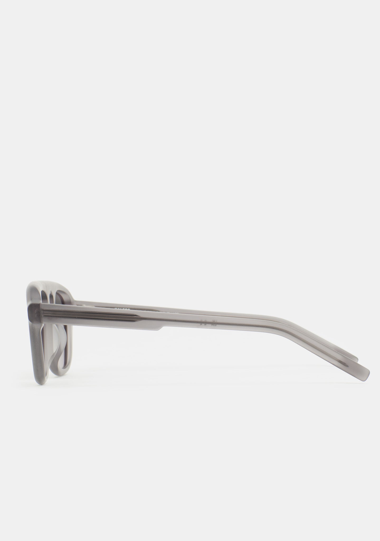 Rectangular-shaped sunglasses. Design defined by geometry and distinctive details. Front and temples in matte transparent grey acetate. Grey polarized lenses base 2 with 100% UV protection and anti-reflective treatment. Category 3 lenses. Integrated nose pads. Handmade.