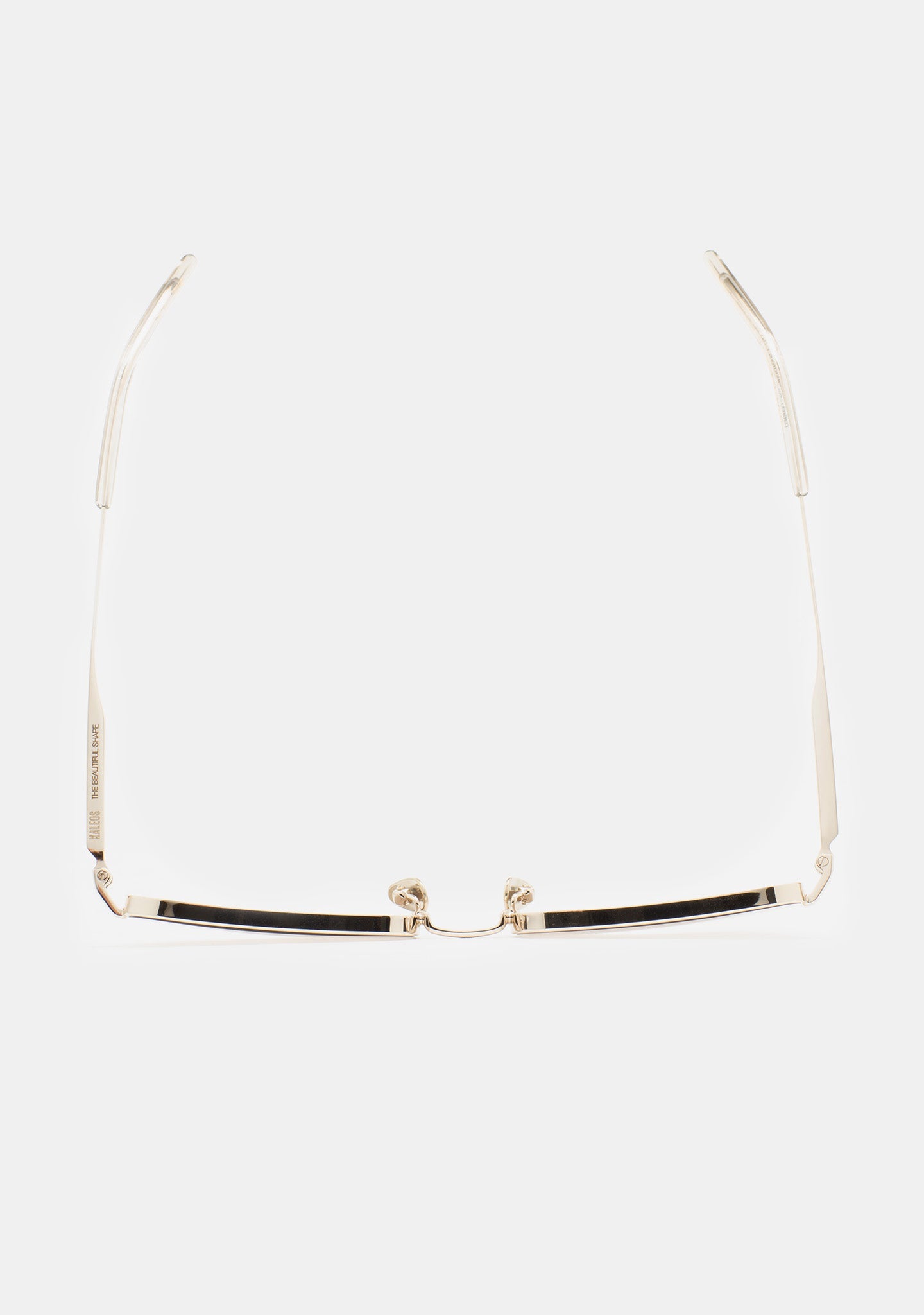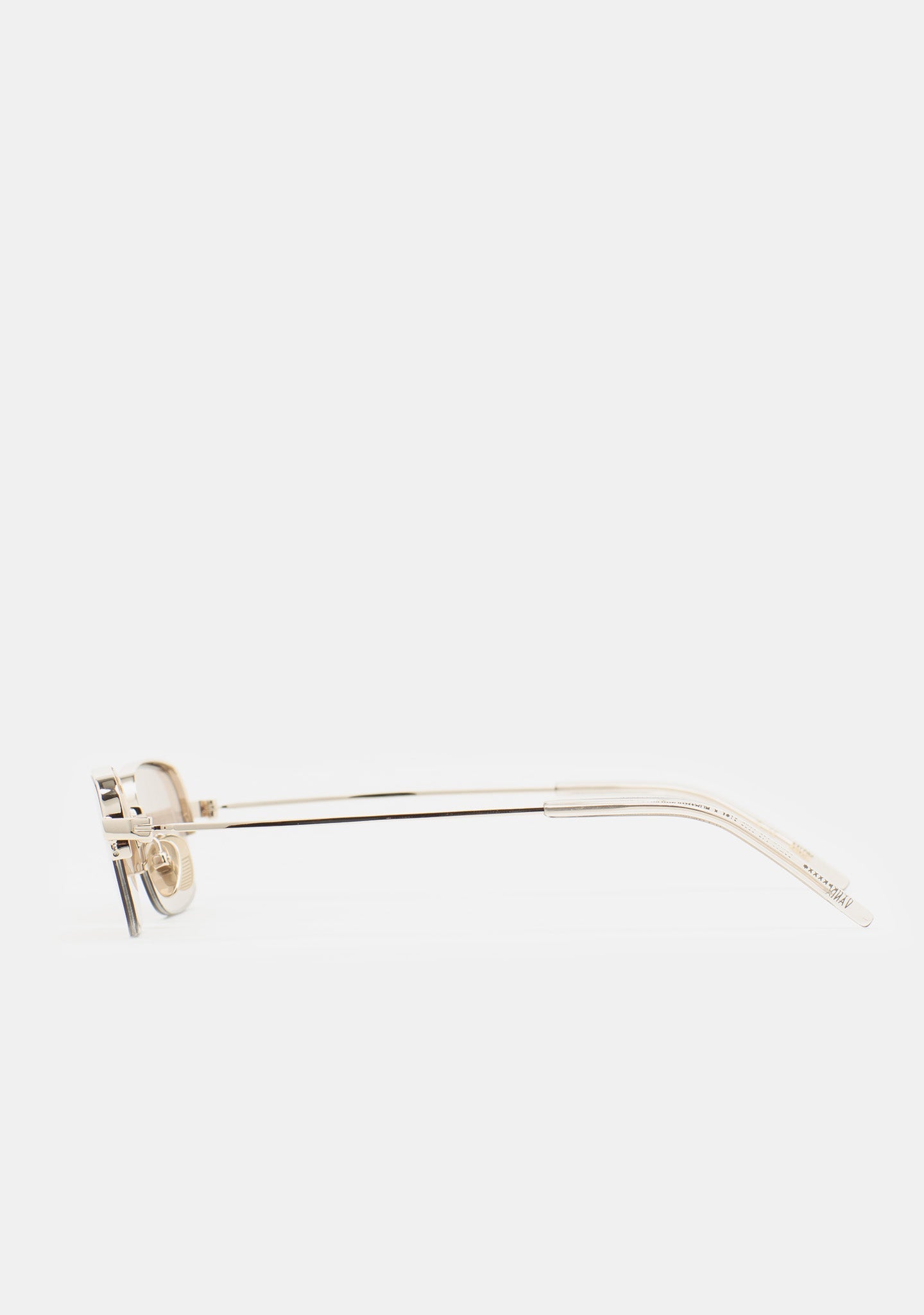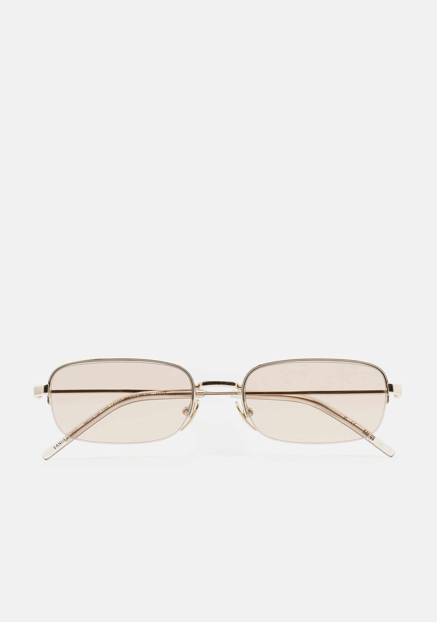 Rectangular sunglasses. Wearable architecture. Semi-rimless front in light gold stainless steel. Temples in light gold stainless steel with transparent crystal acetate tips. Photochromic brown lens base 2 with UV protection and anti-reflective coating. Lens Category 1-3. Incorporated nose pads. Handmade.
