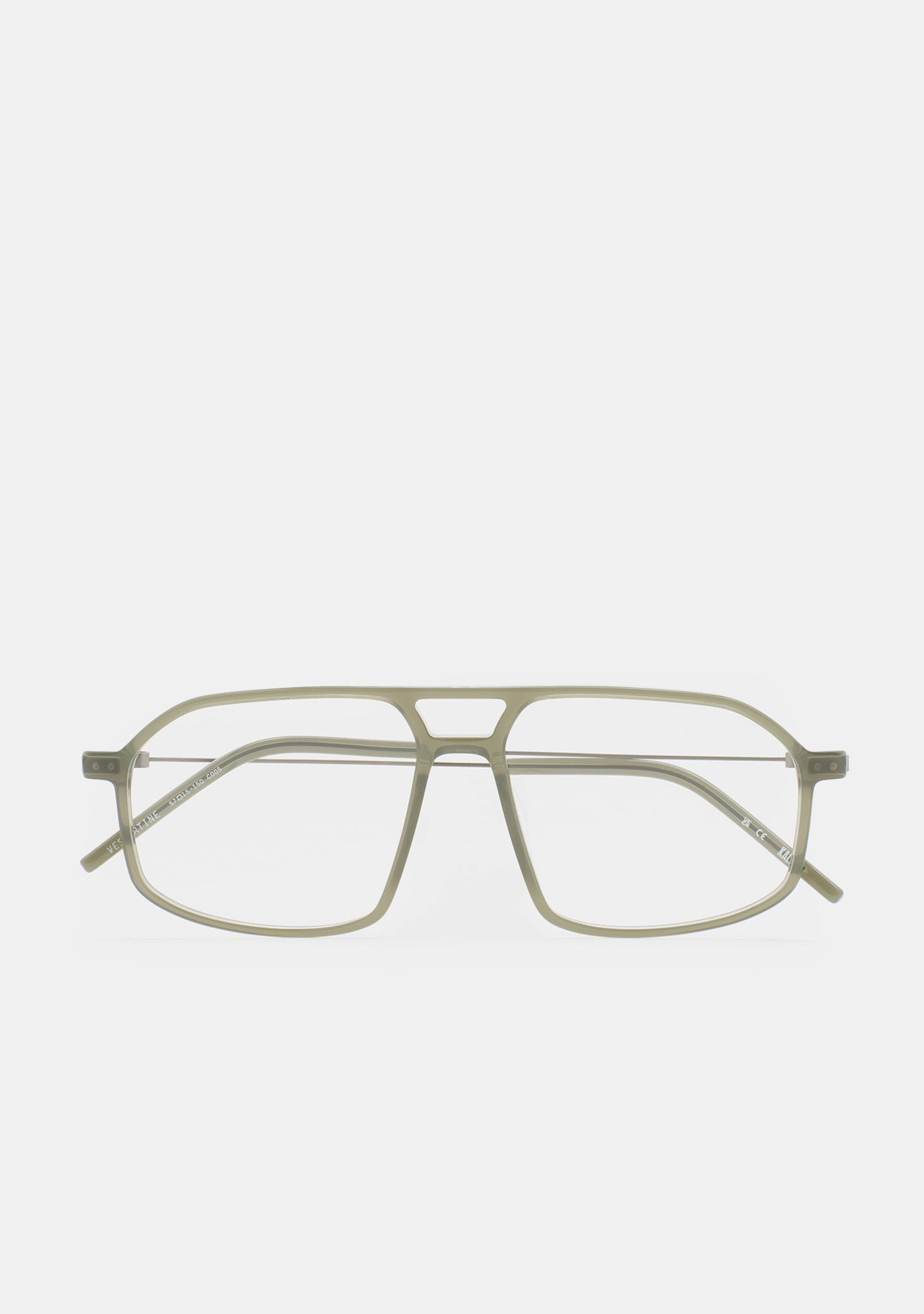 Aviator-shaped optical glasses with double bridge. Visual architecture for your gaze. Translucent green high-density acetate front. Dark matte grey stainless steel temples with translucent green acetate tips. New screwless hinge system. Integrated acetate nose pads. Handmade. Available in two sizes: medium (M) and large (L).