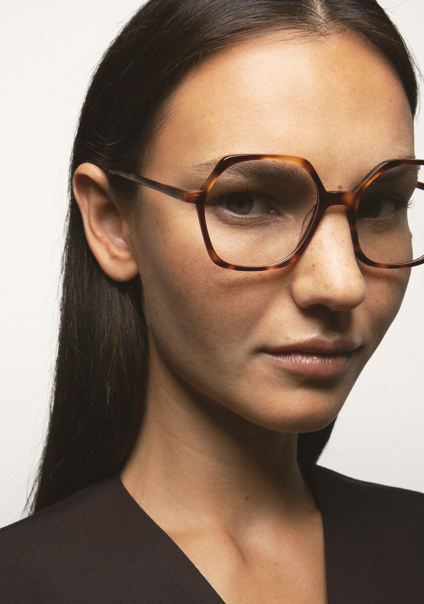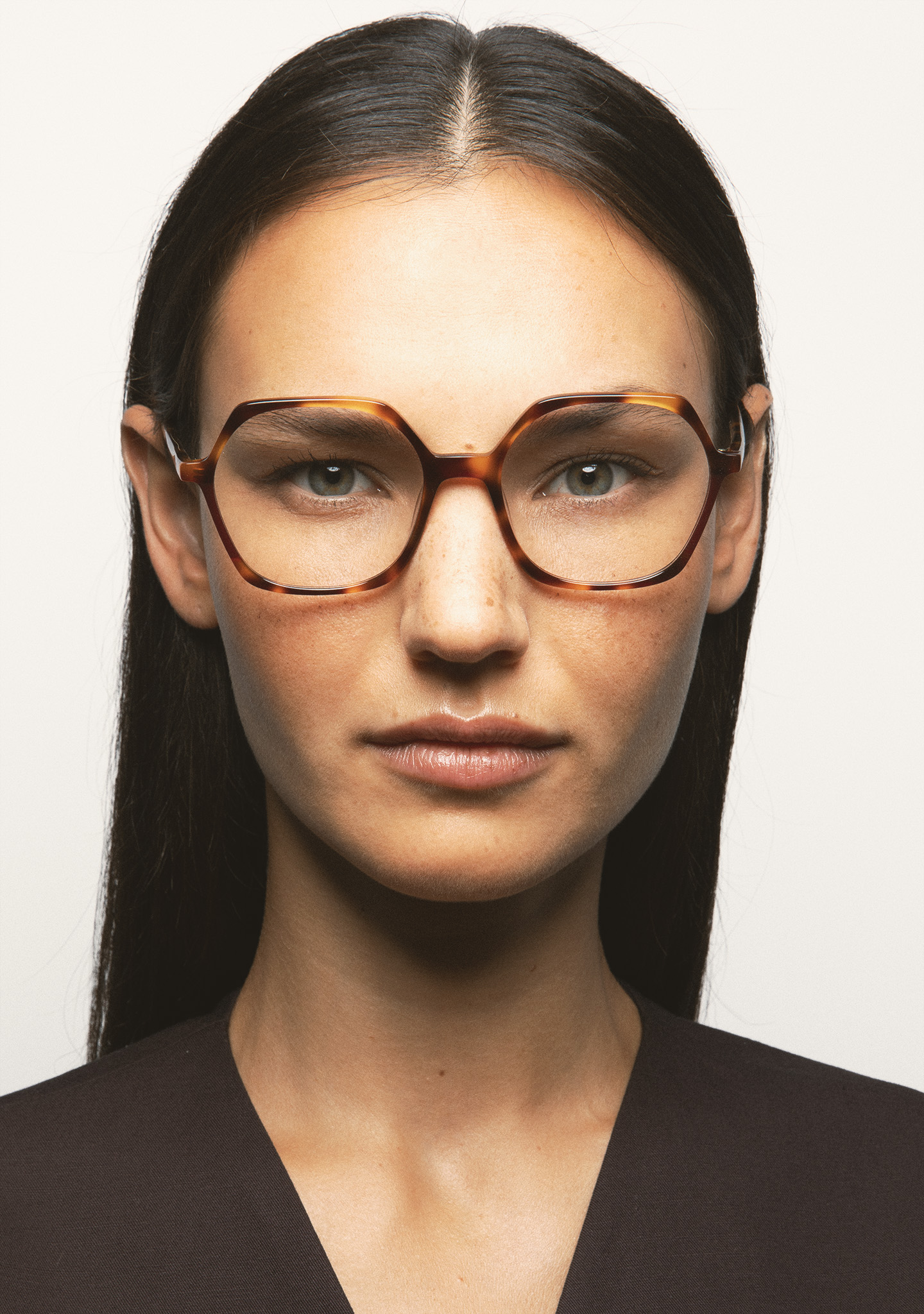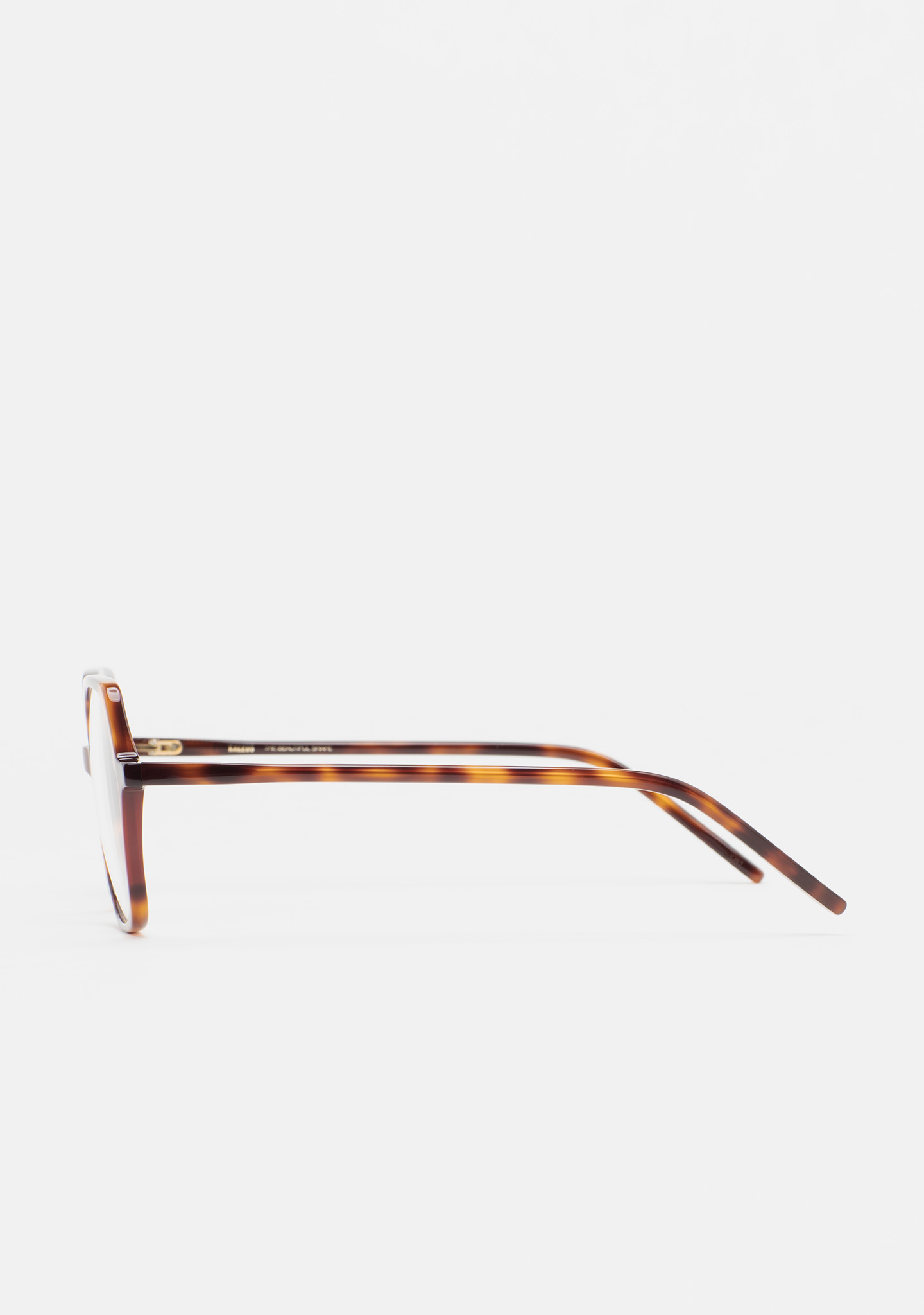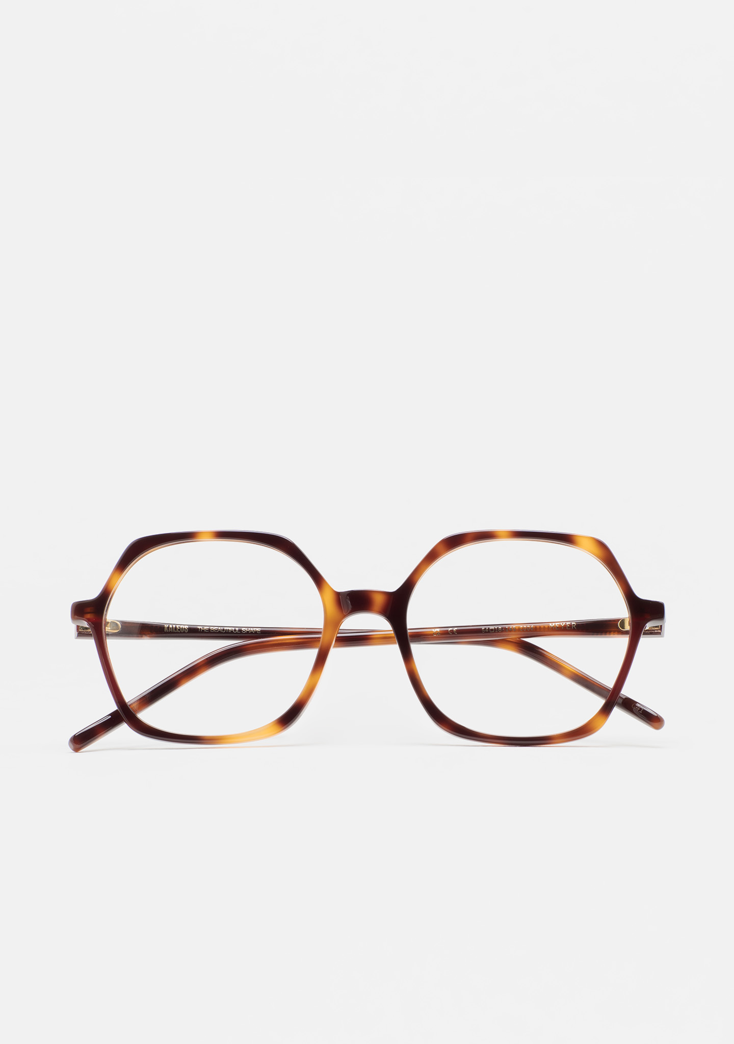 Hexagonal-shaped optical glasses. Havana brown high-density acetate front with dark burgundy laminate. Havana brown acetate temples. Built-in acetate nose pads. Handmade.