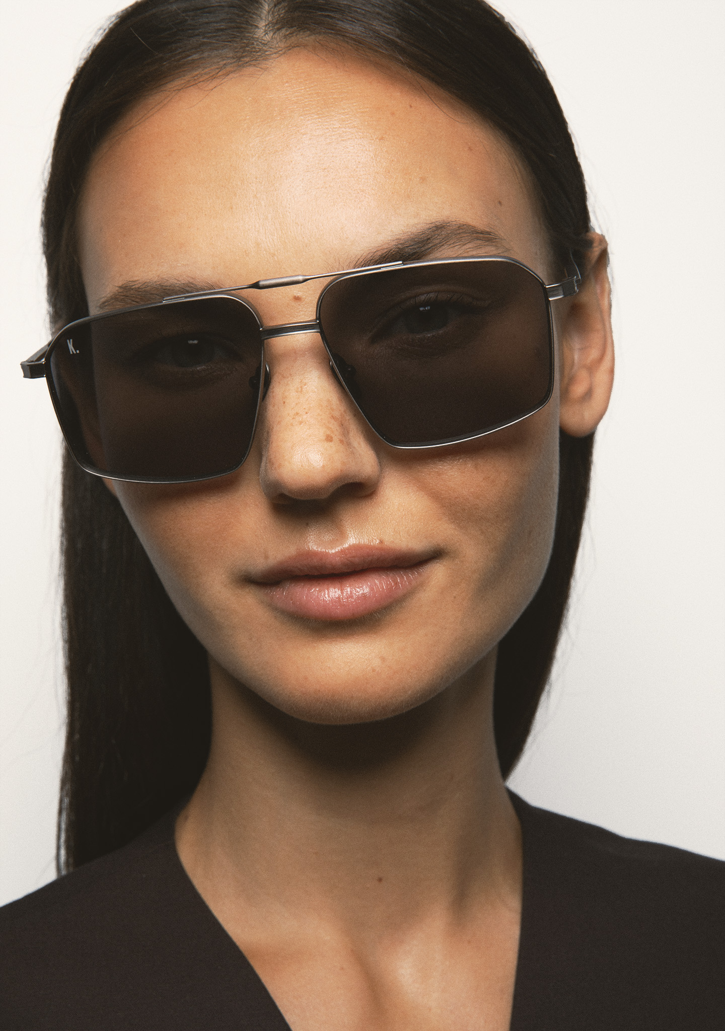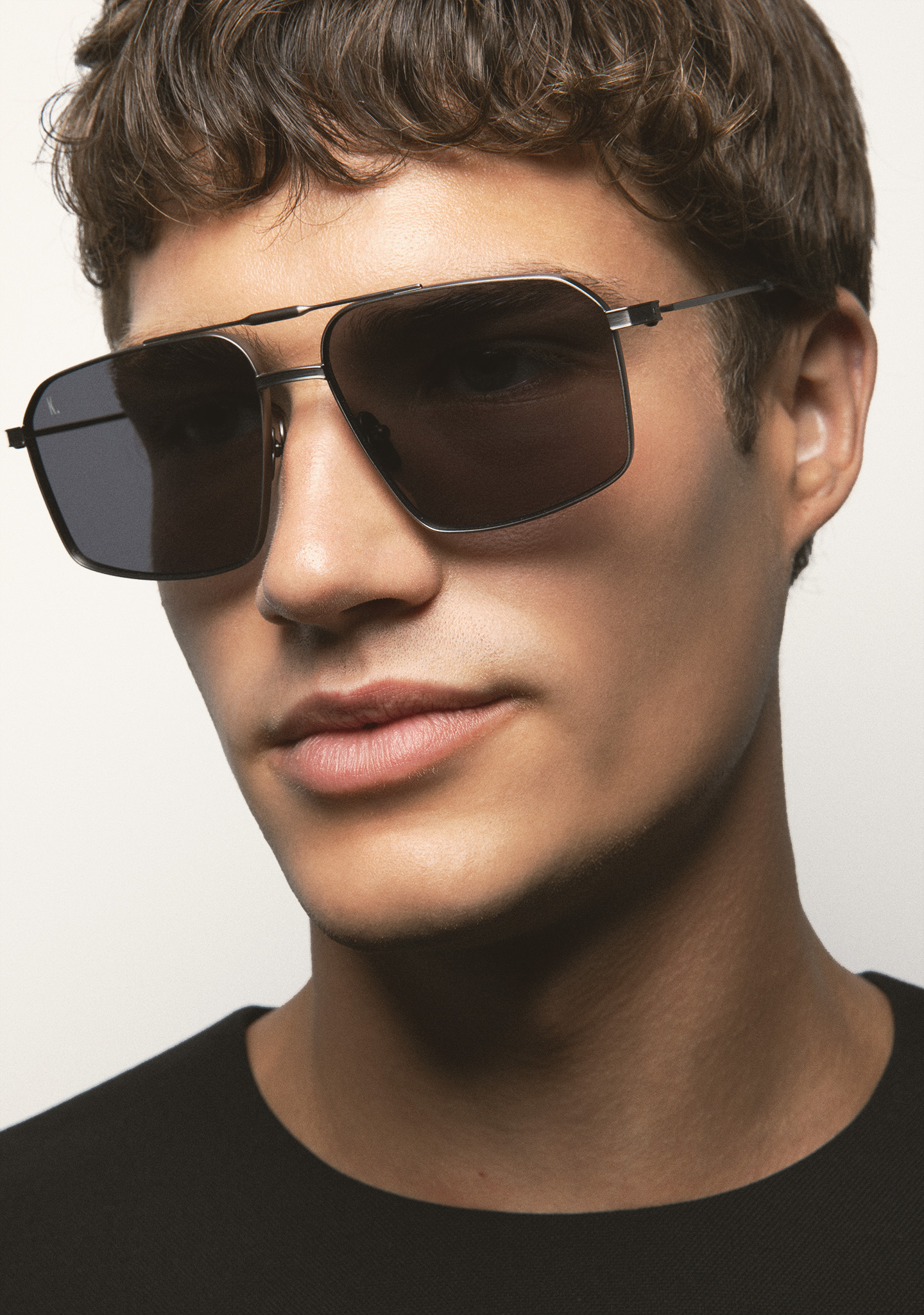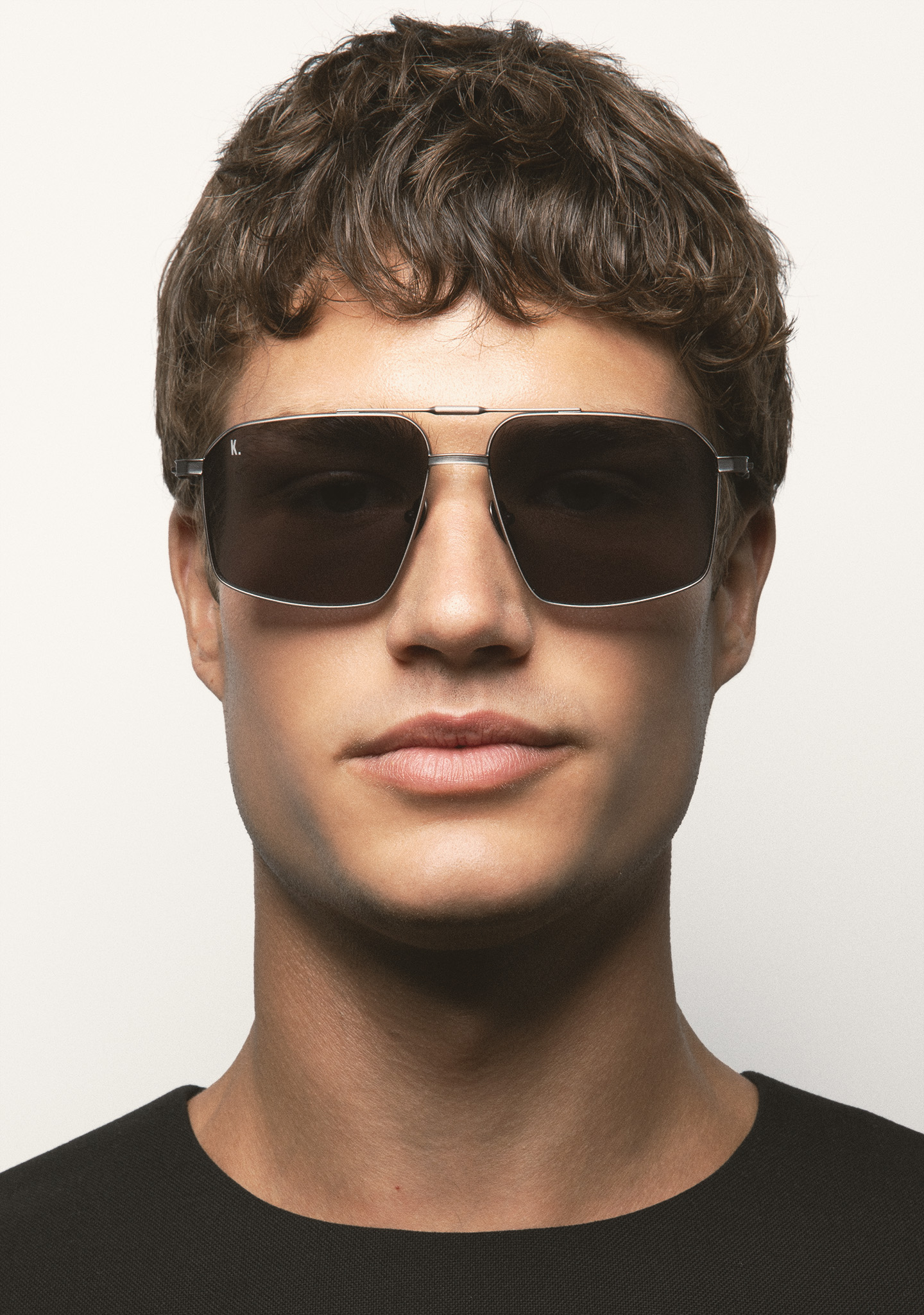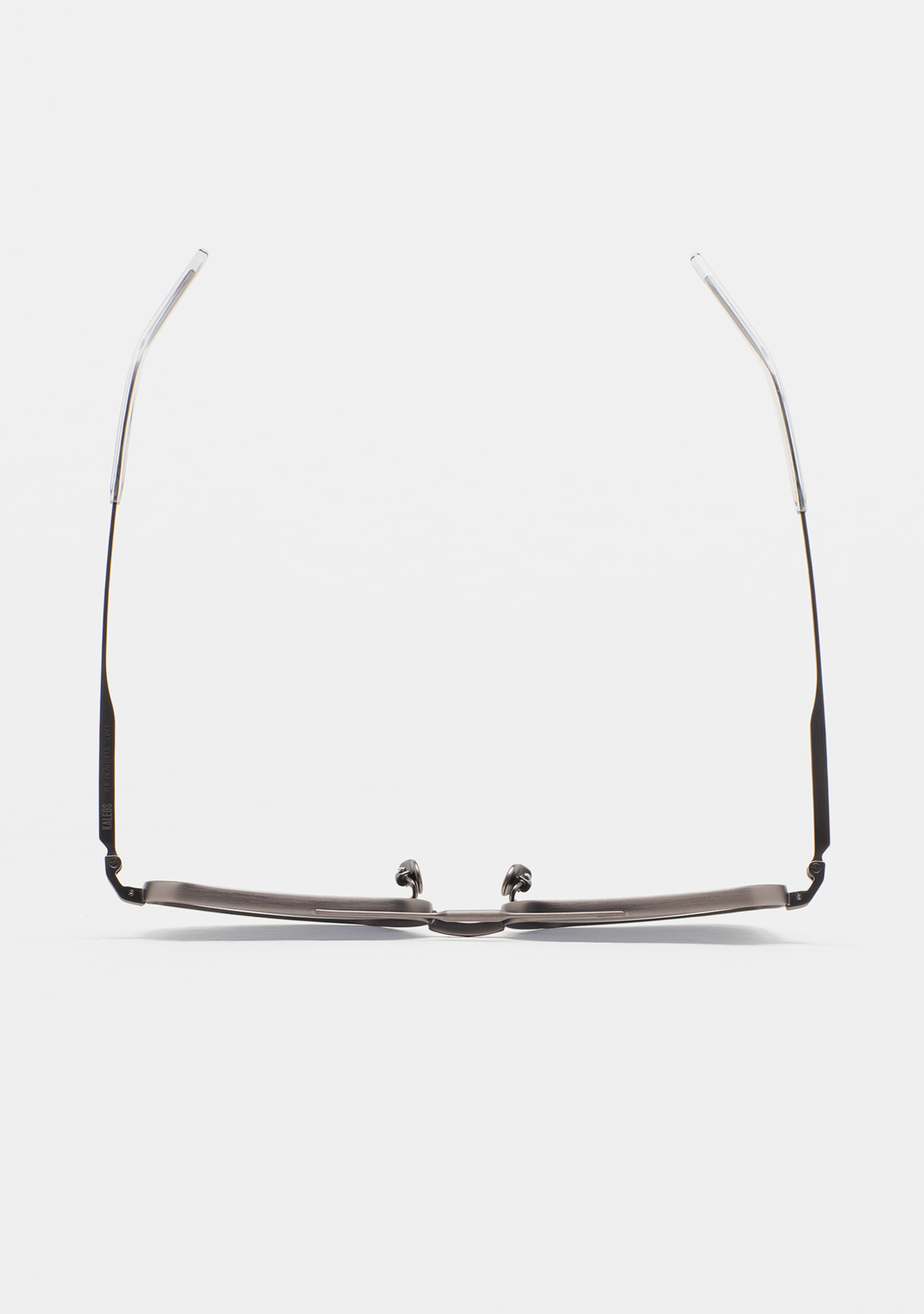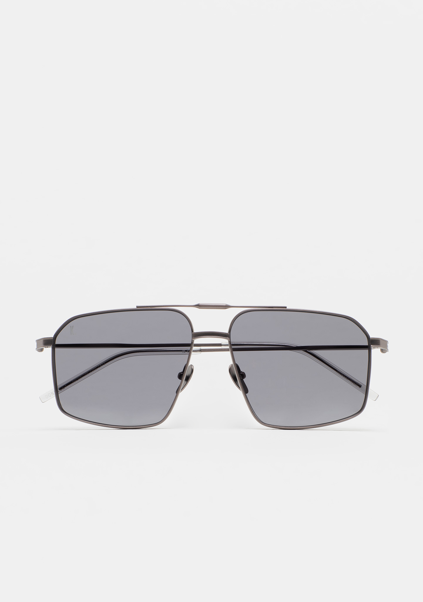 Square sunglasses with double bridge. Matte dark silver titanium front and temples. Temples end in transparent gray acetate tips. Gray lenses, base 2, with 100% UV protection and anti-reflective coating. Category 3 lenses. Integrated nose pads. Handmade.