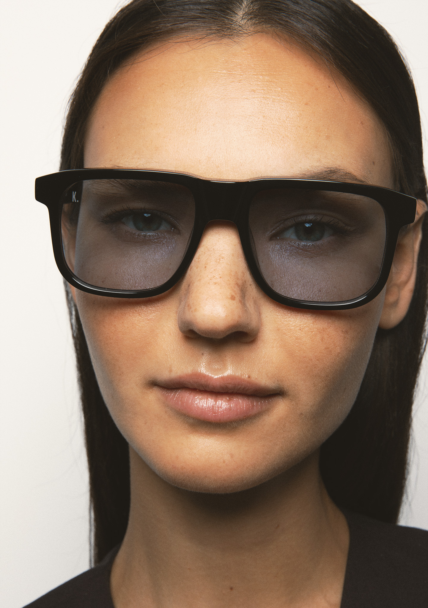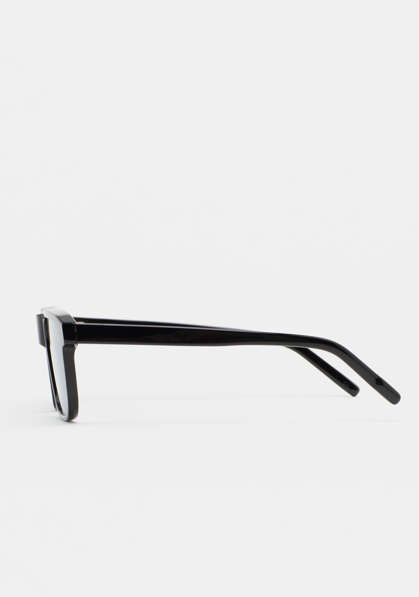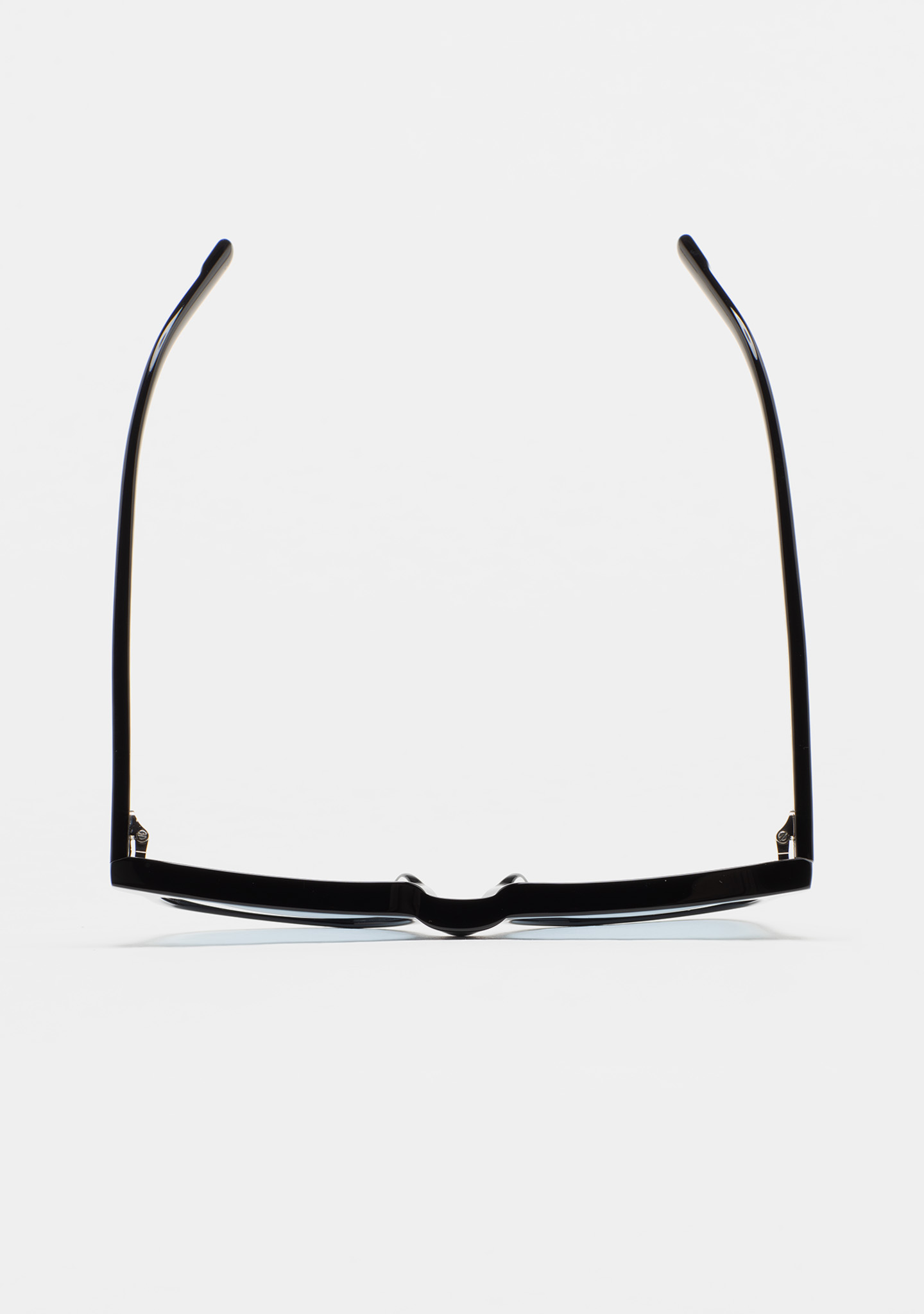 Square Sunglasses with Flat Bridge. Black acetate front and temples. Blue photochromic lenses, base 2, with UV protection and anti-reflective coating. Category 1 3 lenses. Integrated acetate nose pads. Handmade.