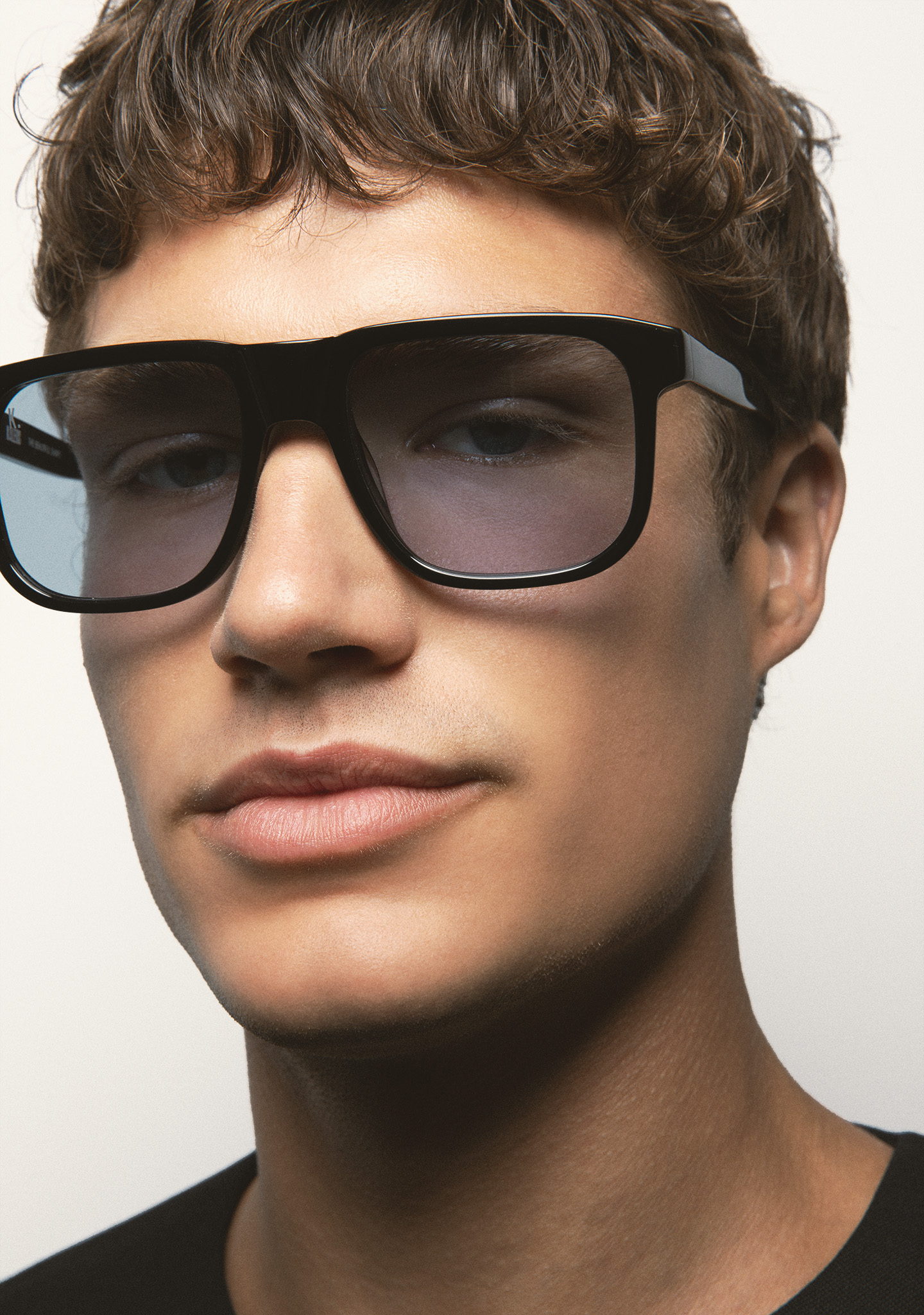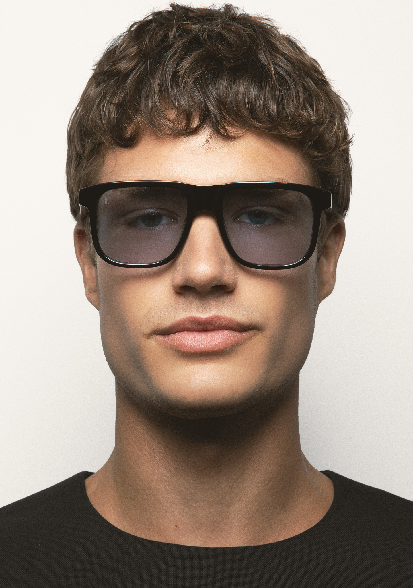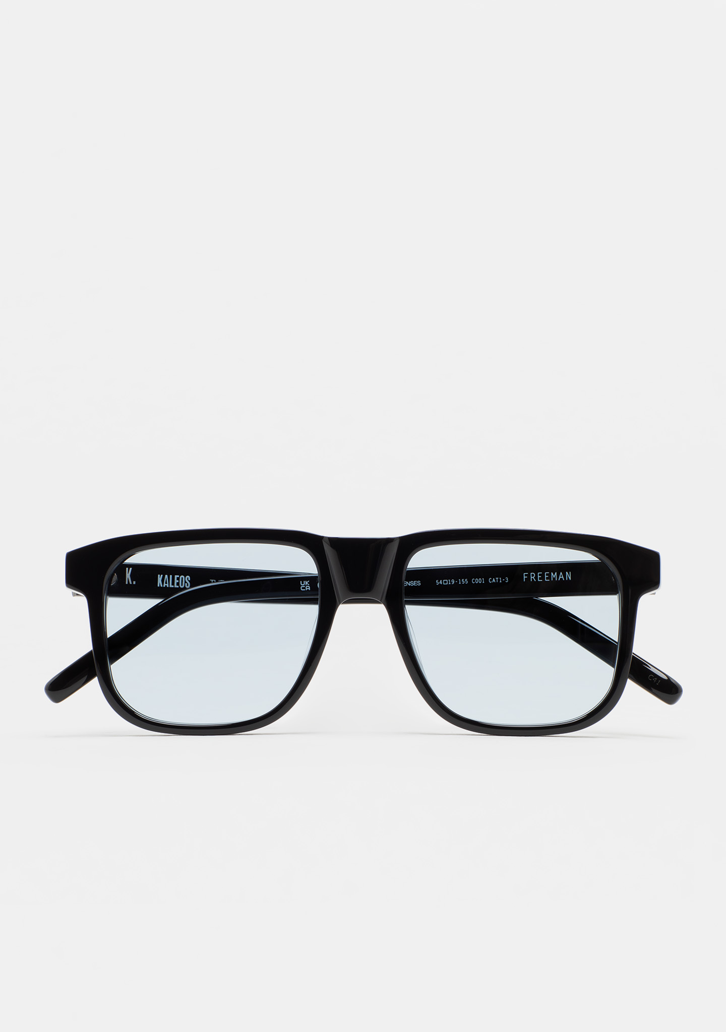 Square Sunglasses with Flat Bridge. Black acetate front and temples. Blue photochromic lenses, base 2, with UV protection and anti-reflective coating. Category 1 3 lenses. Integrated acetate nose pads. Handmade.