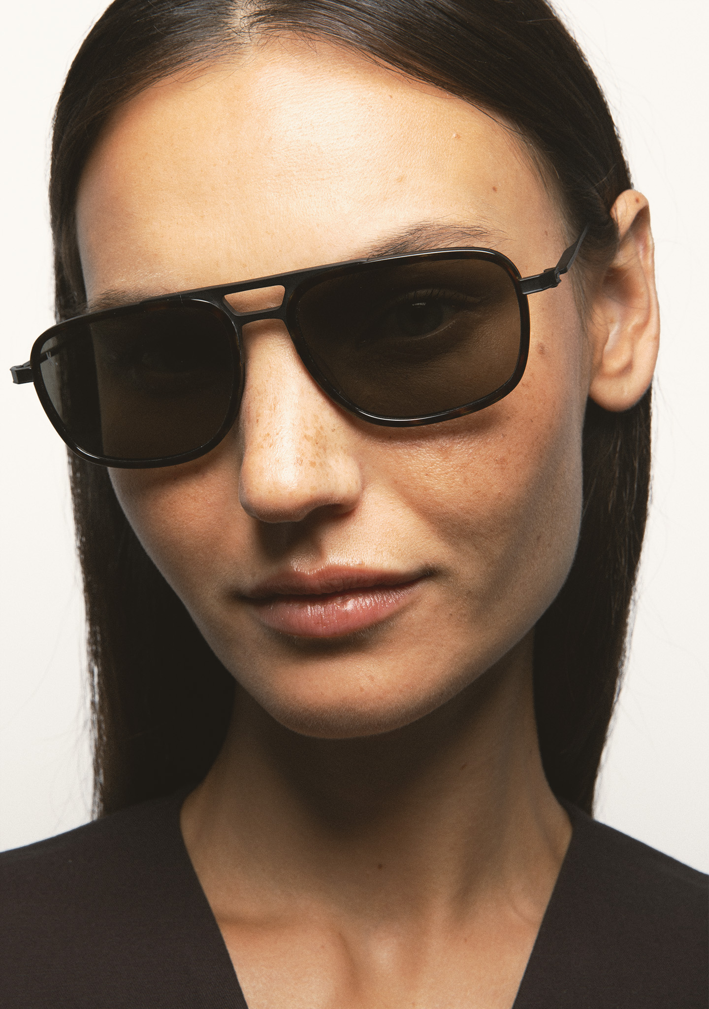 Rectangular double-bridge sunglasses. Matte black titanium front with dark brown Havana high-density acetate rim. Matte black titanium temples and bridge. Dark brown Havana acetate temple tips. Polarized gray lens, base 2, with 100% UV protection and anti-reflective treatment. Category 3 lens. Integrated acetate nose pads. Handmade.
