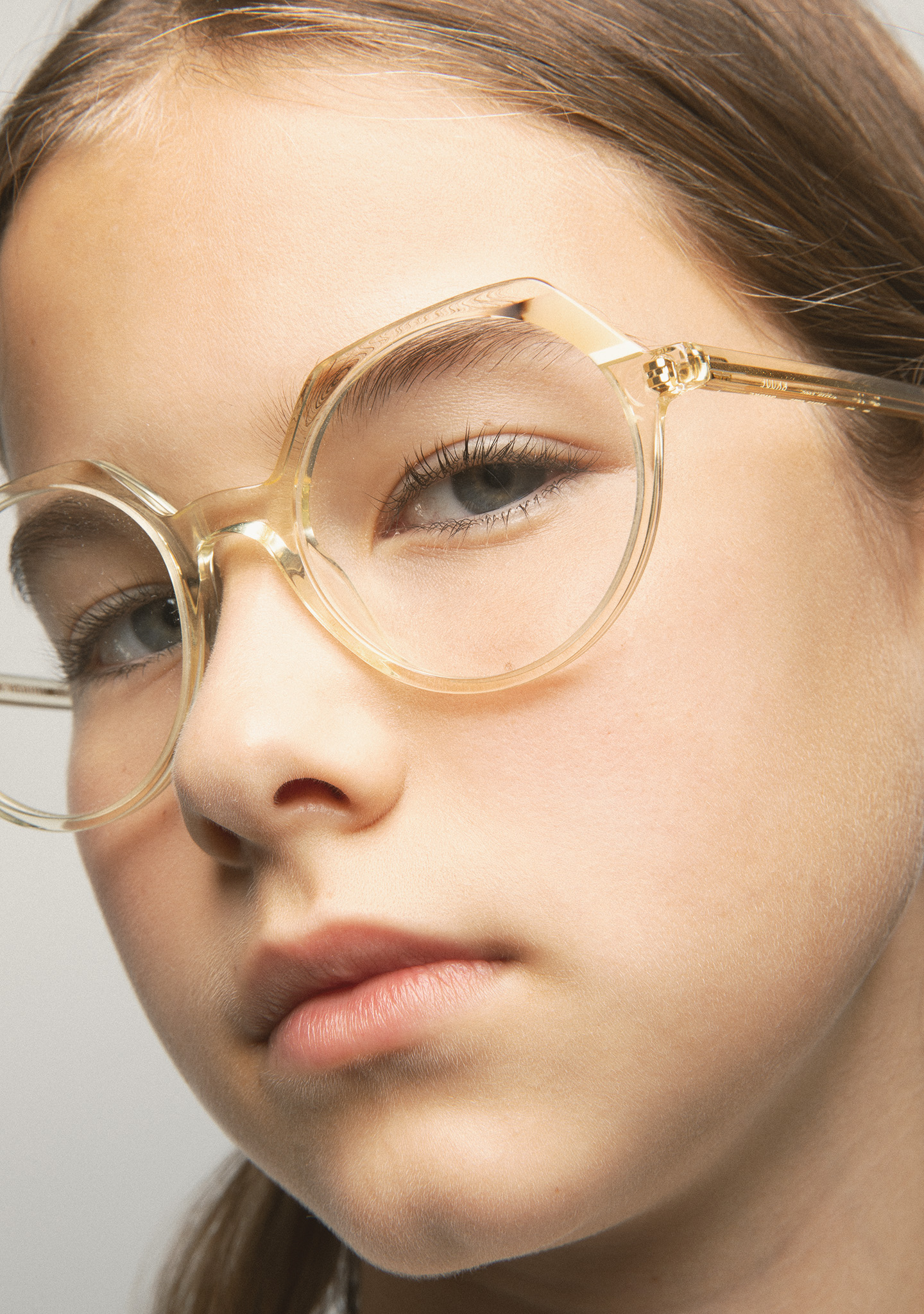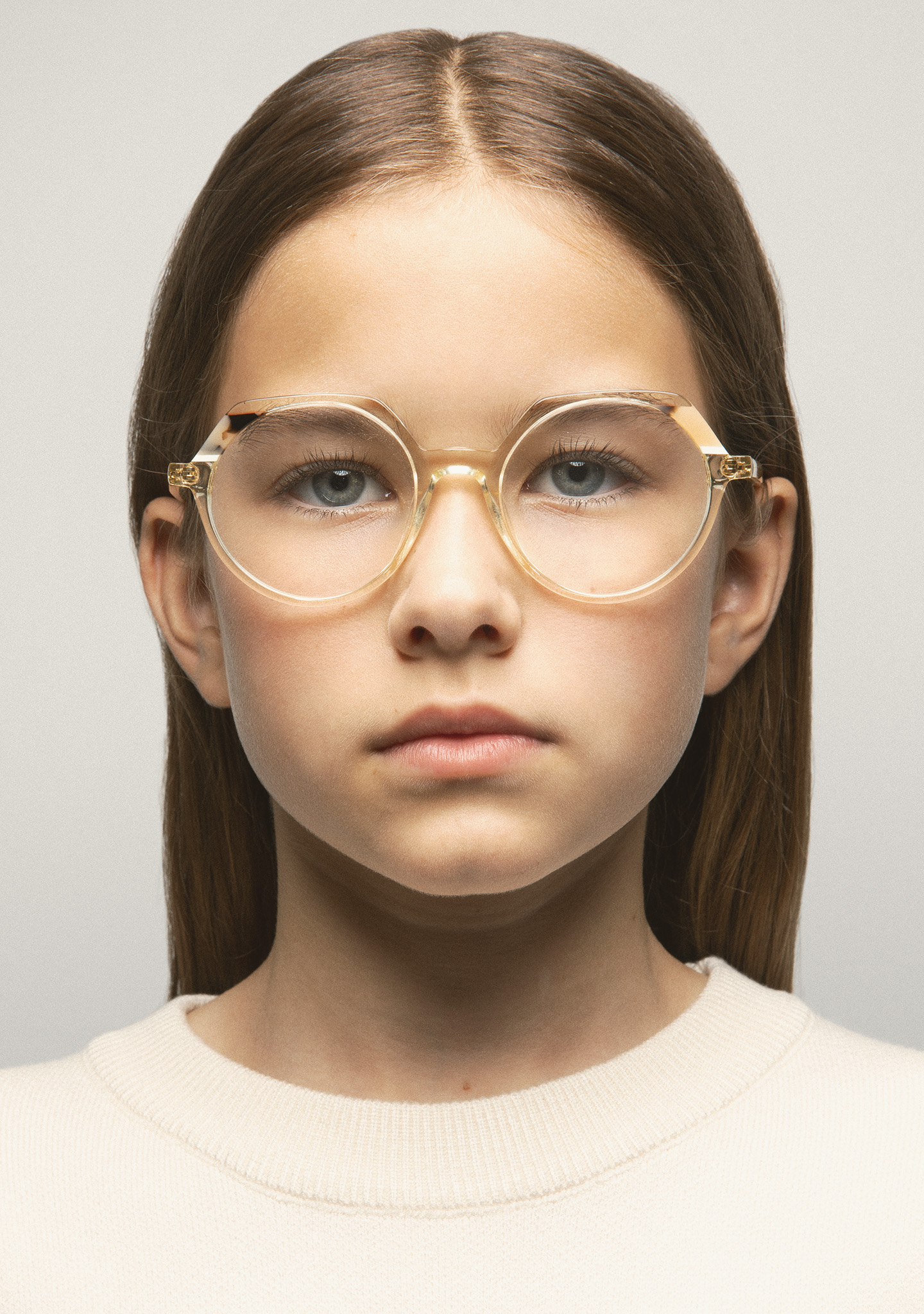 KIDS optical glasses in crystal acetate with spotted beige tortoiseshell and white double laminate. Round shape with a slightly straighter upper part. Acetate temples with rounded tips in contrasting light blue with eyelet to attach the clasp of a chain. Built-in acetate nose pads. Handmade.