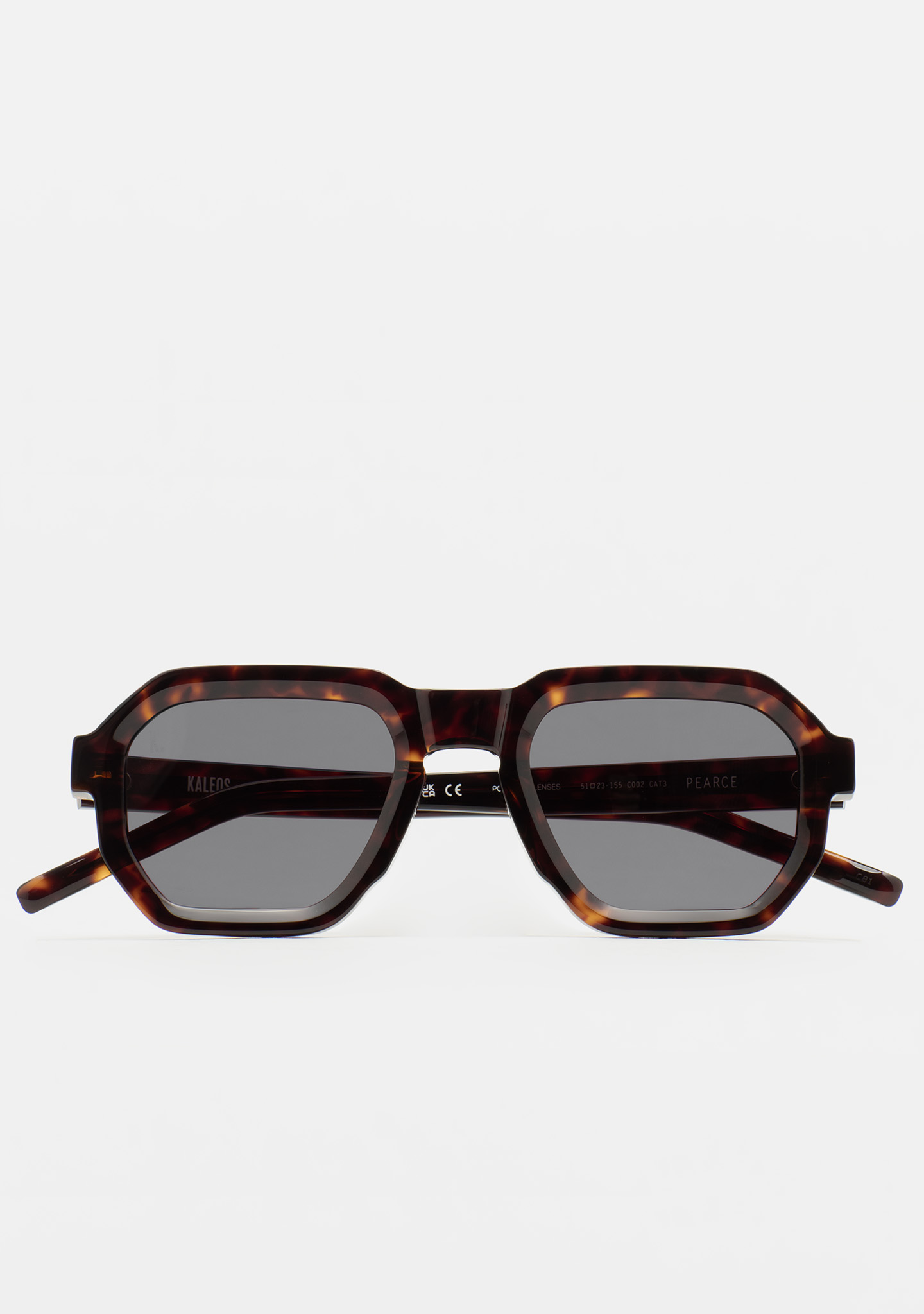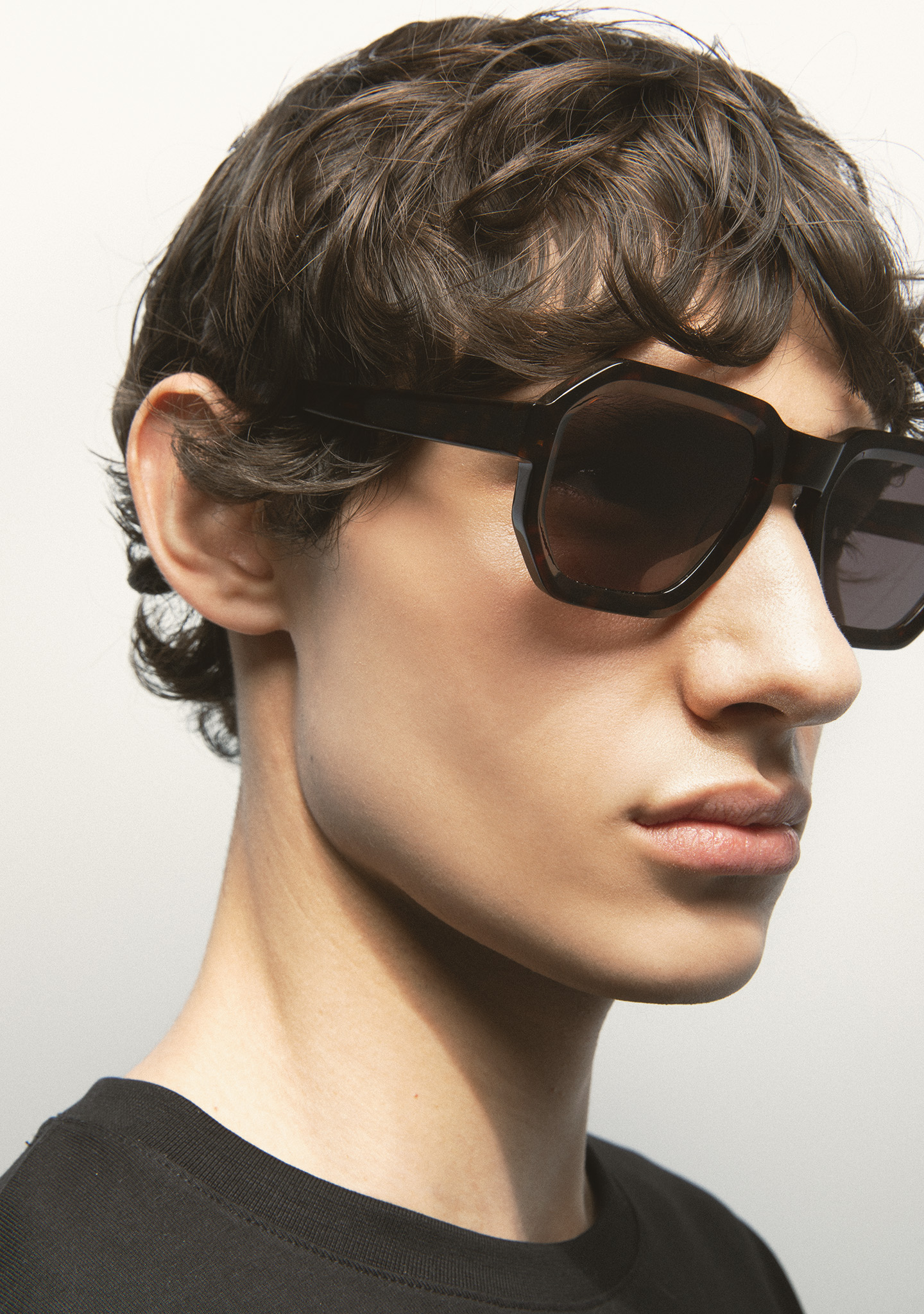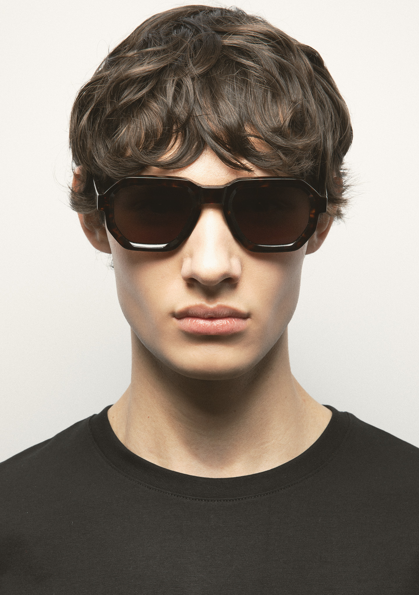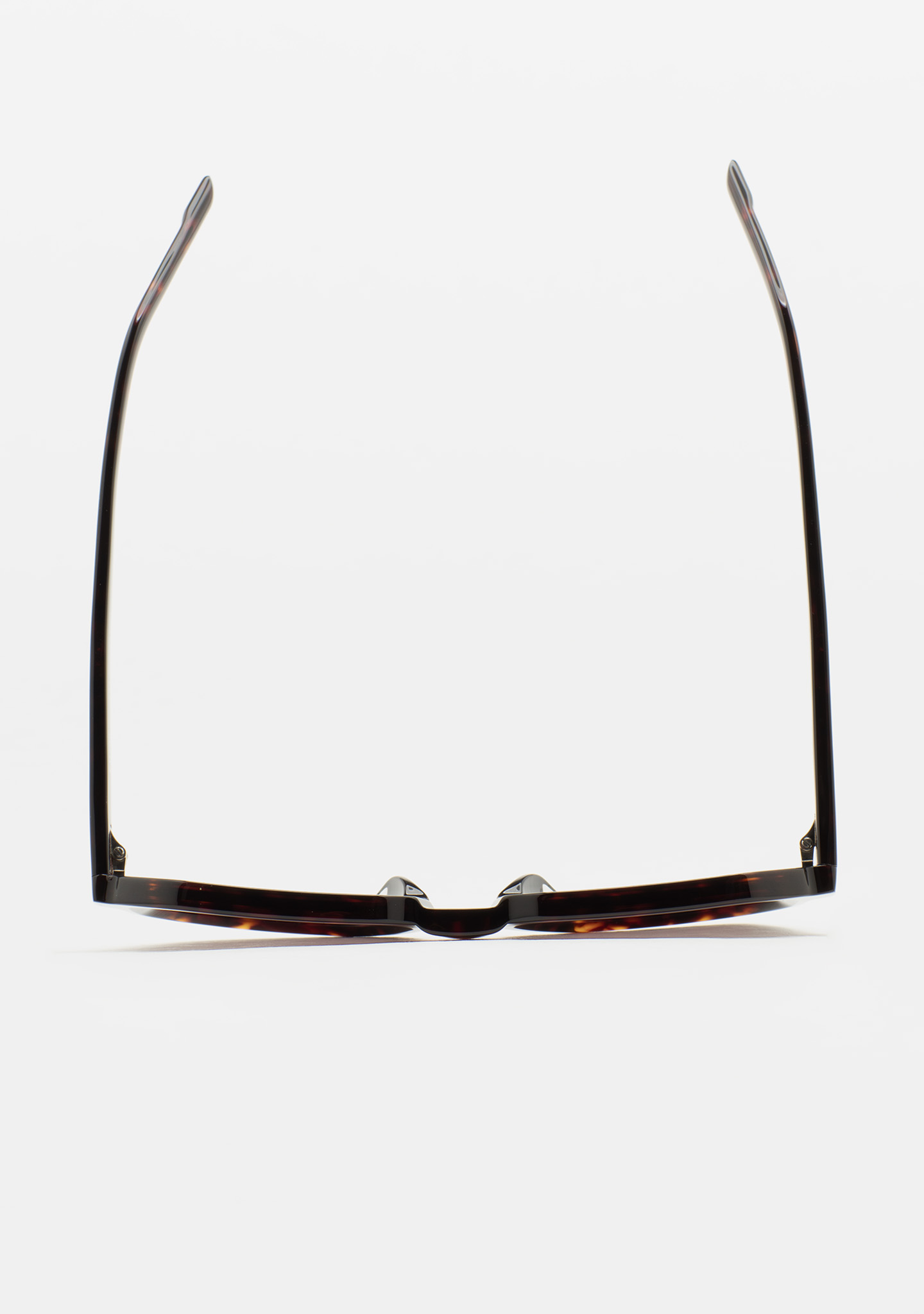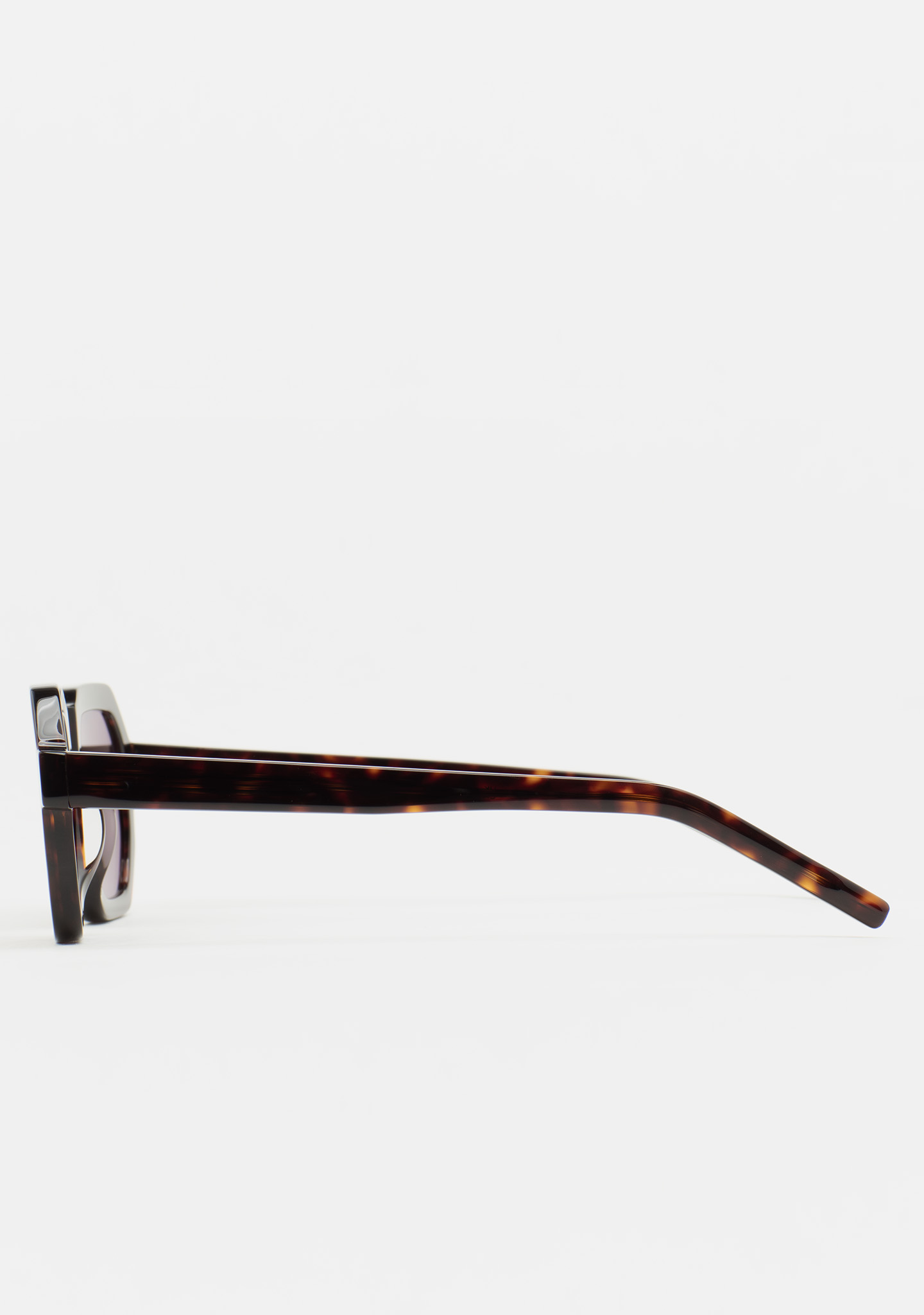 Square-shaped sunglasses. Design defined by bold volumes and refined details. Front and temples in dark brown Havana acetate. Grey gradient lenses base 2 with 100% UV protection and anti-reflective treatment. Category 3 lenses. Integrated nose pads. Handmade.