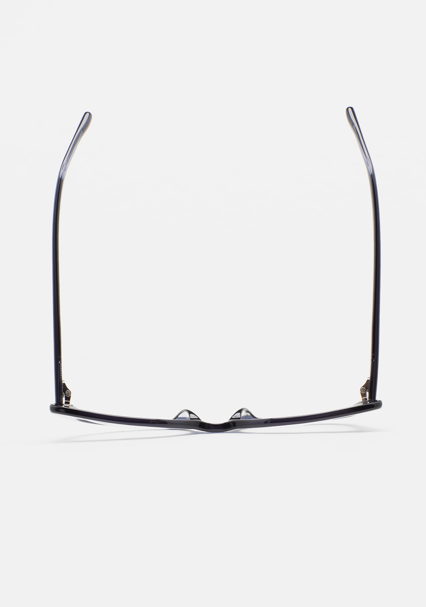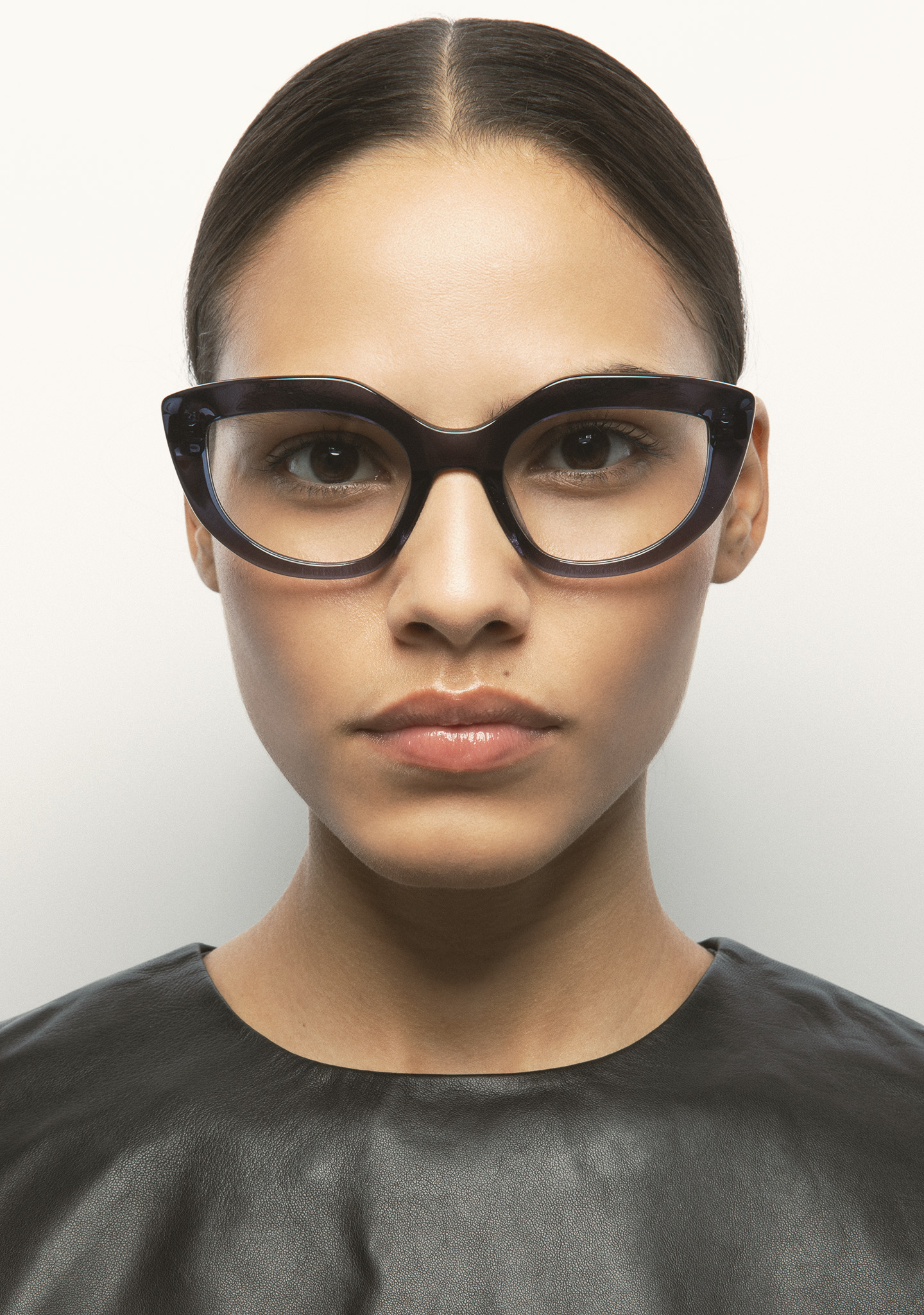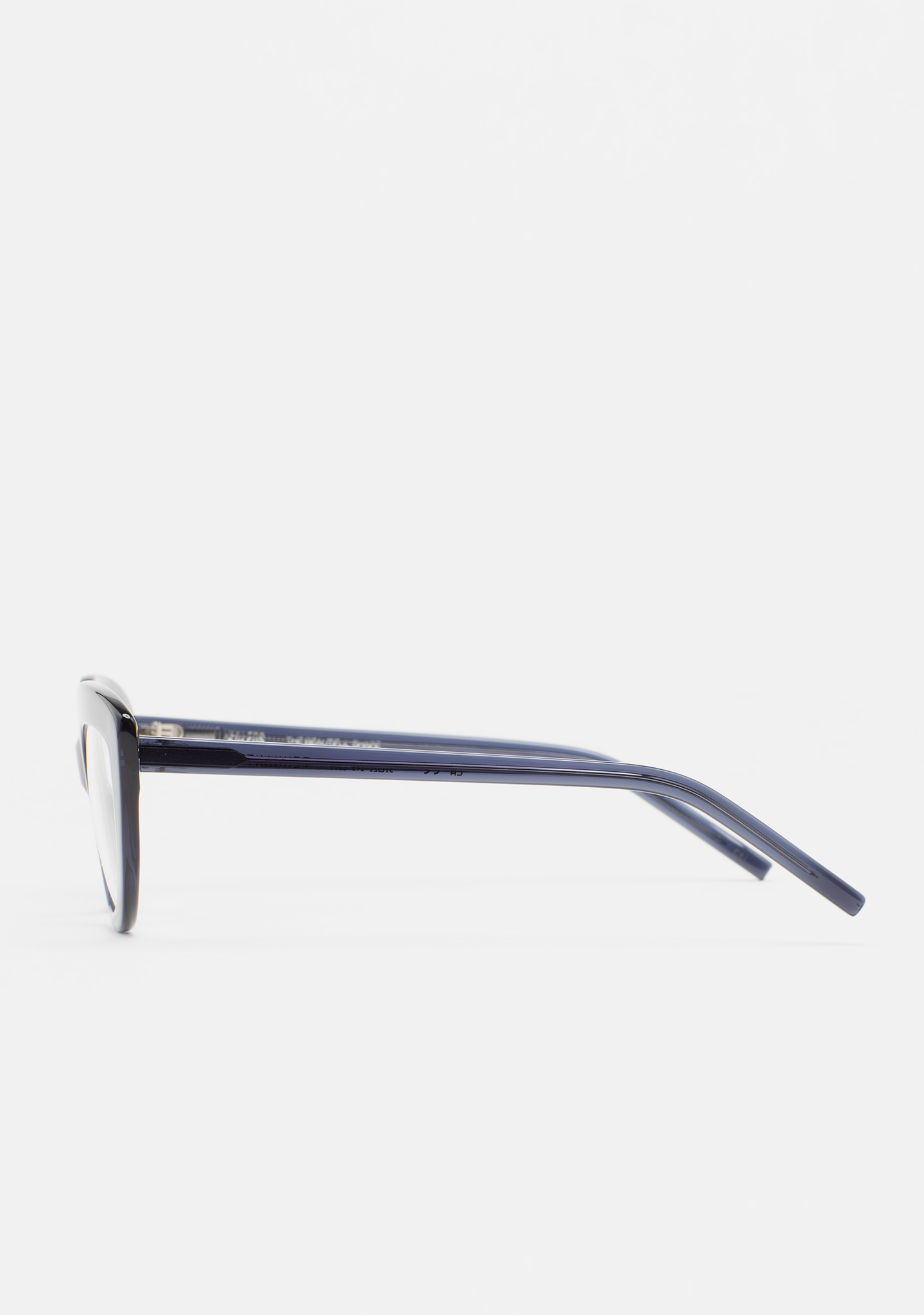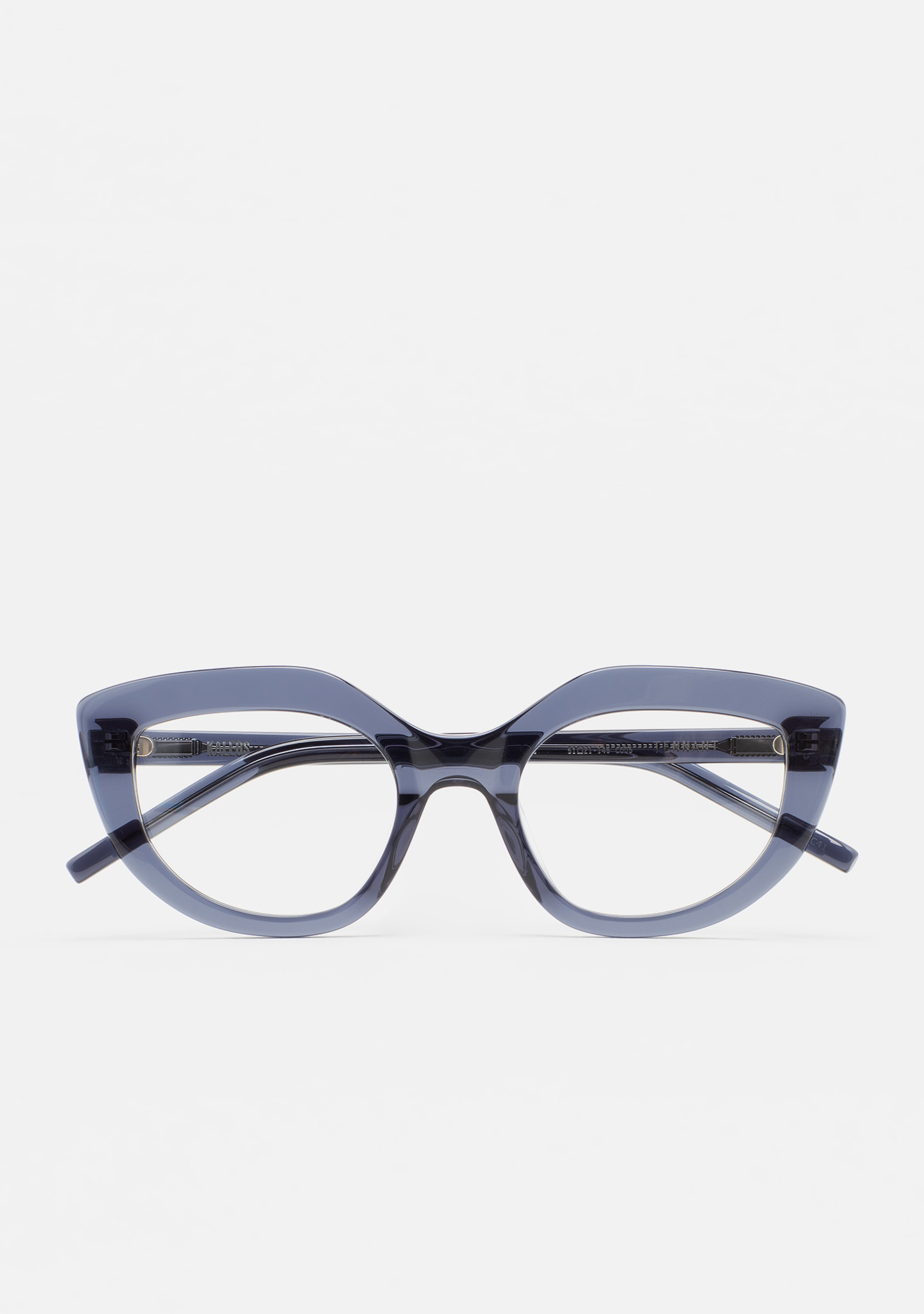 Cat-eye-shaped optical glasses. Transparent bluish-grey acetate front and temples. Built-in acetate nose pads. Handmade.