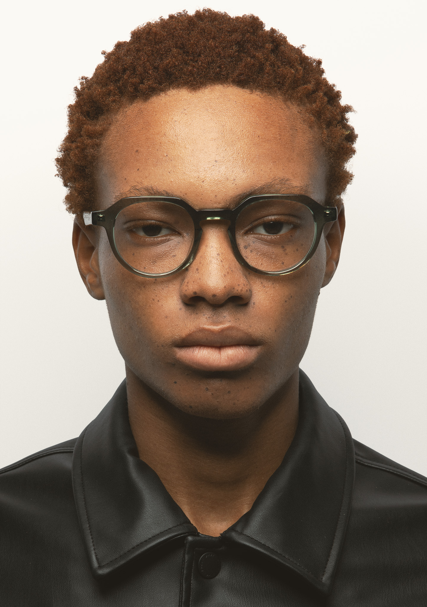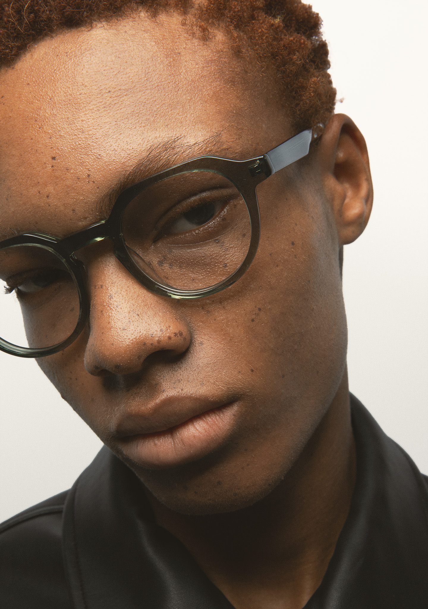 Pantos-shaped optical glasses with flat brow and keyhole bridge.Transparent green acetate frame front and temples. Built-in acetate nose pads. Handmade.