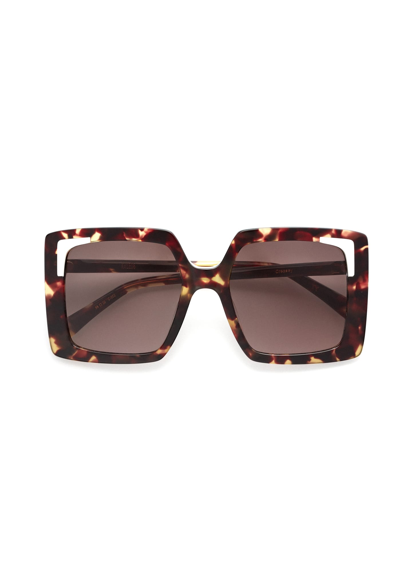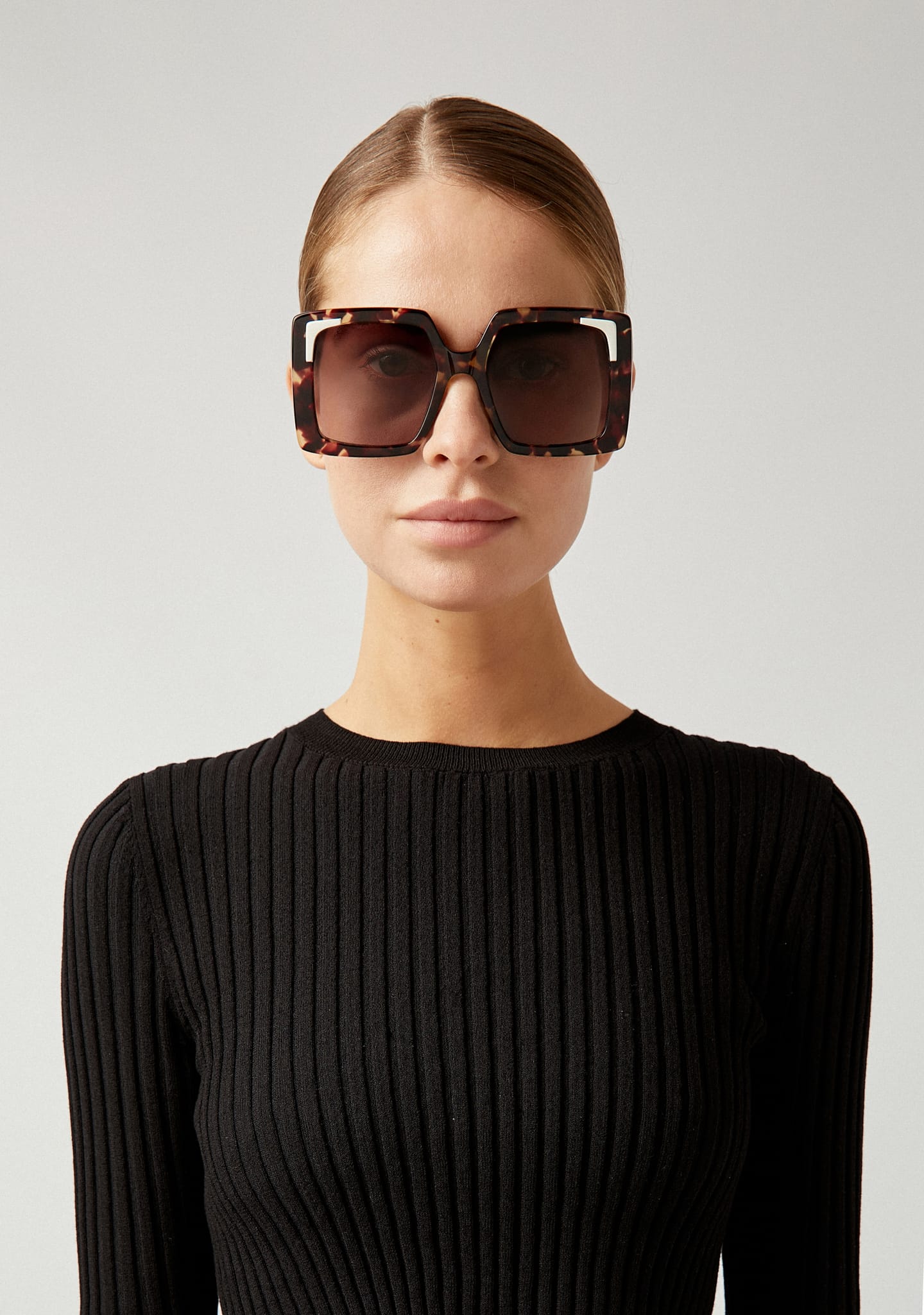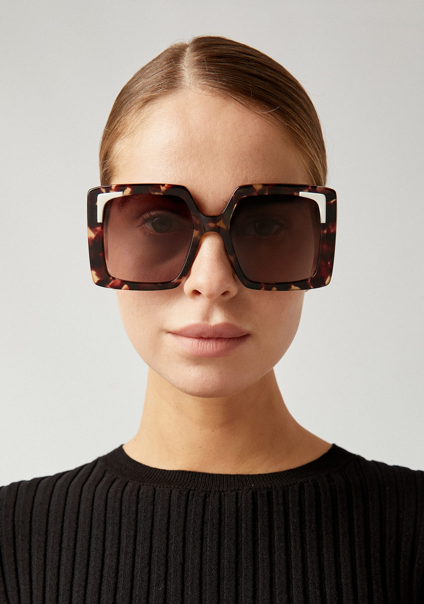 Sunglasses in dark brown tortoiseshell acetate with white laminate. Acetate arms. Grey gradient tint 4-base lenses with 100% UV protection. Built-in acetate nose pads. Handmade.