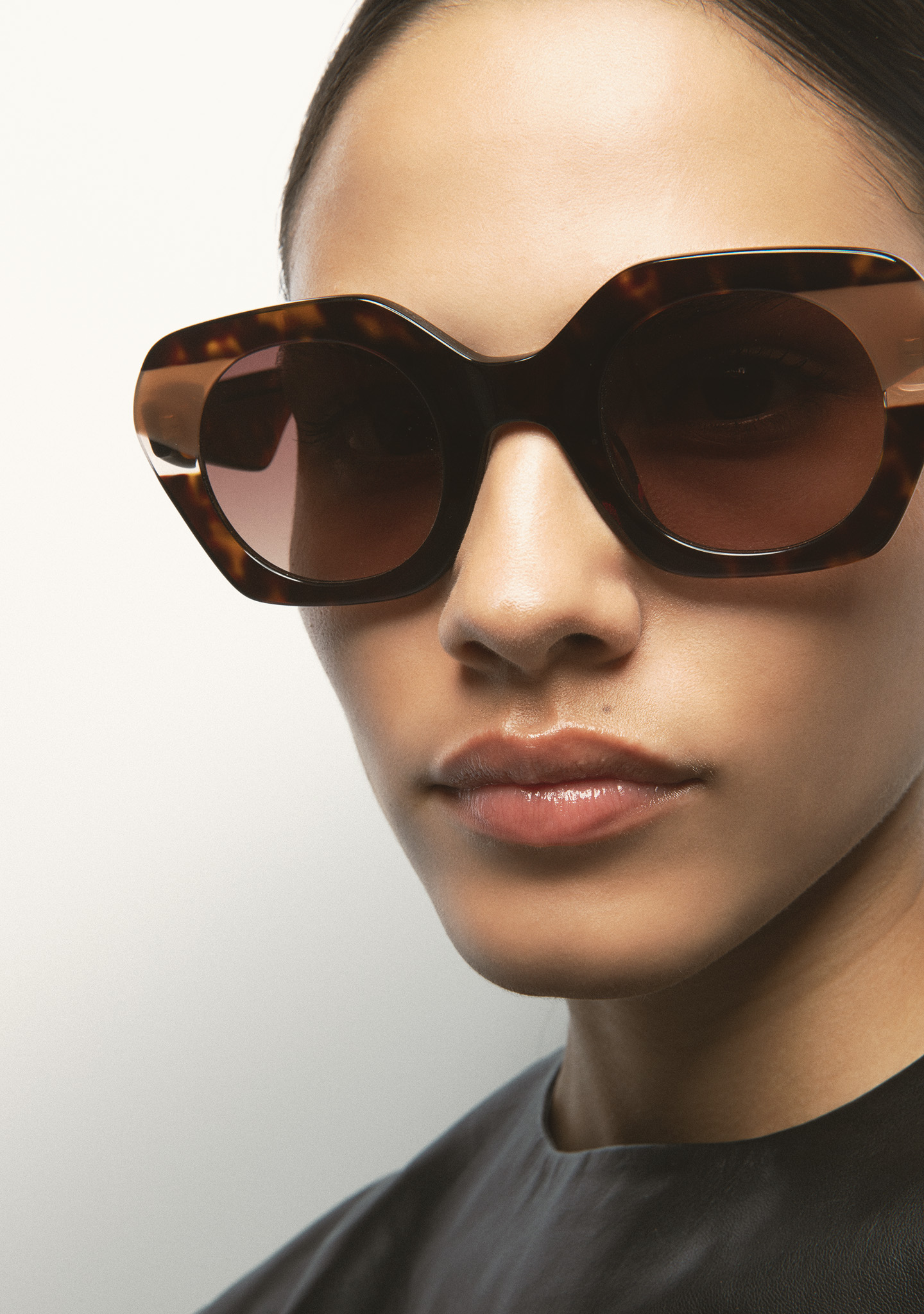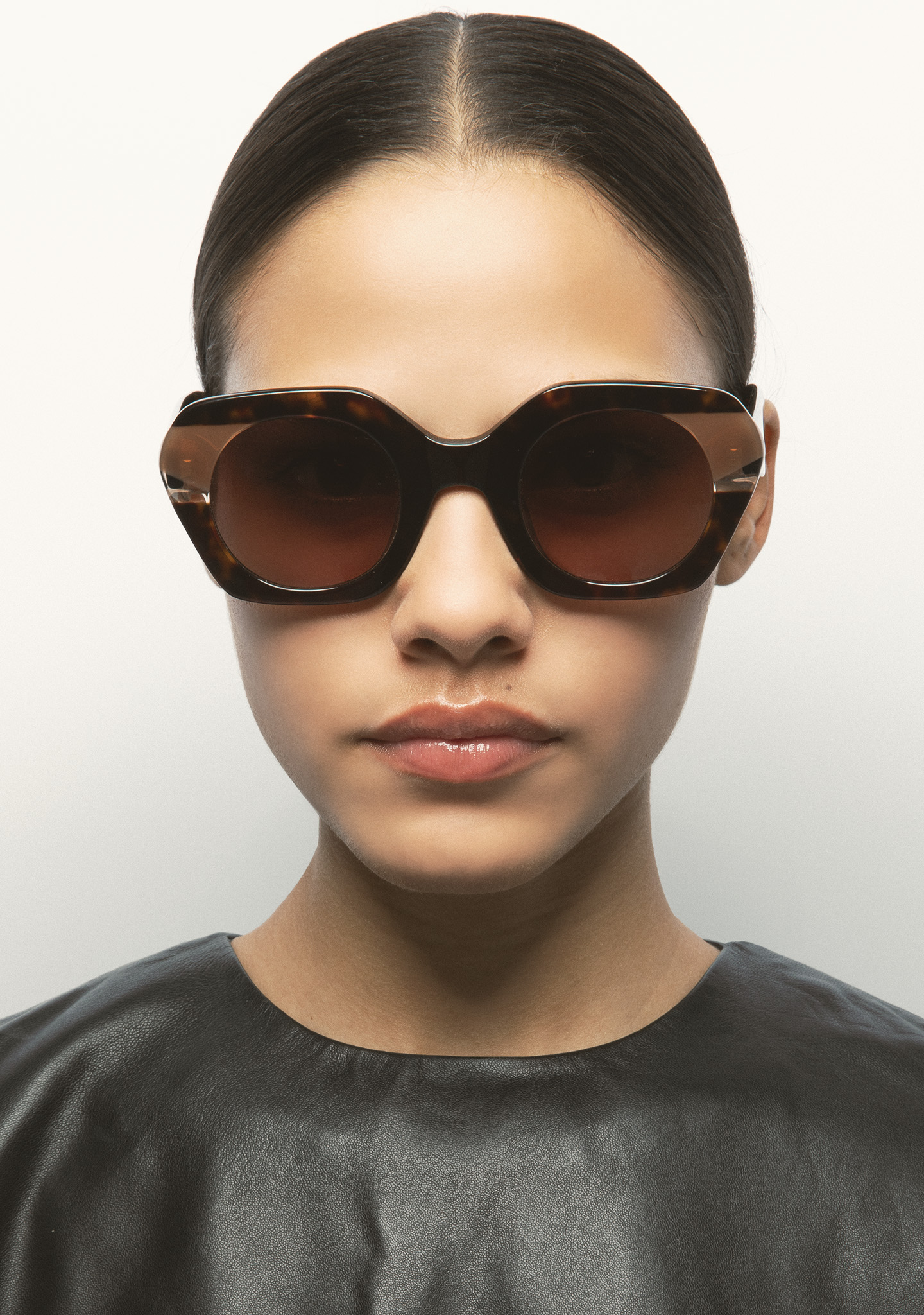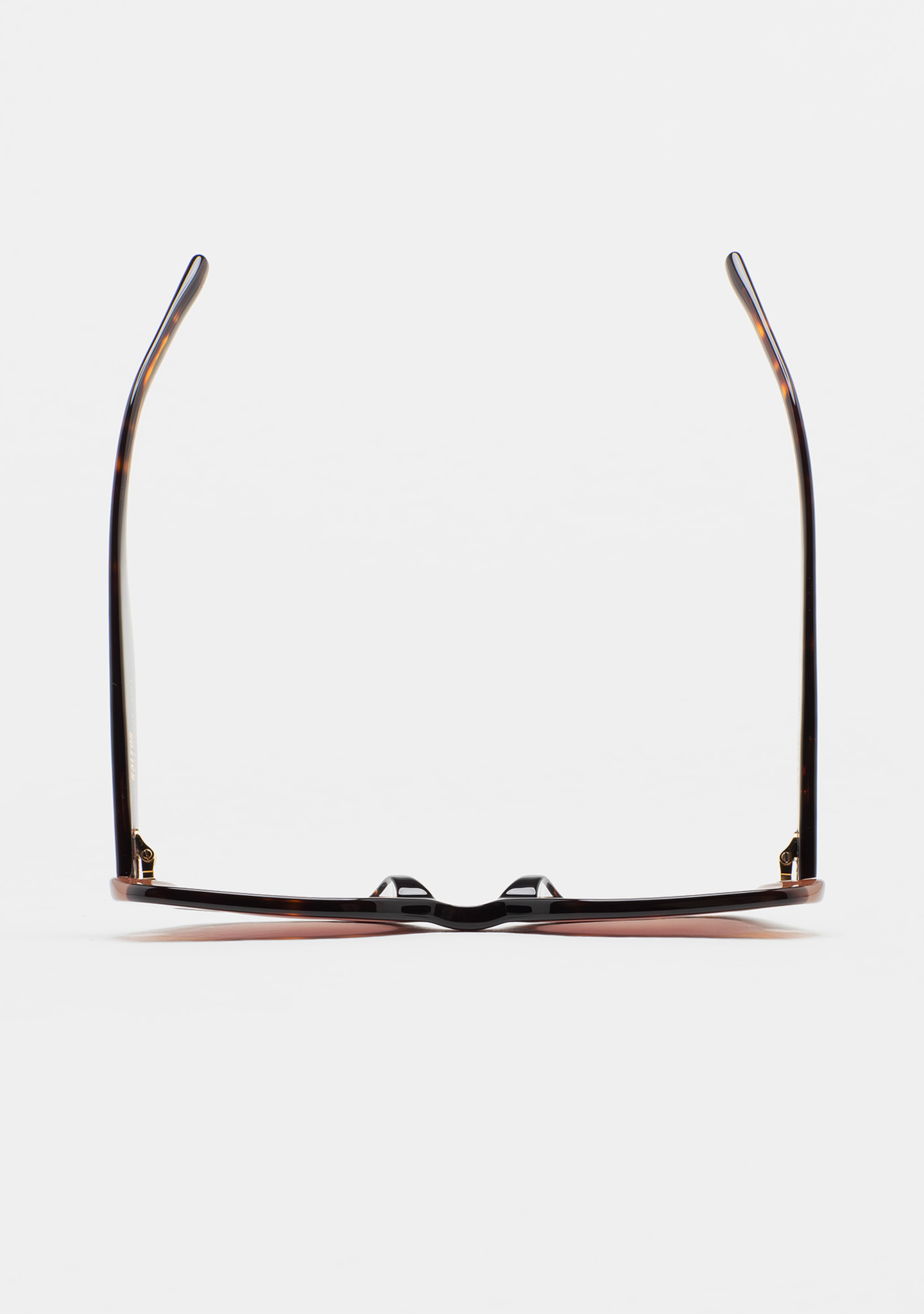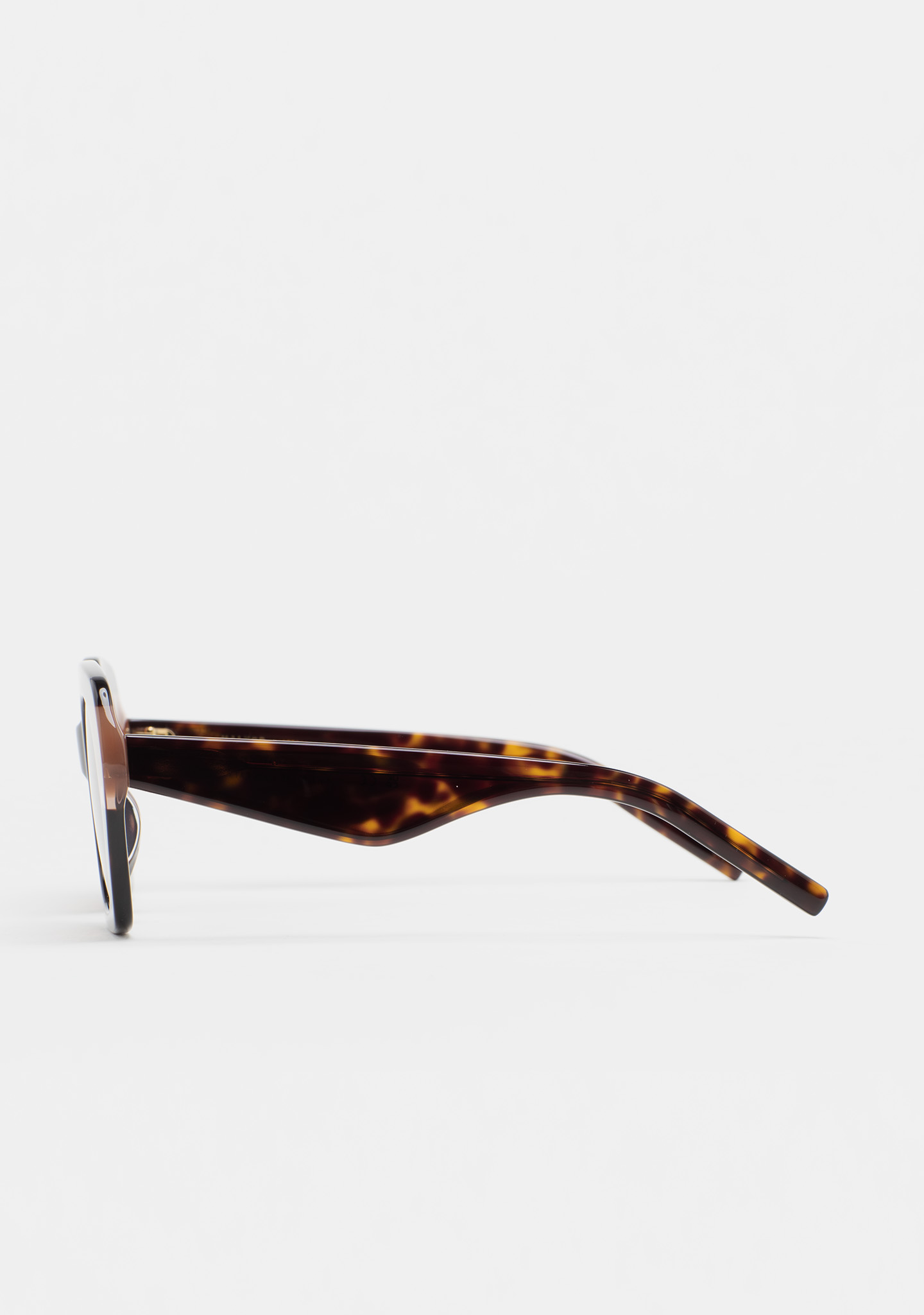Hexagonal-shaped sunglasses. Front made of dark Havana brown acetate with double laminate of translucent amber and transparent brown. Dark Havana brown acetate temples. Brown gradient lens, category 2, with 100% UV protection and anti-reflective coating. Category 3 lens. Integrated acetate nose pads. Handmade.