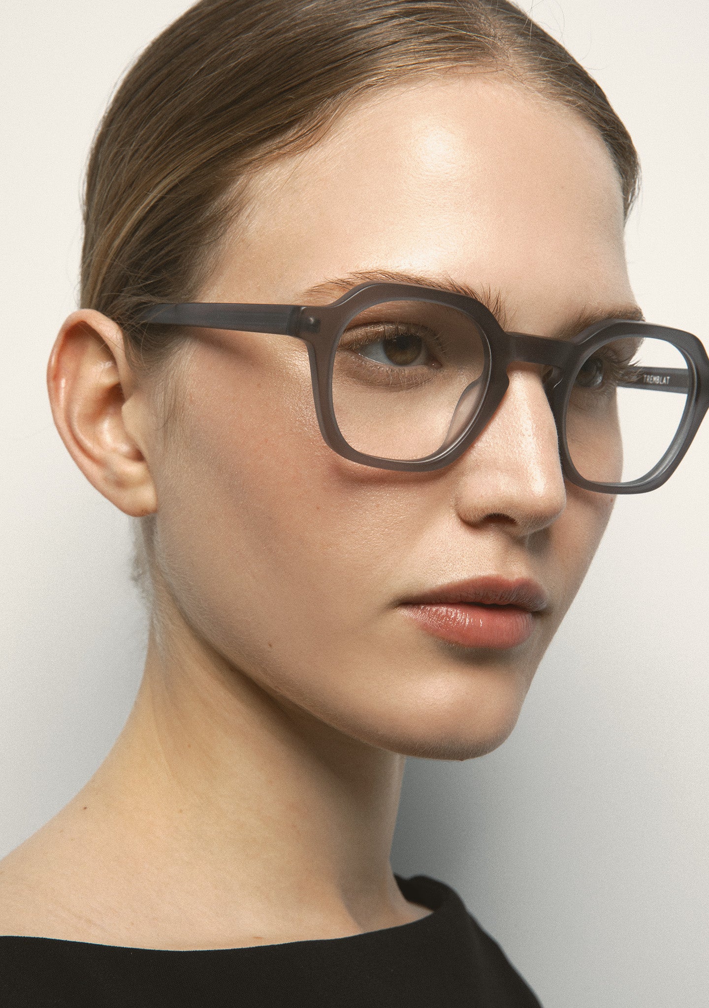 Gafas de ver de forma cuadrada. Diseño con detalles que marcan la diferencia. Frontal y varillas de acetato gris transparente mate. Plaquetas de acetato incorporadas. Hecha a mano.