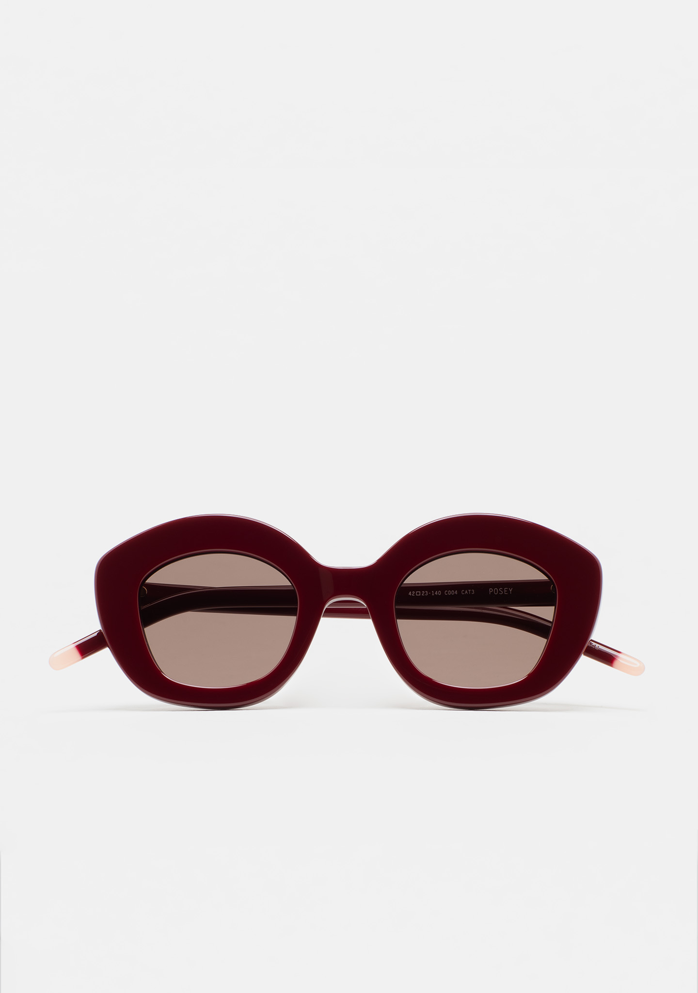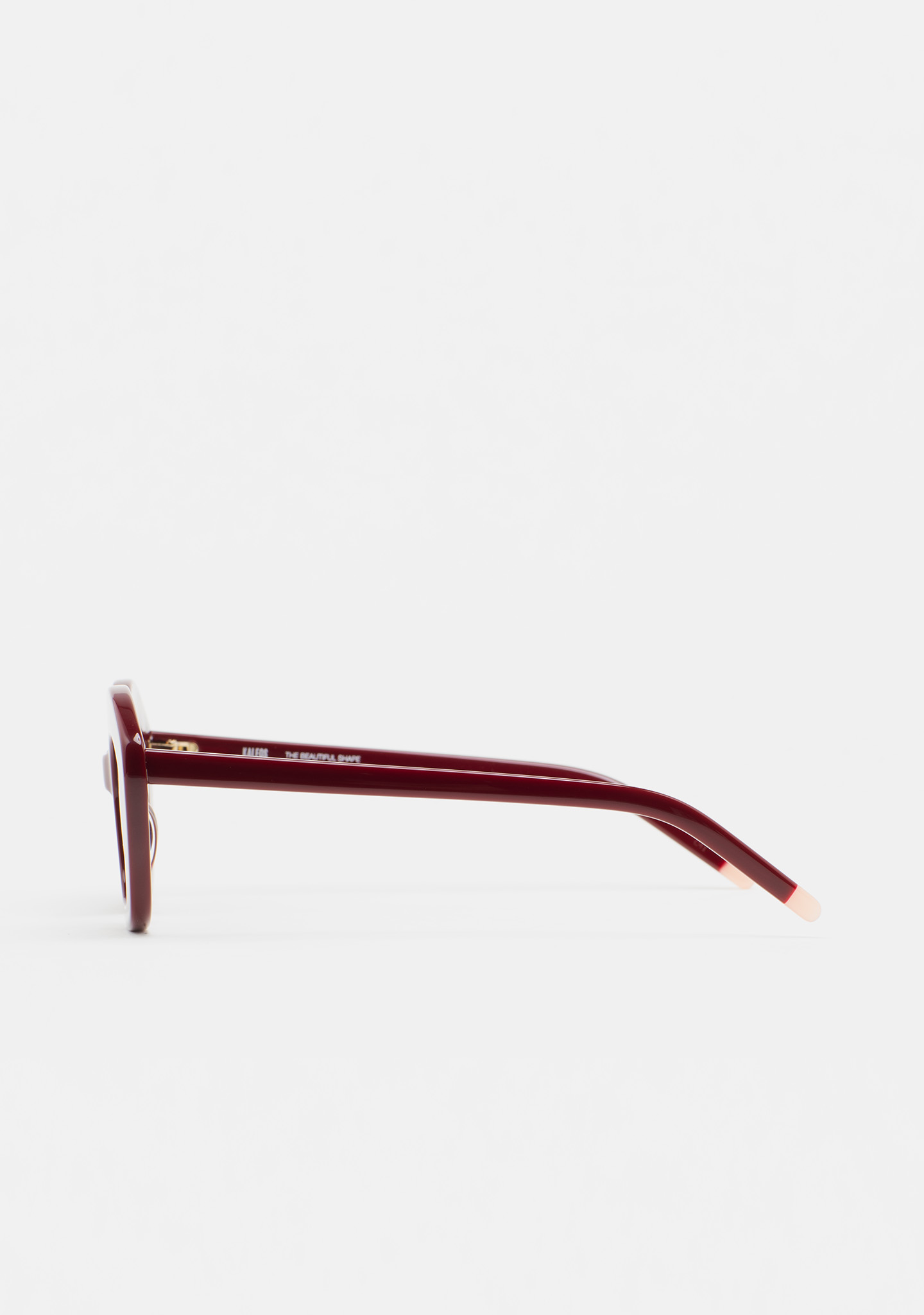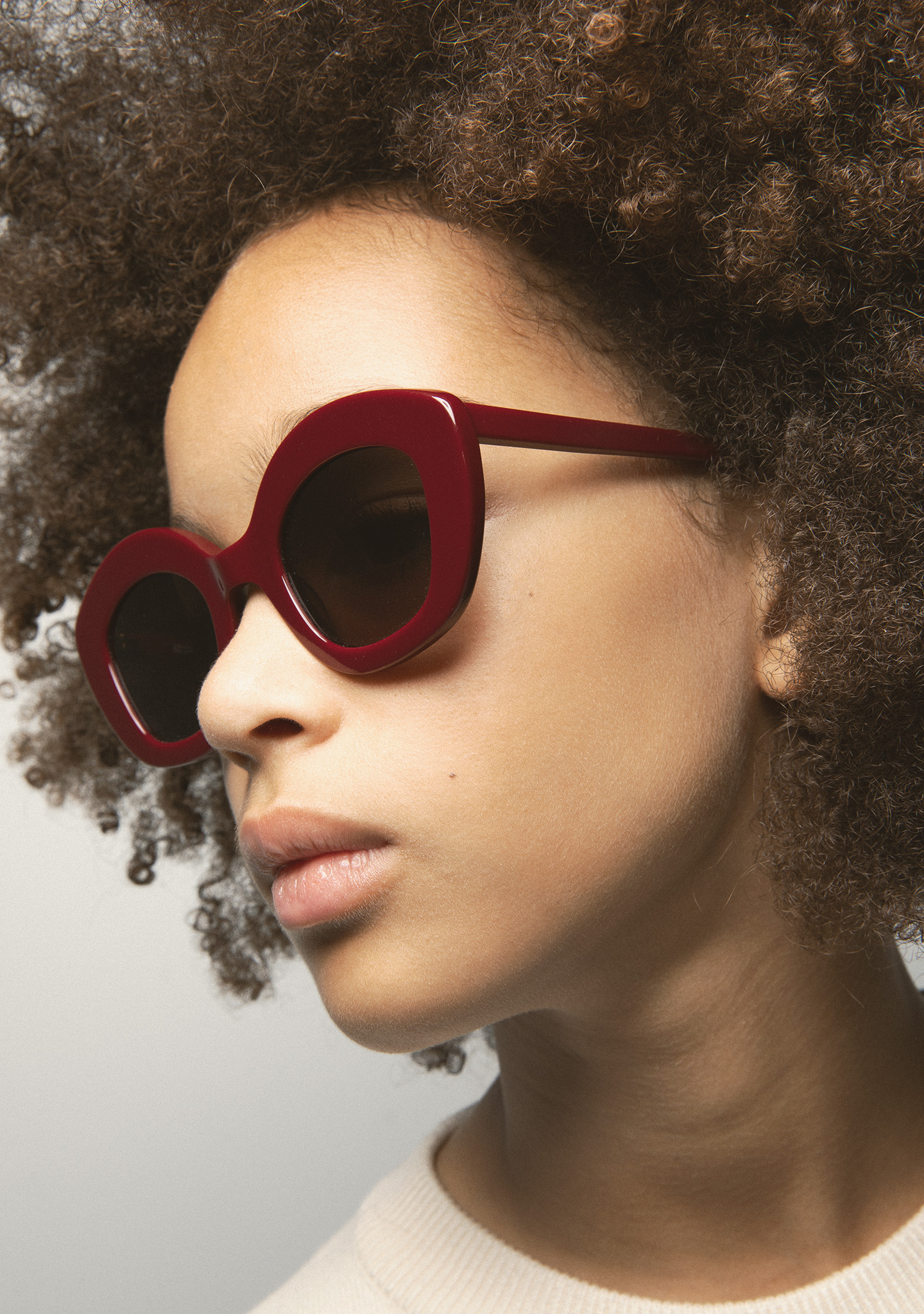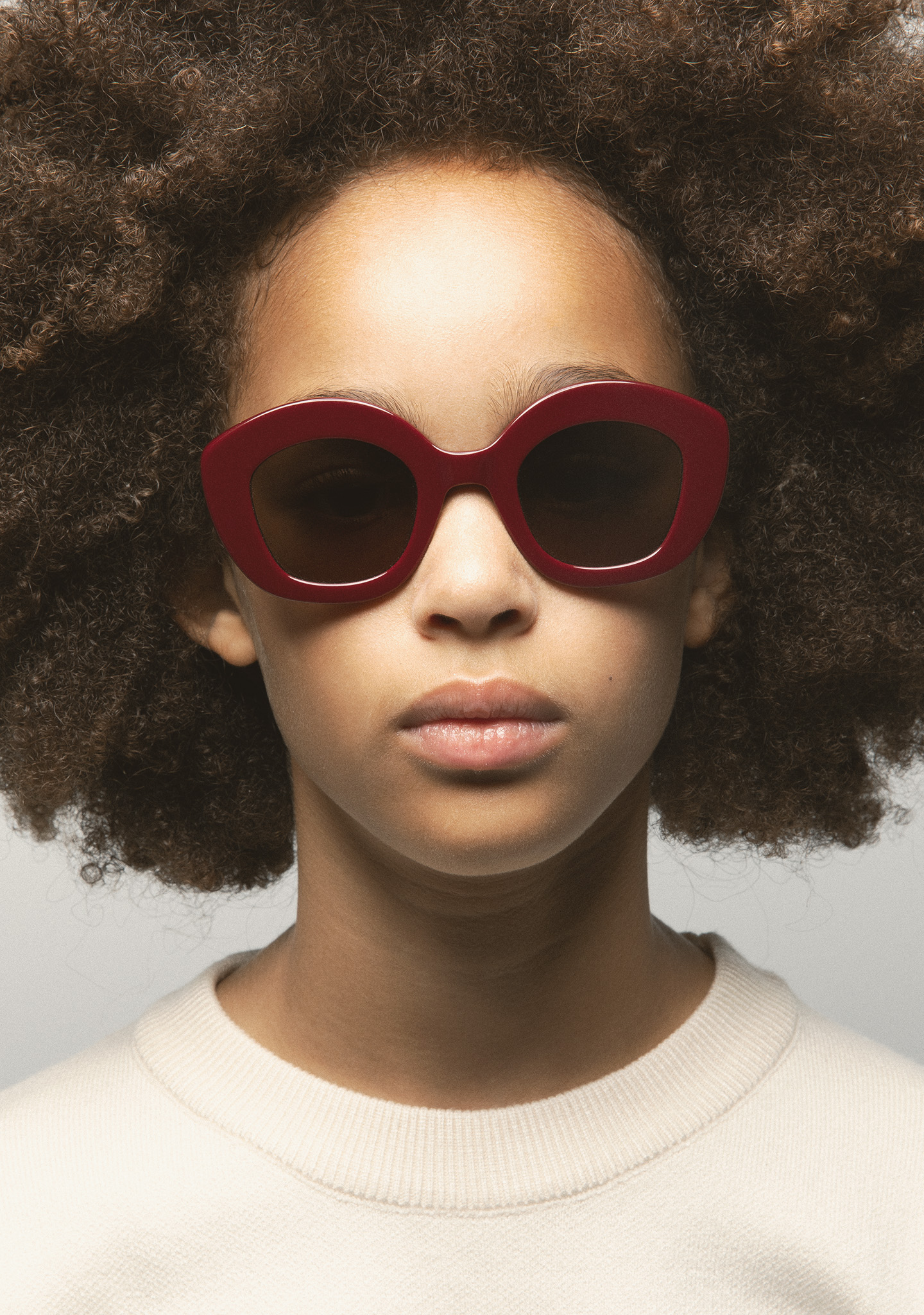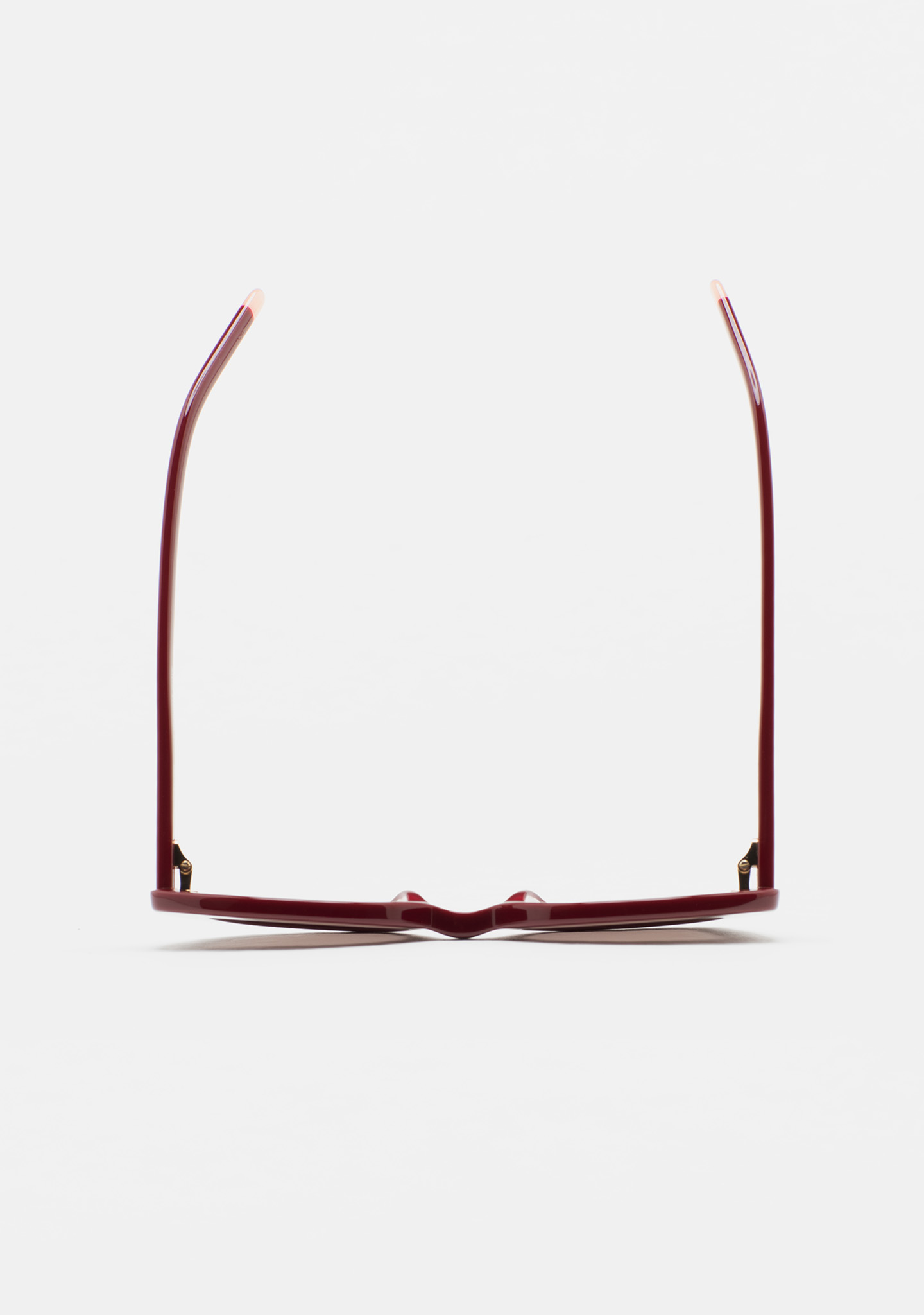 Gafa de sol KIDS de forma mariposa. Frontal y varillas de acetato burdeos. Varillas con terminal rosa claro translúcido. Lente gris base 2 con 100% protección UV y tratamiento antirreflejante. Lente categoría 3. Plaquetas de acetato incorporadas. Hecha a mano.