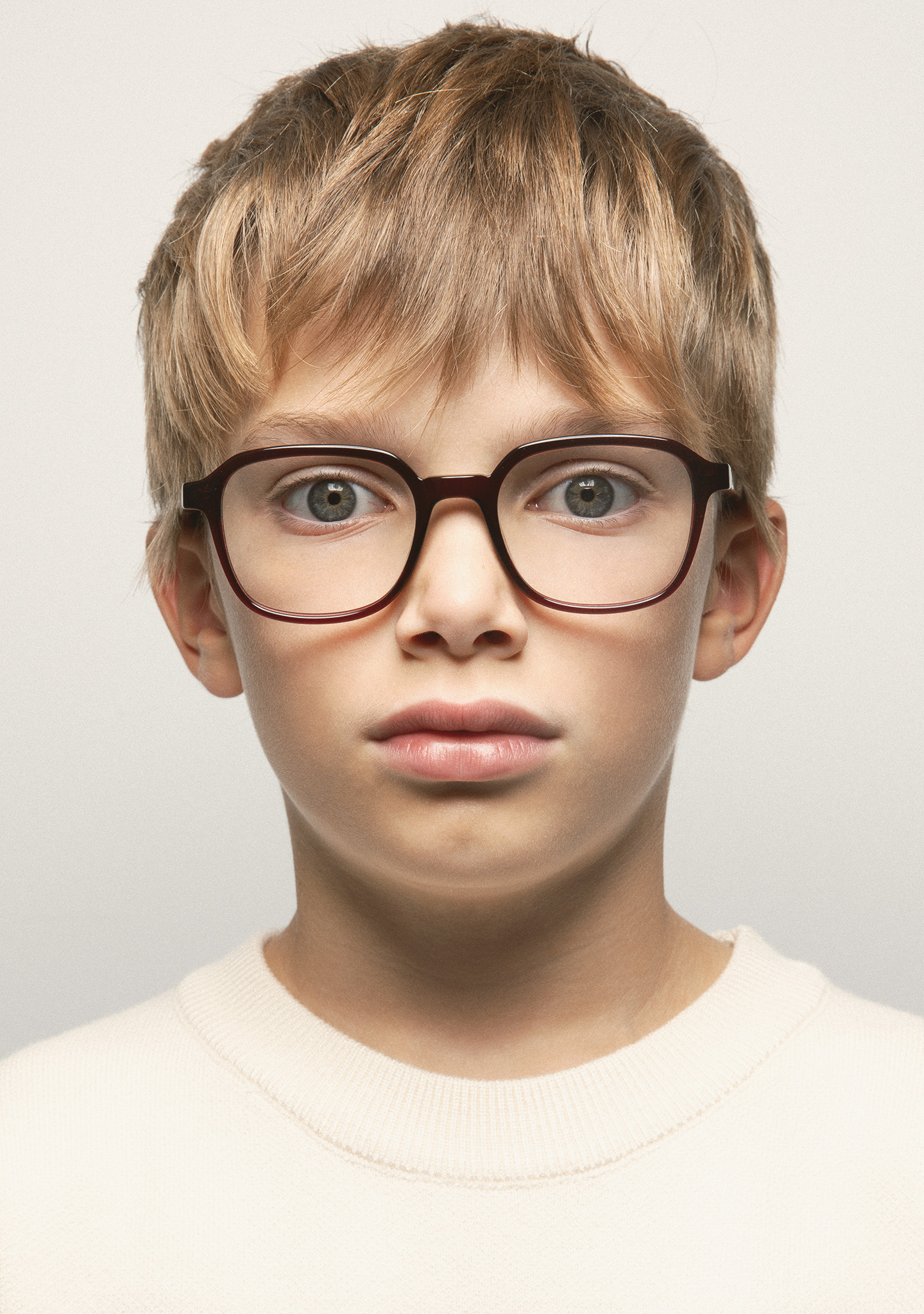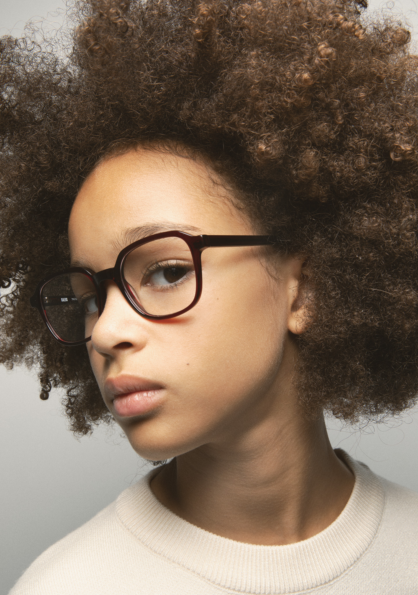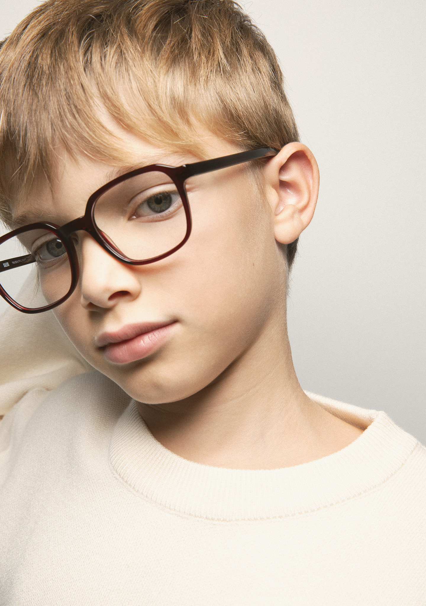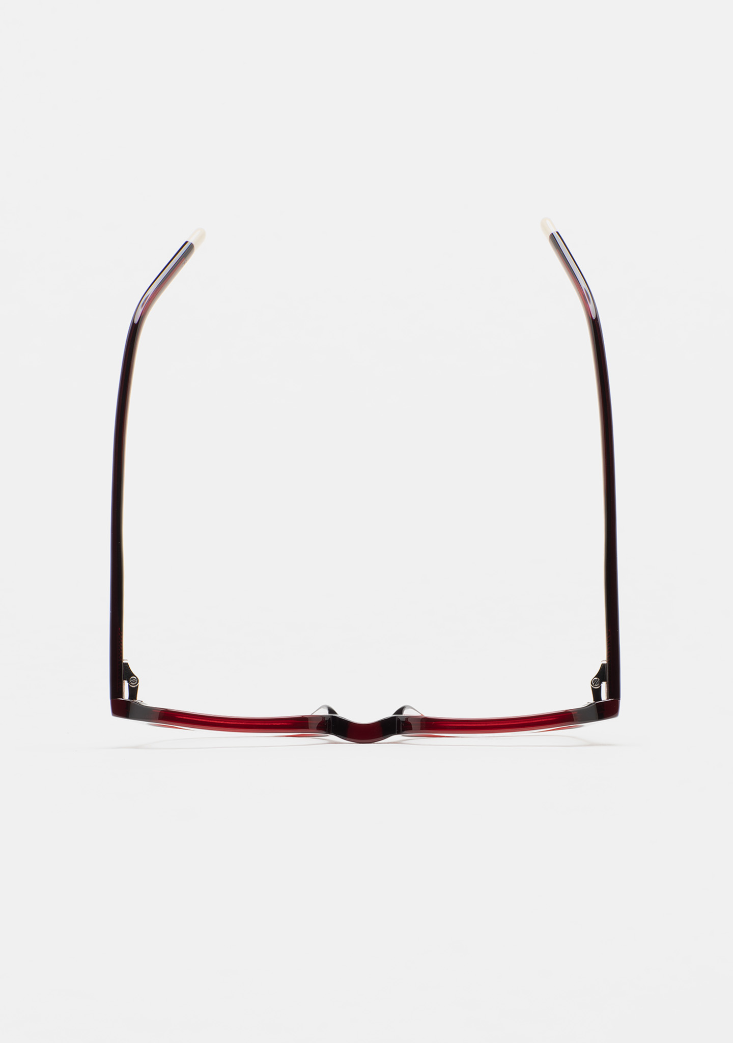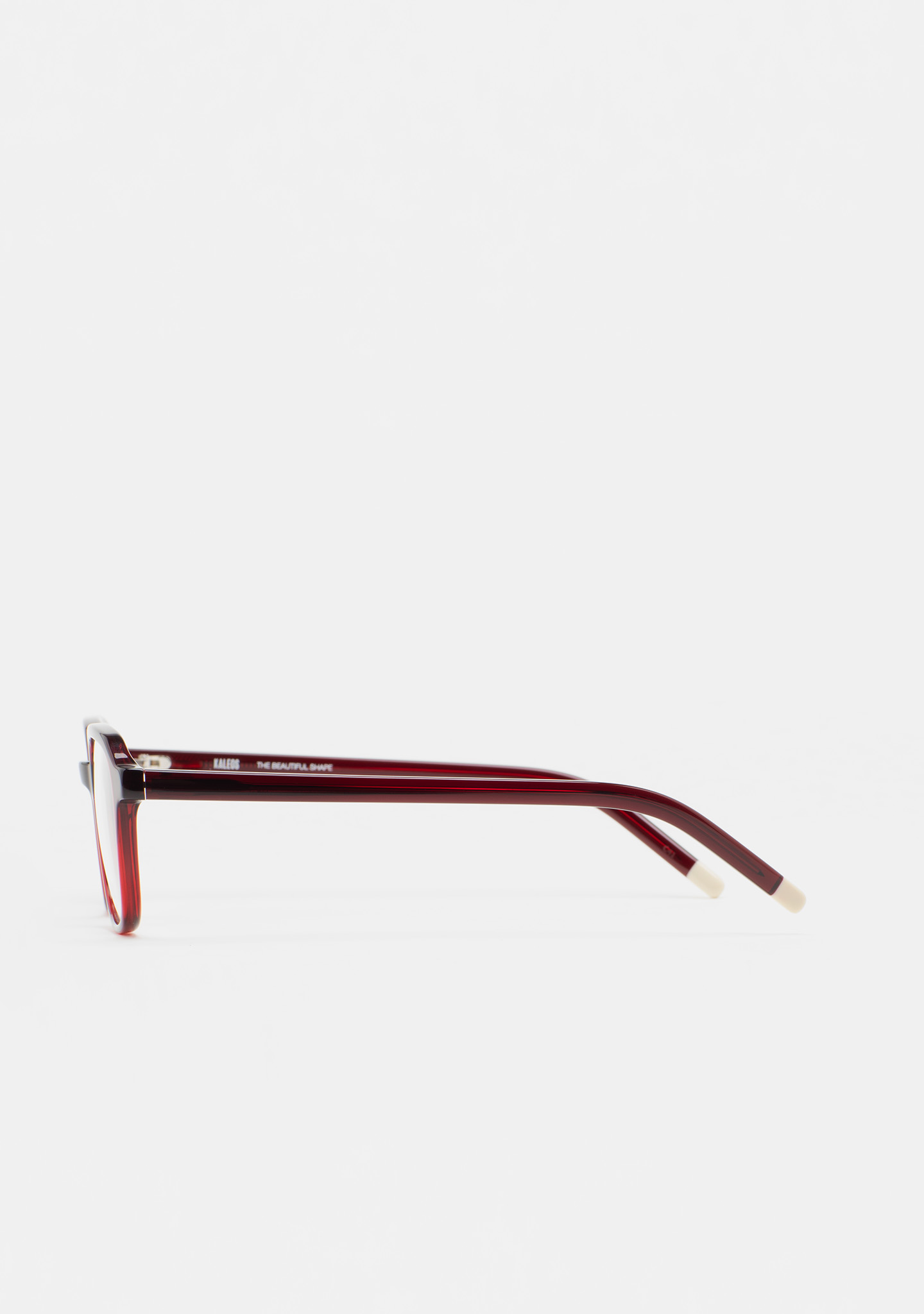 Gafa de ver KIDS de forma rectangular. Frontal y varillas de acetato burdeos transparente. Varillas con terminal beige. Plaquetas de acetato incorporadas. Hecha a mano.