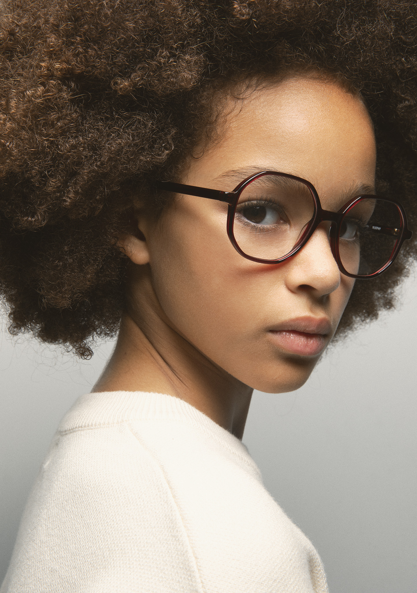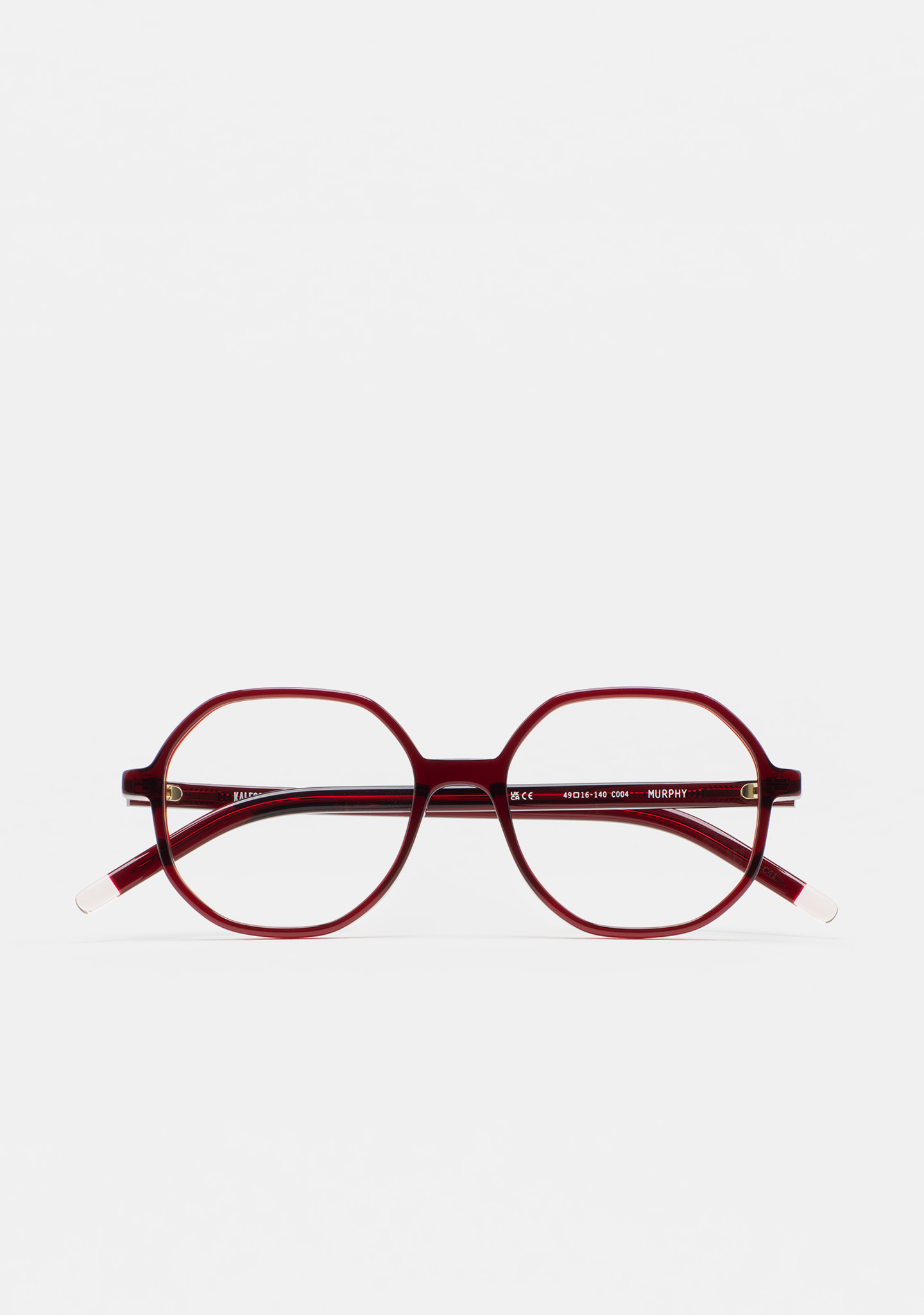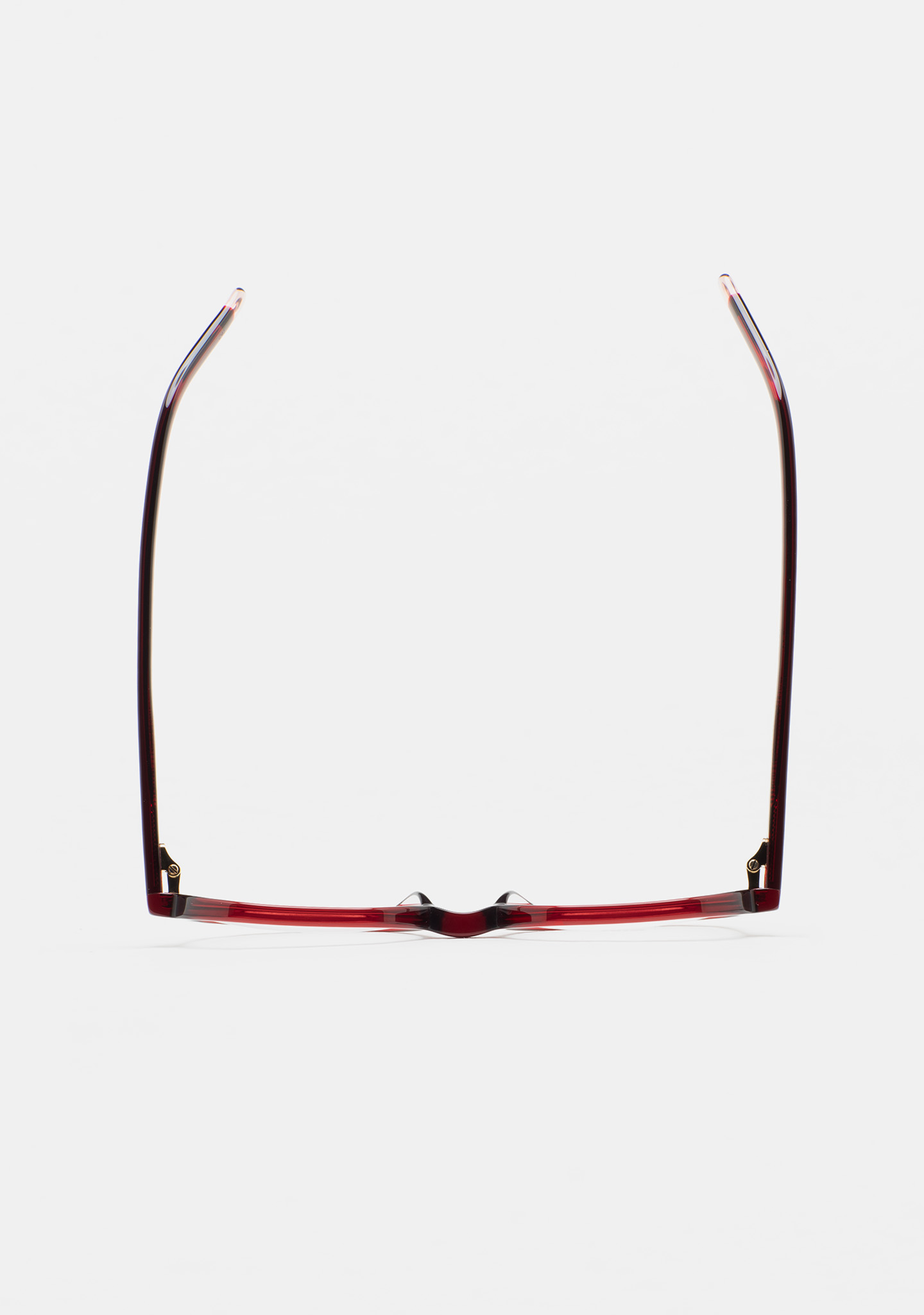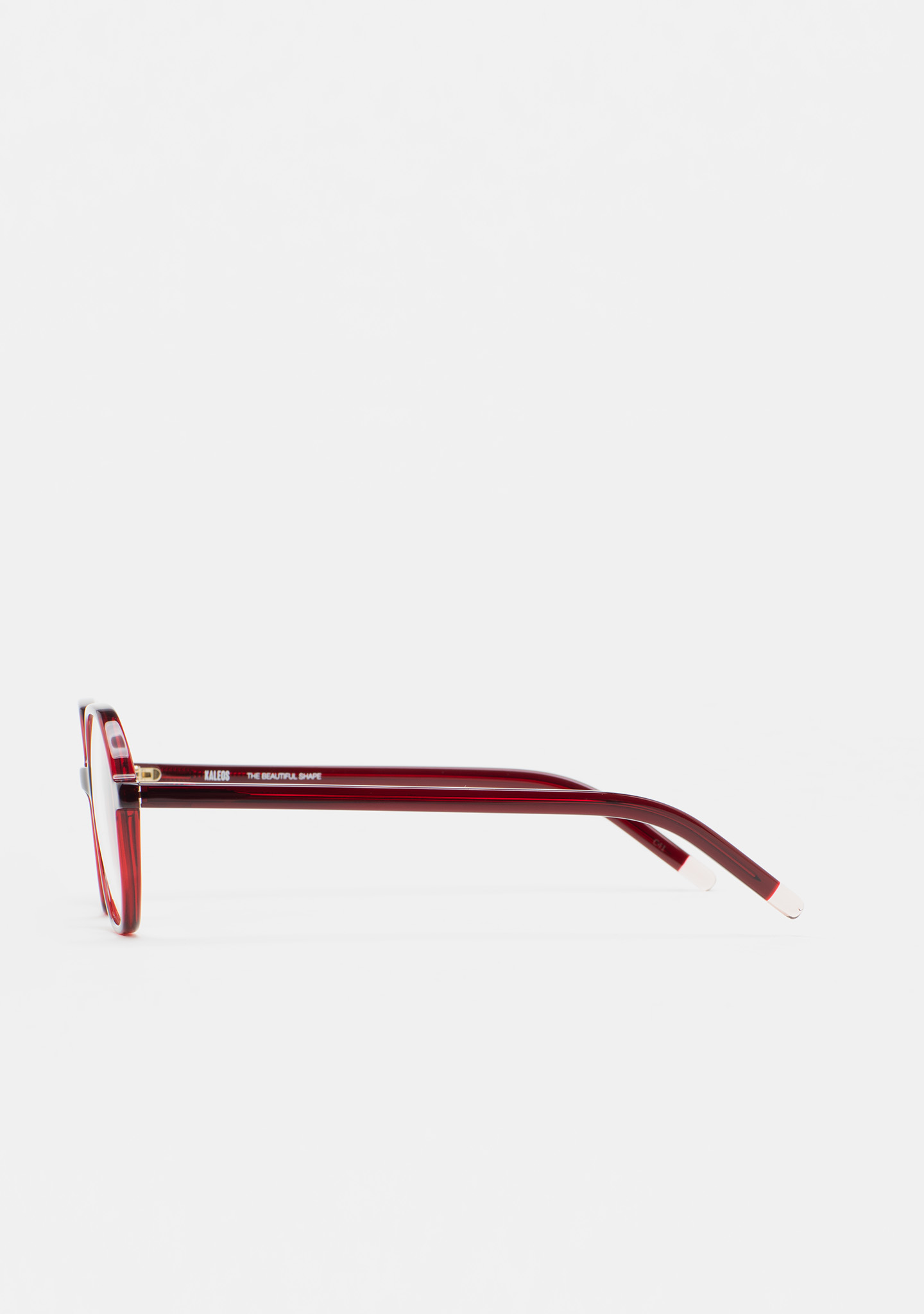 Gafa de ver KIDS de forma hexagonal. Frontal y varillas de acetato burdeos transparente. Varillas con terminal rosa claro transparente. Plaquetas de acetato incorporadas. Hecha a mano.