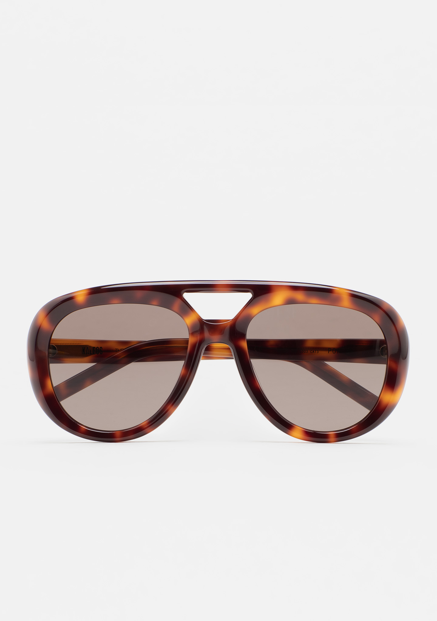 Gafa de sol de forma aviador con fresado en todo el frontal de la gafa. Frontal y varillas de acetato havana marrón oscuro. Lente gris degradada base 2 con 100% protección UV y tratamiento antirreflejante. Lente Categoría 3. Plaquetas de acetato incorporadas. Hecha a mano.