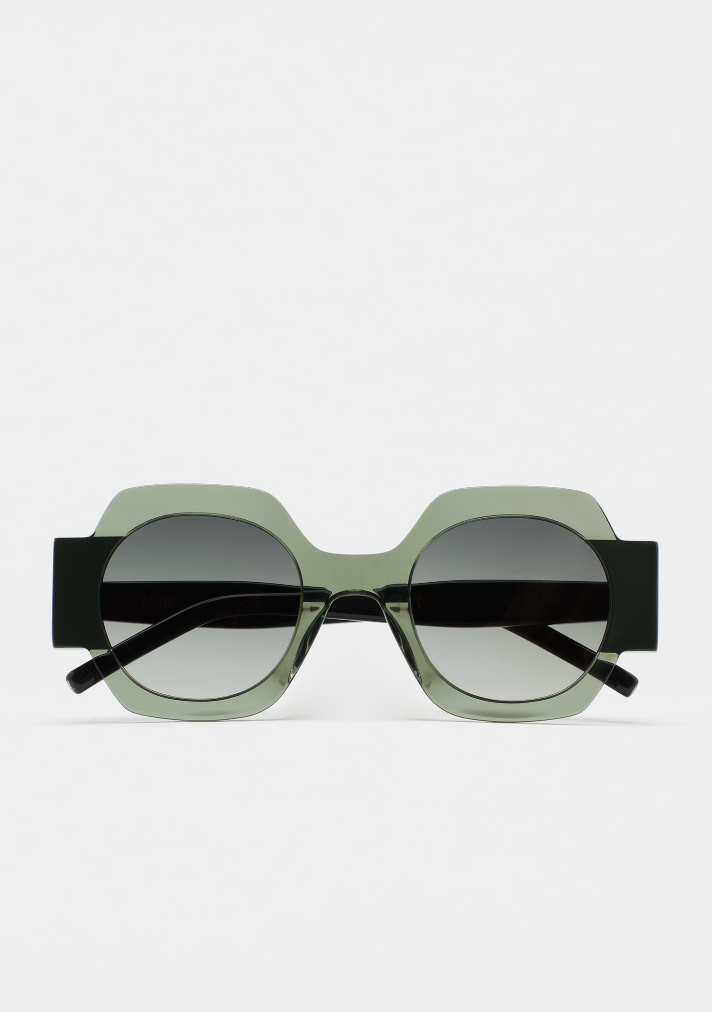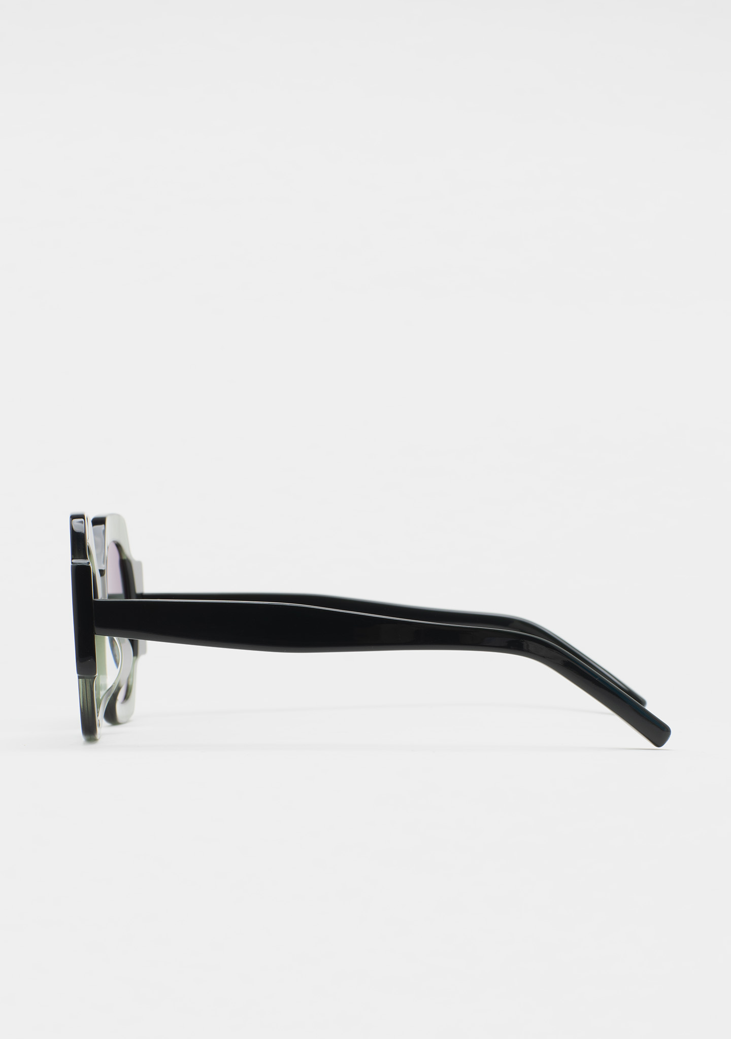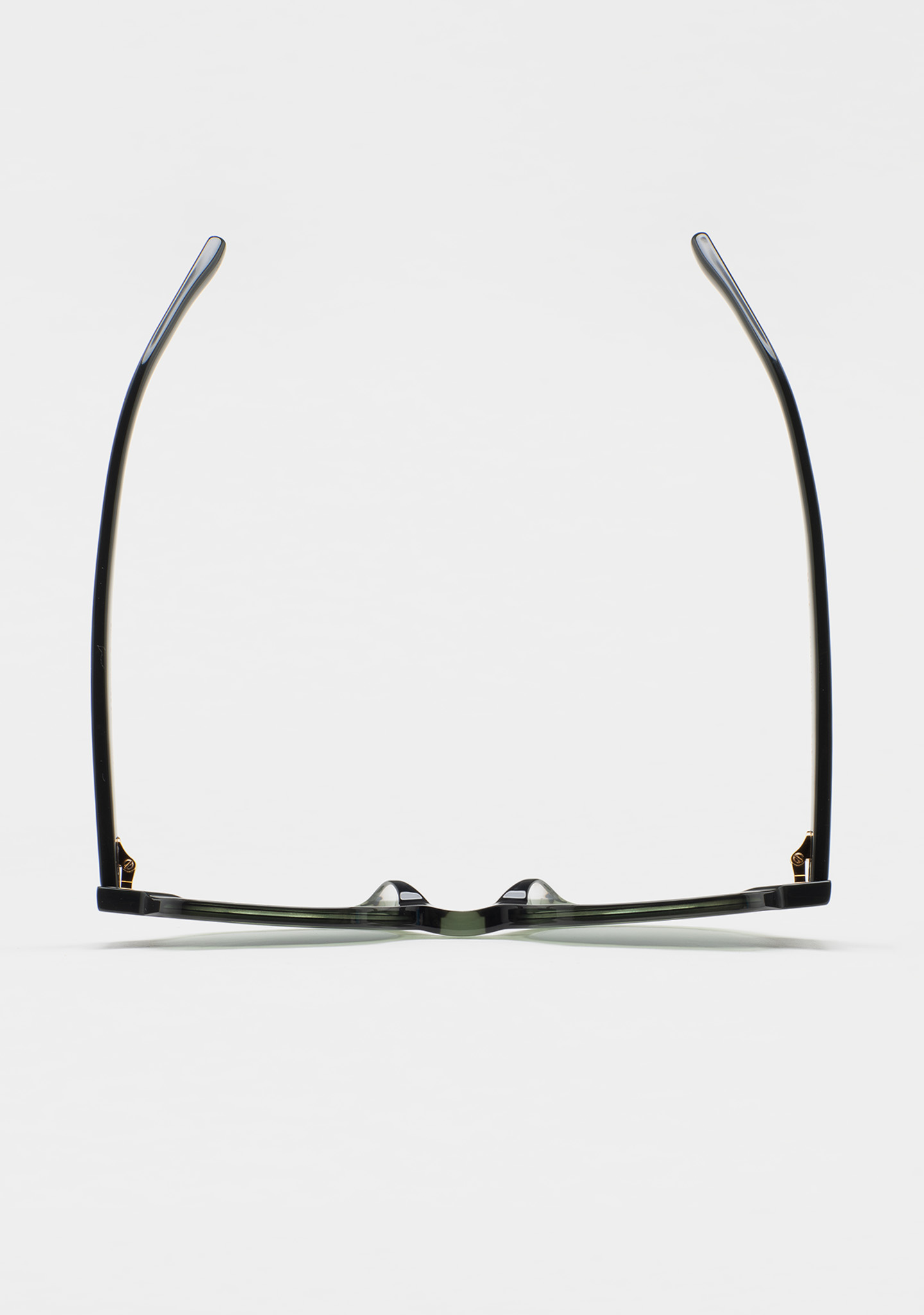 Gafa de sol de forma cuadrada. Frontal de acetato verde transparente con laminado verde oscuro. Varillas de acetato verde oscuro. Lente verde degradada base 2 con 100% protección UV y tratamiento antirreflejante. Lente Categoría 2. Plaquetas de acetato incorporadas. Hecha a mano.