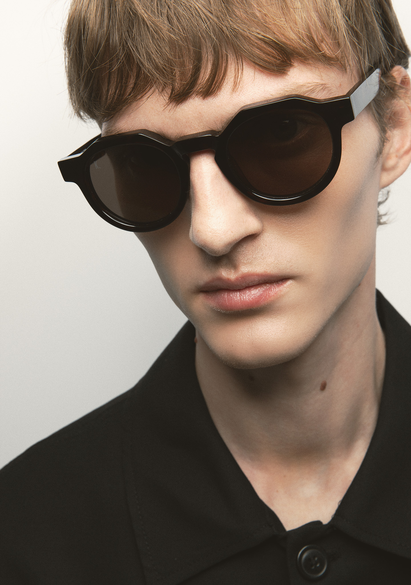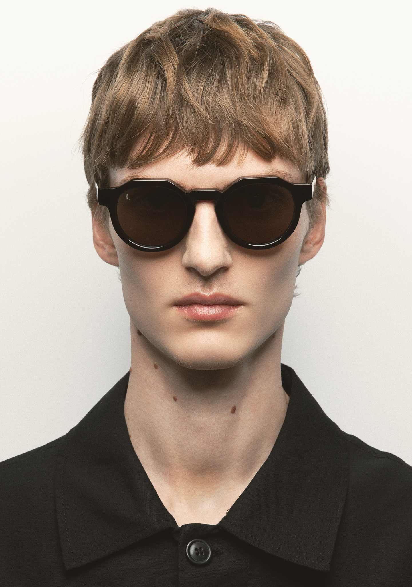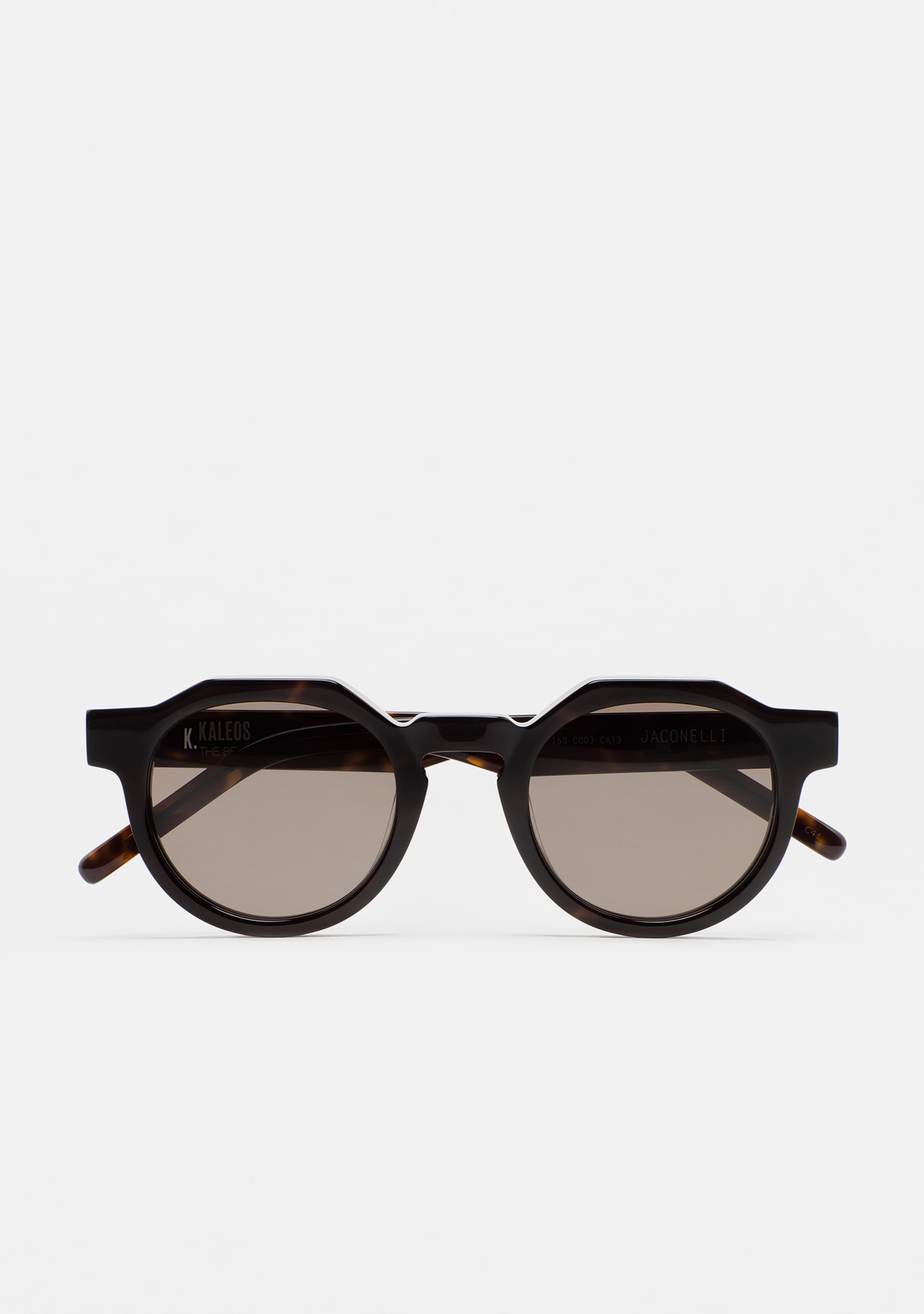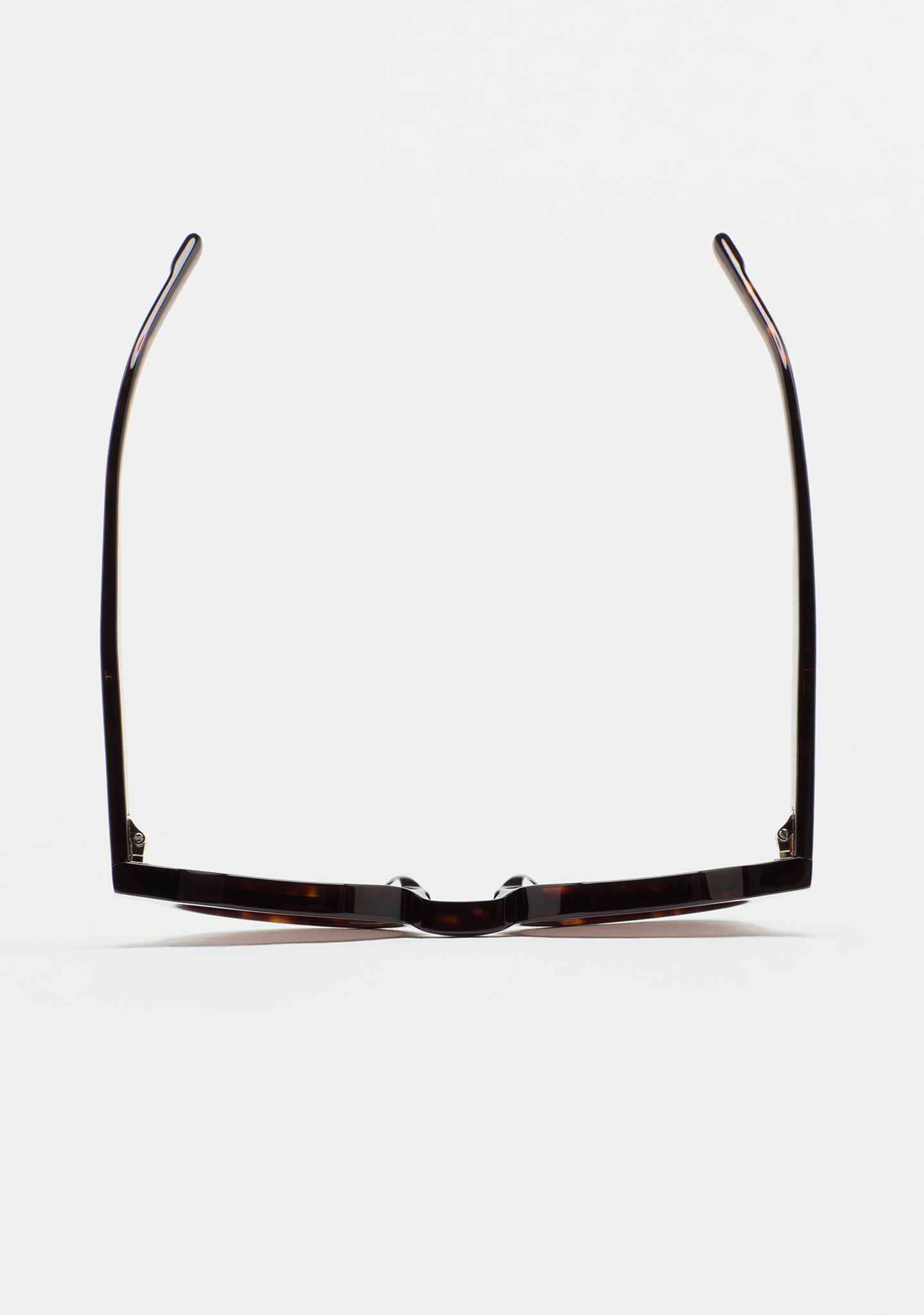 Gafa de sol de forma pantos con ceja plana y puente en llave. Frontal y varillas de acetato havana marrón oscuro. Lente gris degradada base 2 con 100% protección UV y tratamiento antirreflejante. Lente Categoría 3. Plaquetas de acetato incorporadas. Hecha a mano.