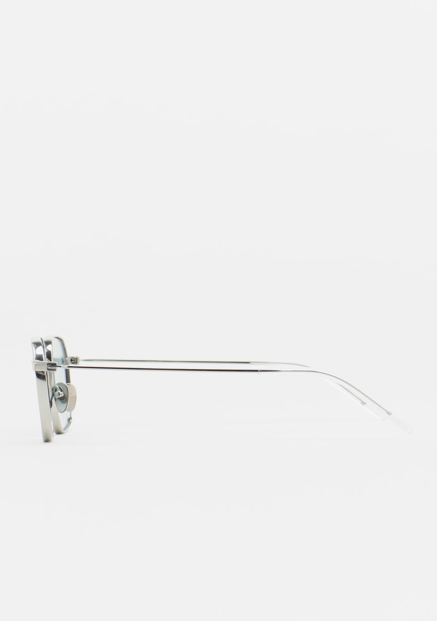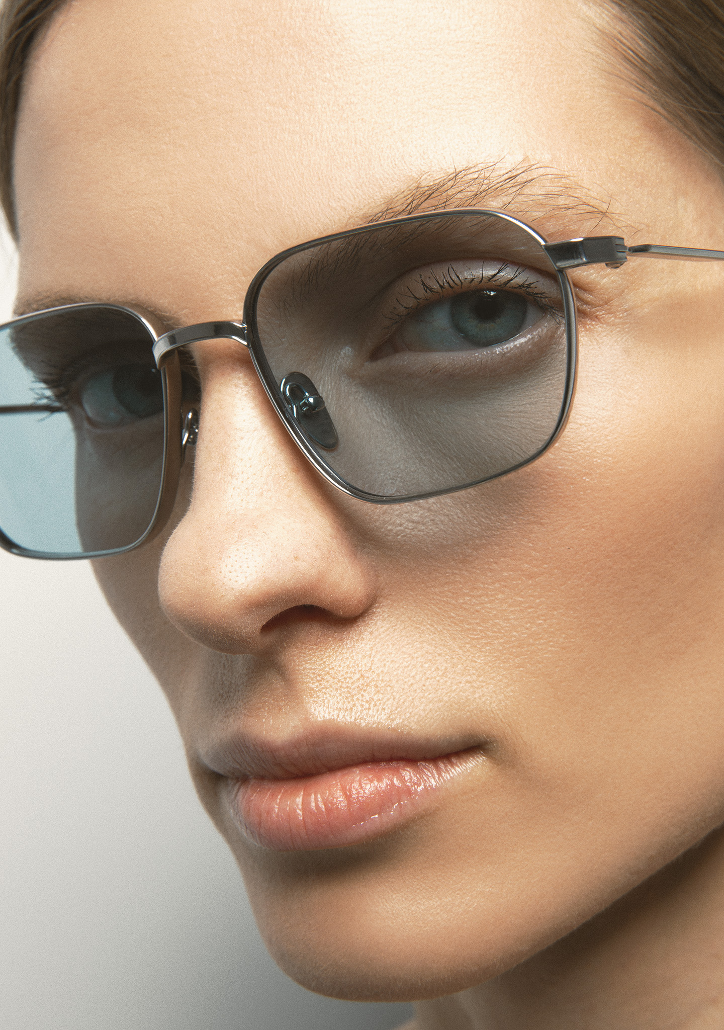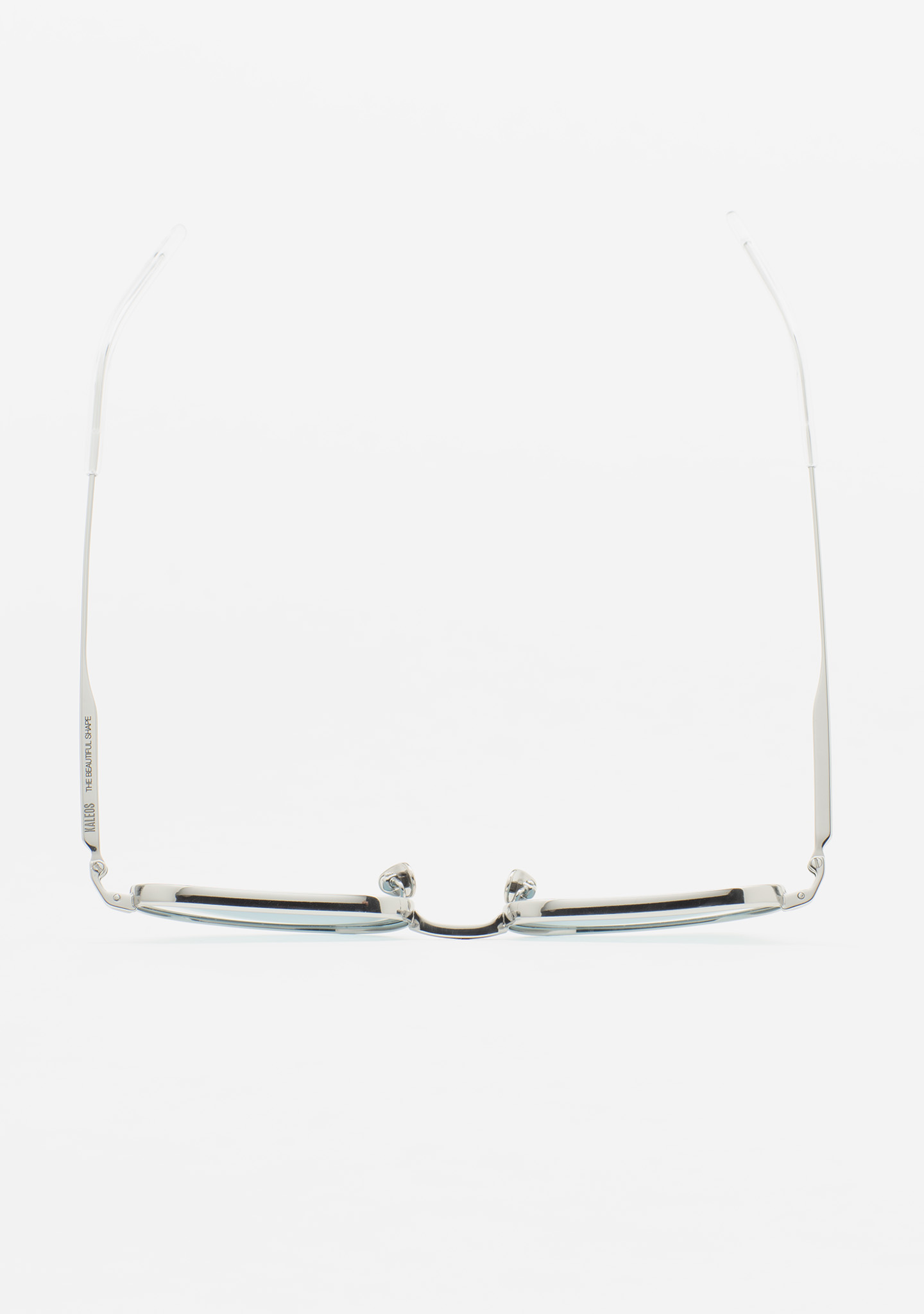 Gafas de sol de forma rectangular. Diseño pensado para impactar con sutileza. Frontal y varillas de titanio plata. Varillas con terminal de acetato cristal transparente. Lente azul fotocromática base 2 con protección UV y tratamiento antirreflejante. Lente categoría 1-3. Plaquetas incorporadas. Hecha a mano.