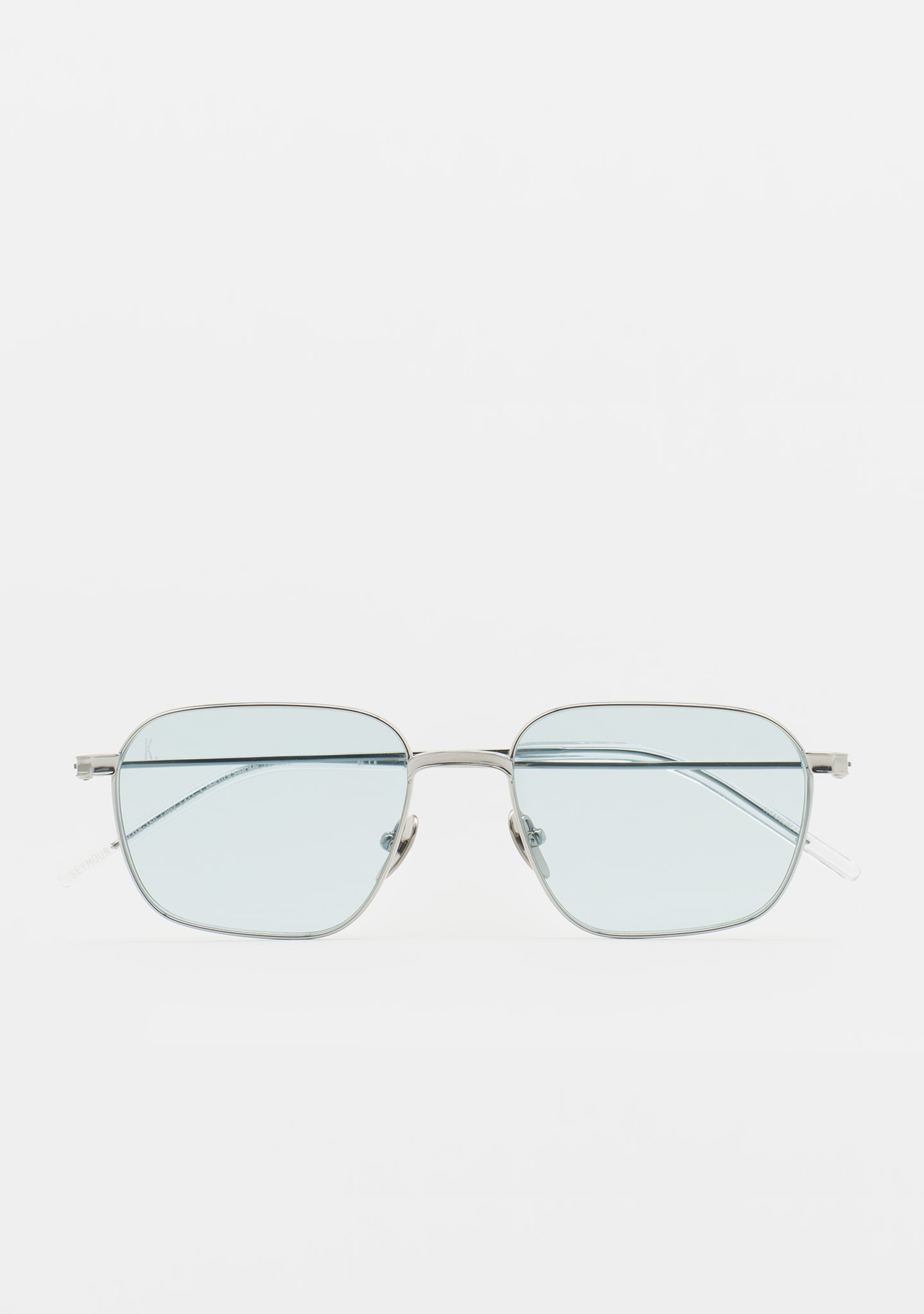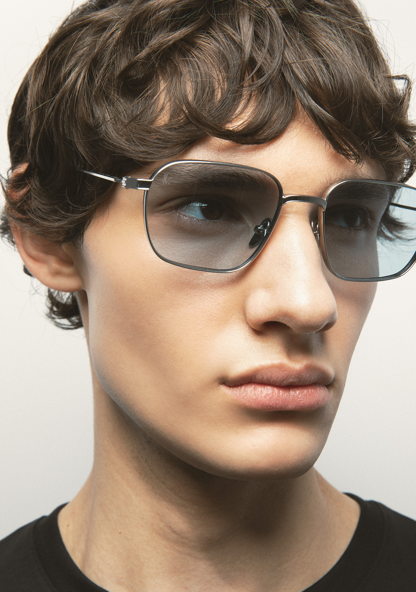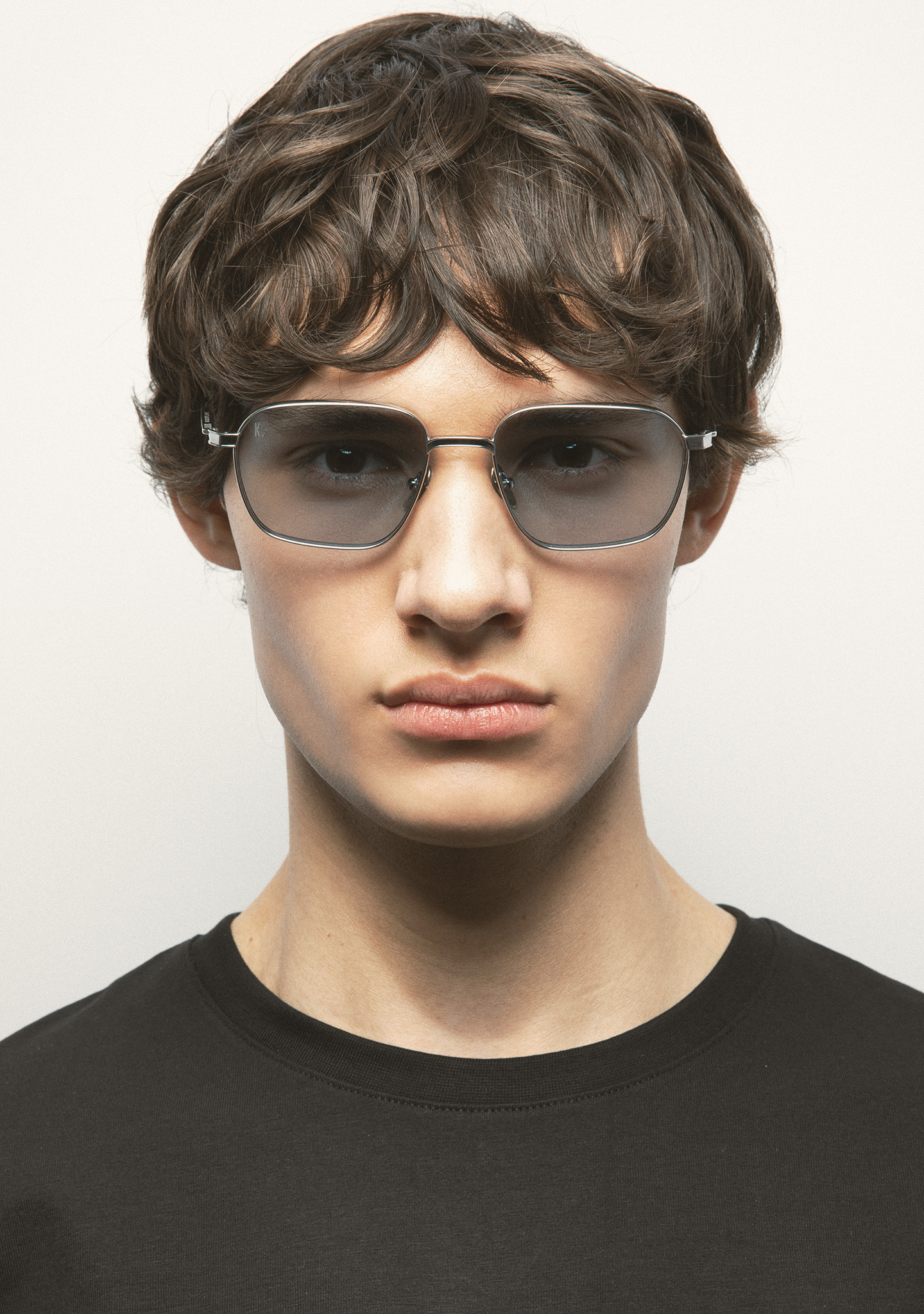Gafas de sol de forma rectangular. Diseño pensado para impactar con sutileza. Frontal y varillas de titanio plata. Varillas con terminal de acetato cristal transparente. Lente azul fotocromática base 2 con protección UV y tratamiento antirreflejante. Lente categoría 1-3. Plaquetas incorporadas. Hecha a mano.