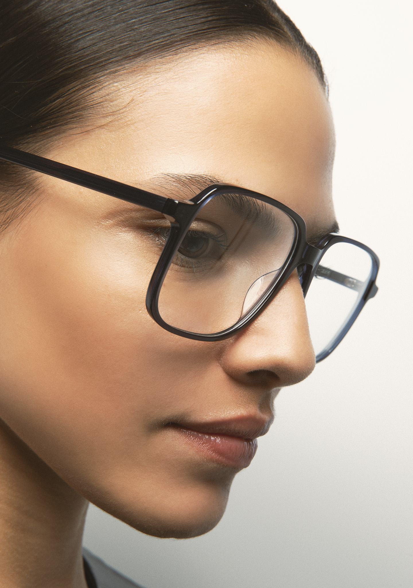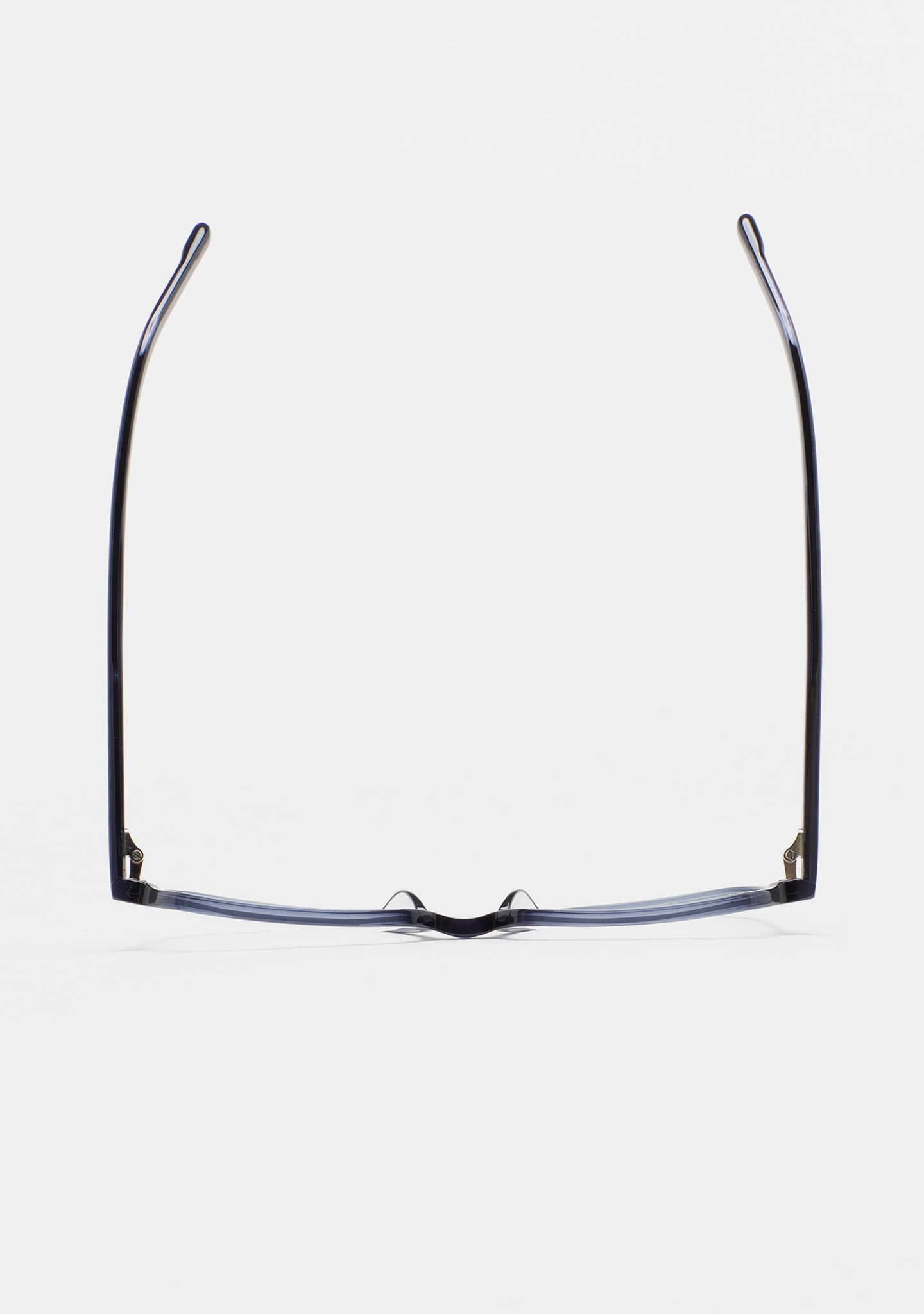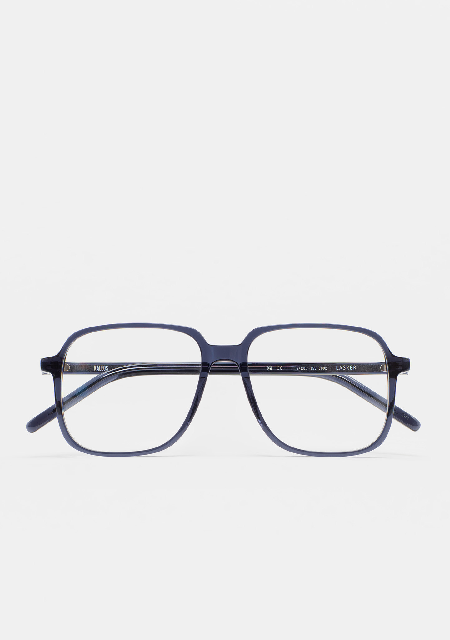 Gafa de ver de forma cuadrada. Frontal y varillas de acetato high density azul grisáceo transparente. Plaquetas de acetato incorporadas. Hecha a mano.