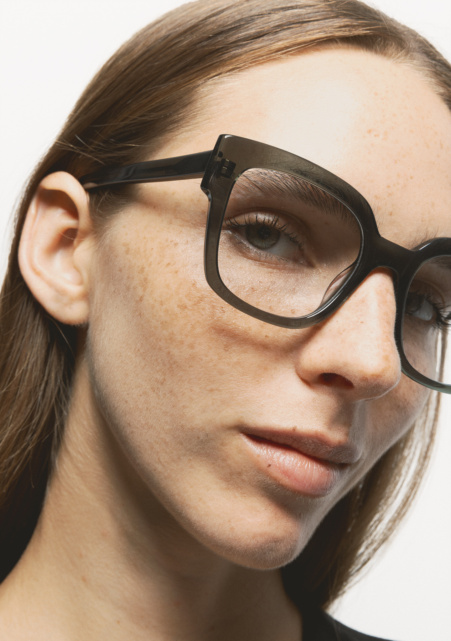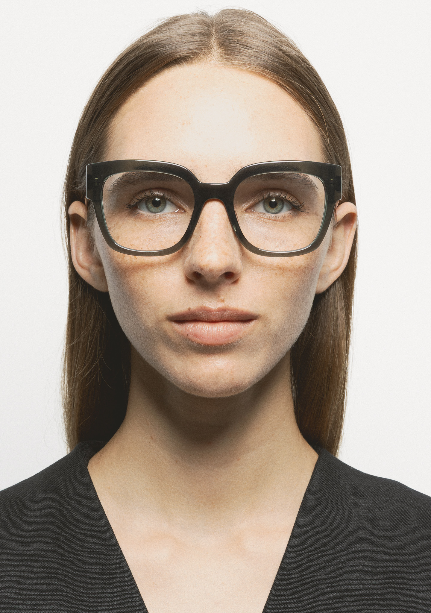 Gafa de ver de forma cuadrada. Frontal y varillas de acetato verde translúcido. Plaquetas de acetato incorporadas. Hecha a mano.
