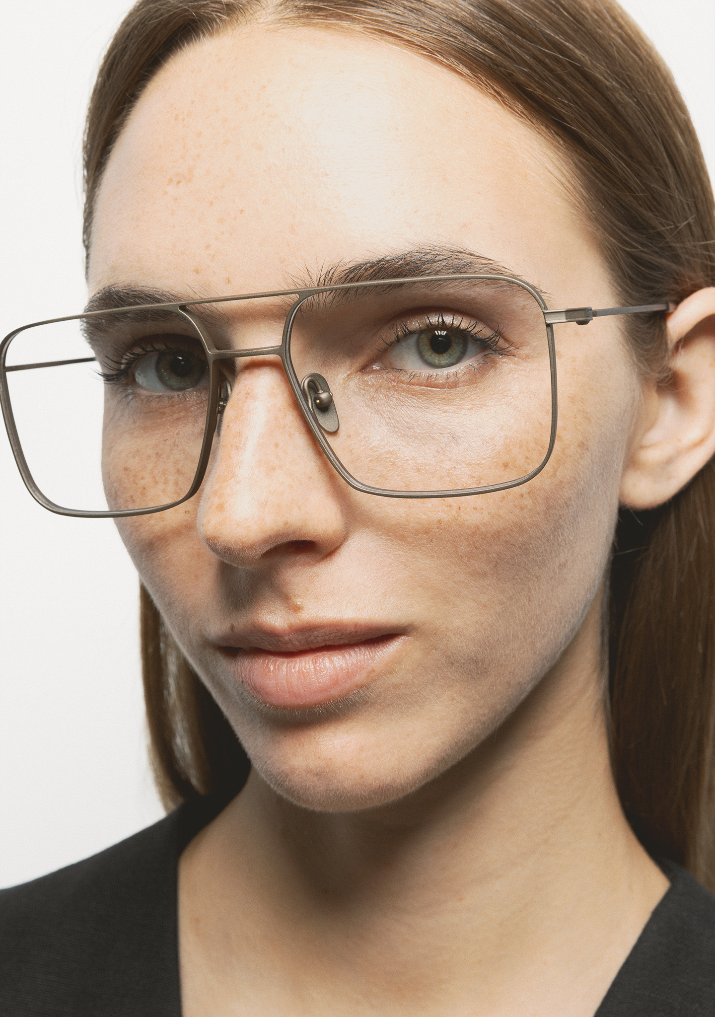 Gafa de ver de forma rectangular con doble puente. Frontal y varillas de titanio marrón. Varillas con terminal de acetato gris claro transparente. Plaquetas incorporadas. Hecha a mano. Gafa disponible en dos tamaños: mediana (M) y grande (L).