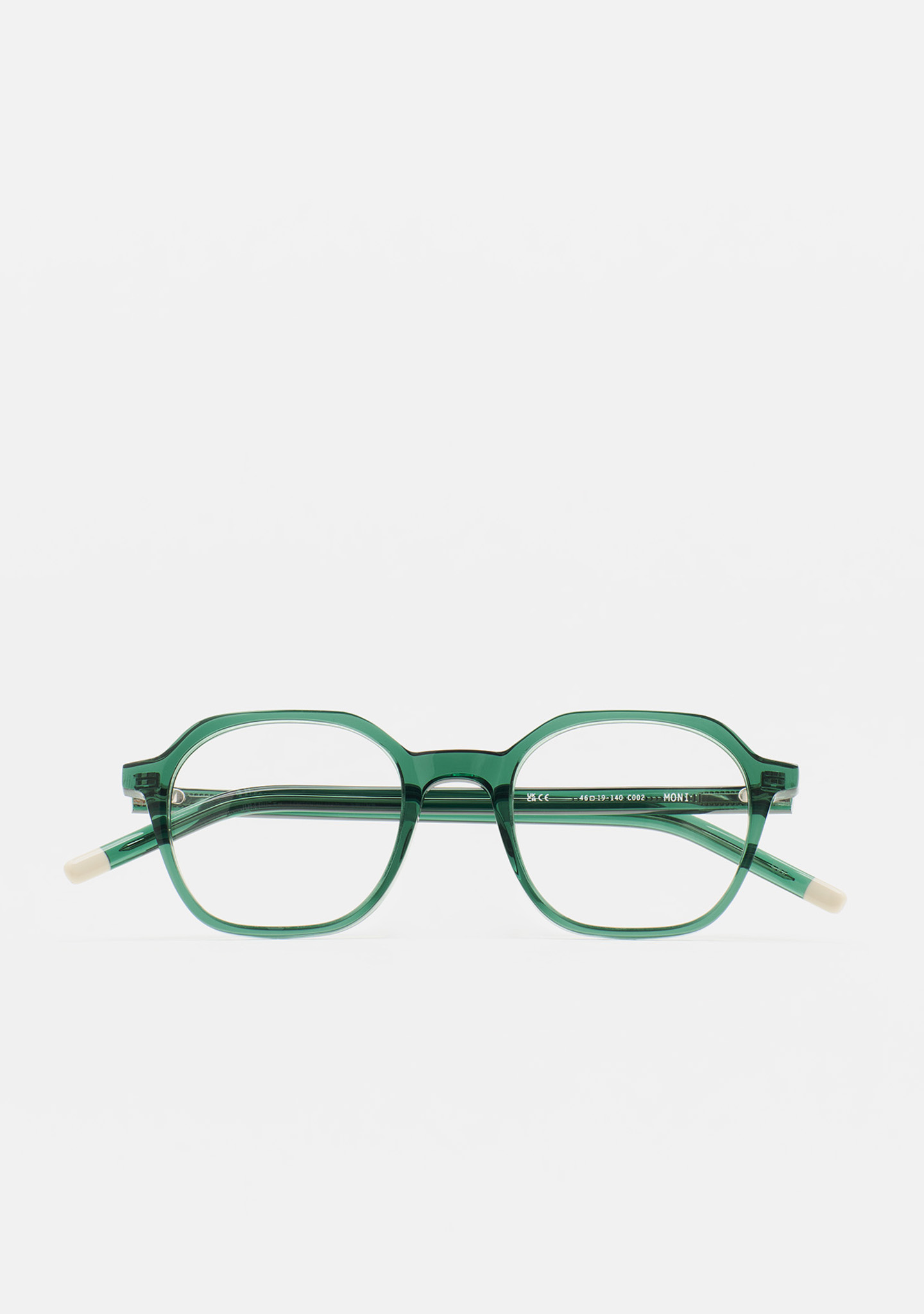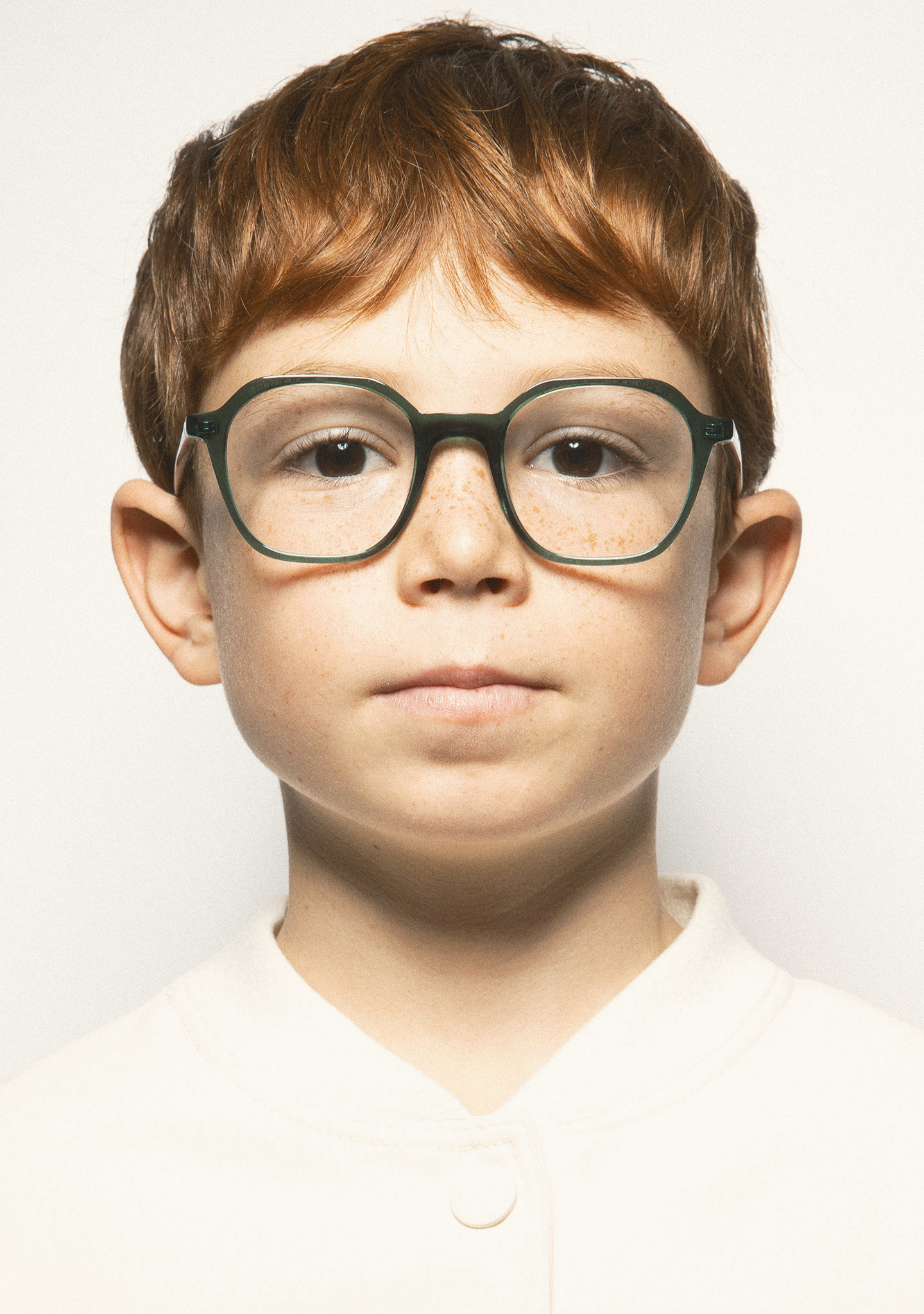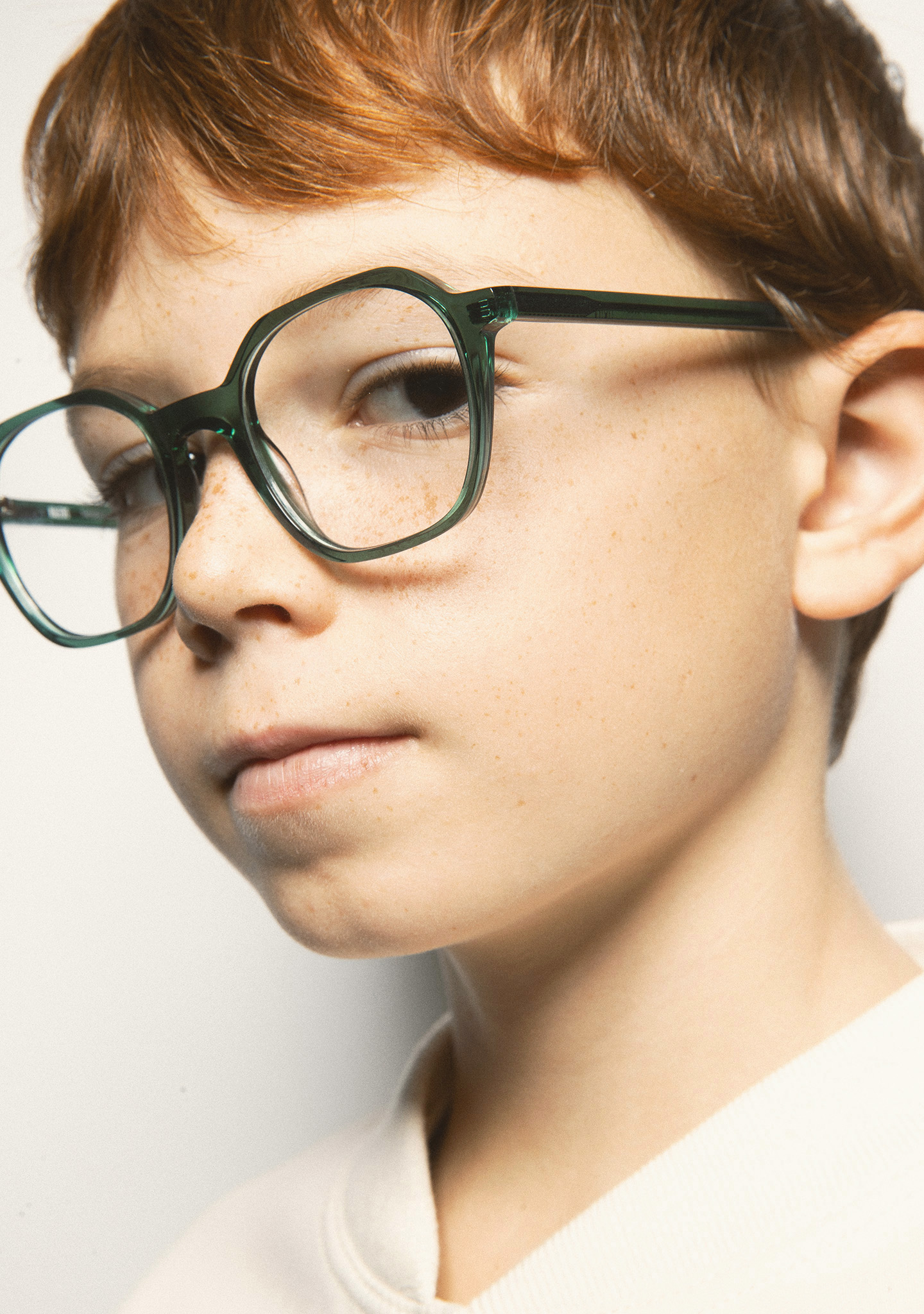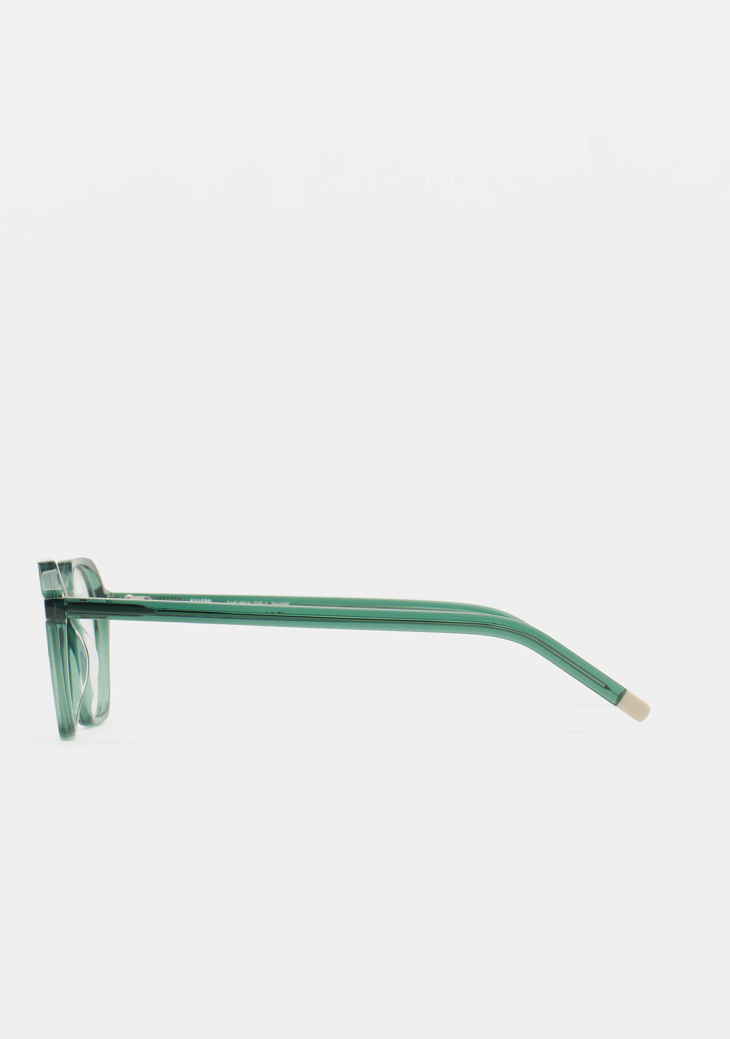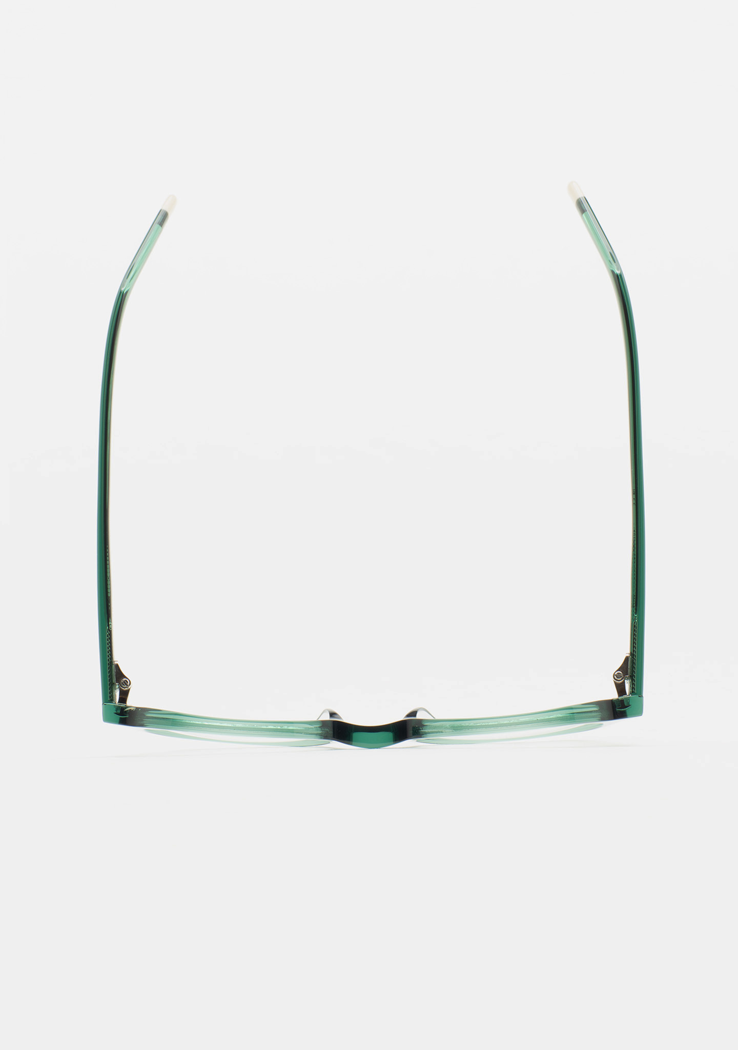 Gafas de ver KIDS de forma cuadrada. Frontal y varillas de acetato verde transparente. Varillas con terminal beige. Plaquetas de acetato incorporadas. Hecha a mano.