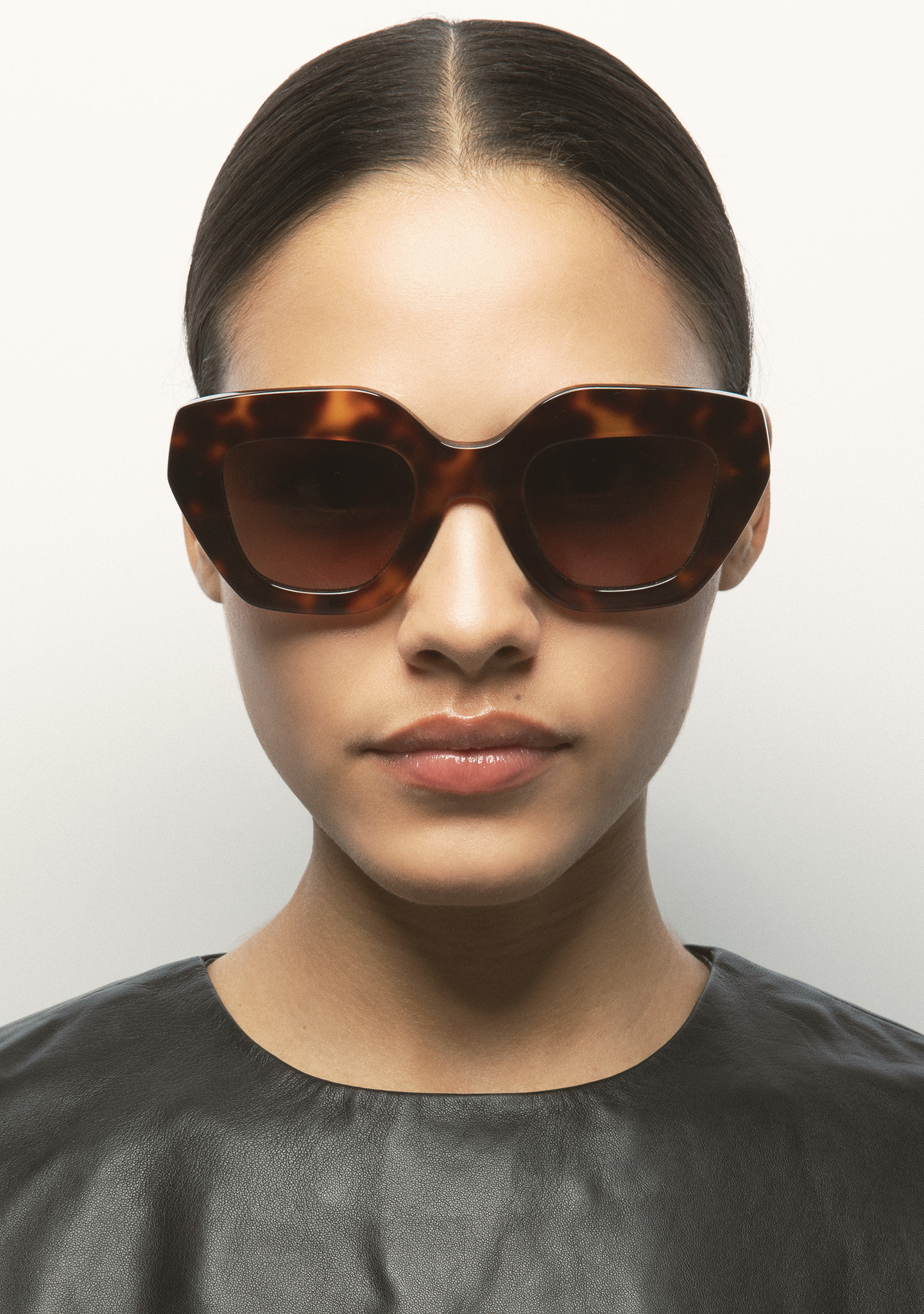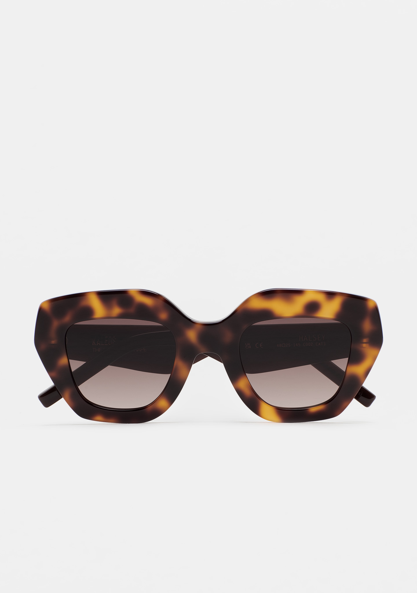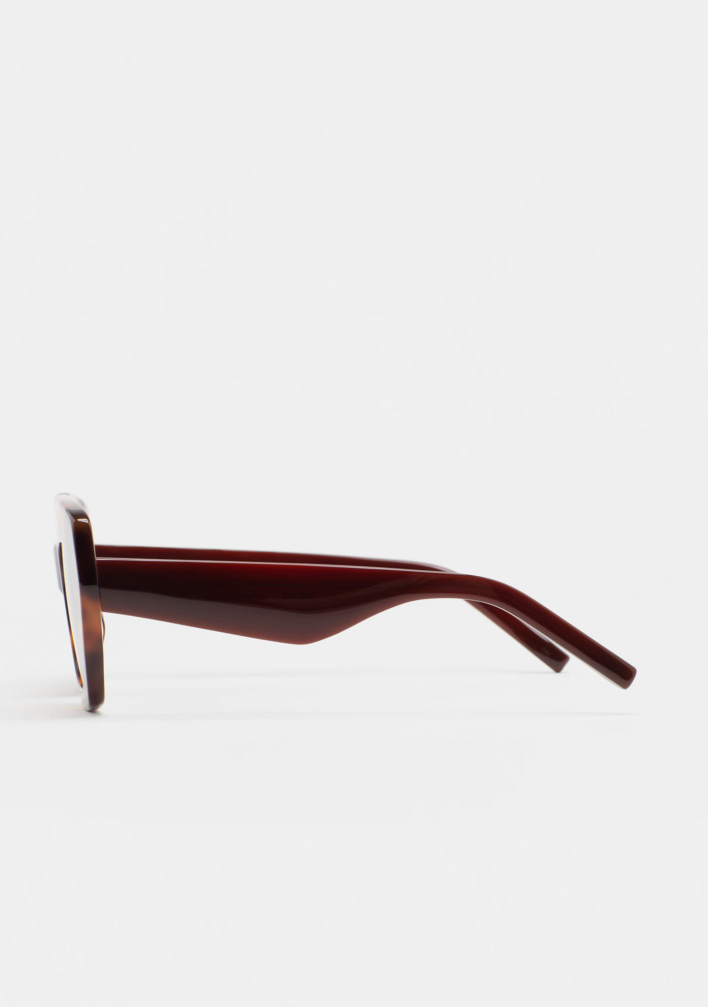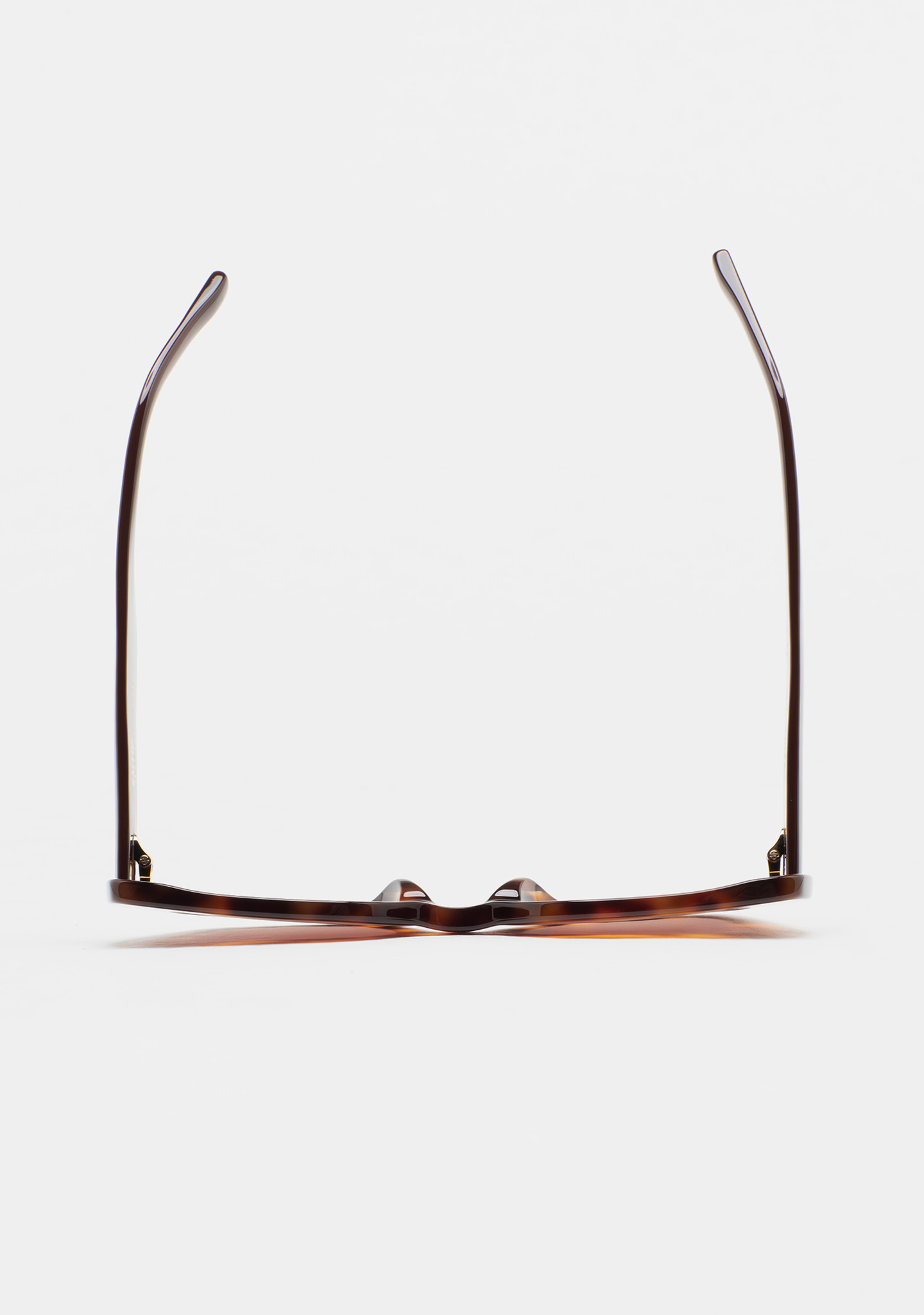 Gafa de sol de forma mariposa. Frontal de acetato havana marrón y varillas de acetato marrón translúcido. Lente marrón degradada base 2 con 100% protección UV y tratamiento antirreflejante. Lente Categoría 3. Plaquetas de acetato incorporadas. Hecha a mano.