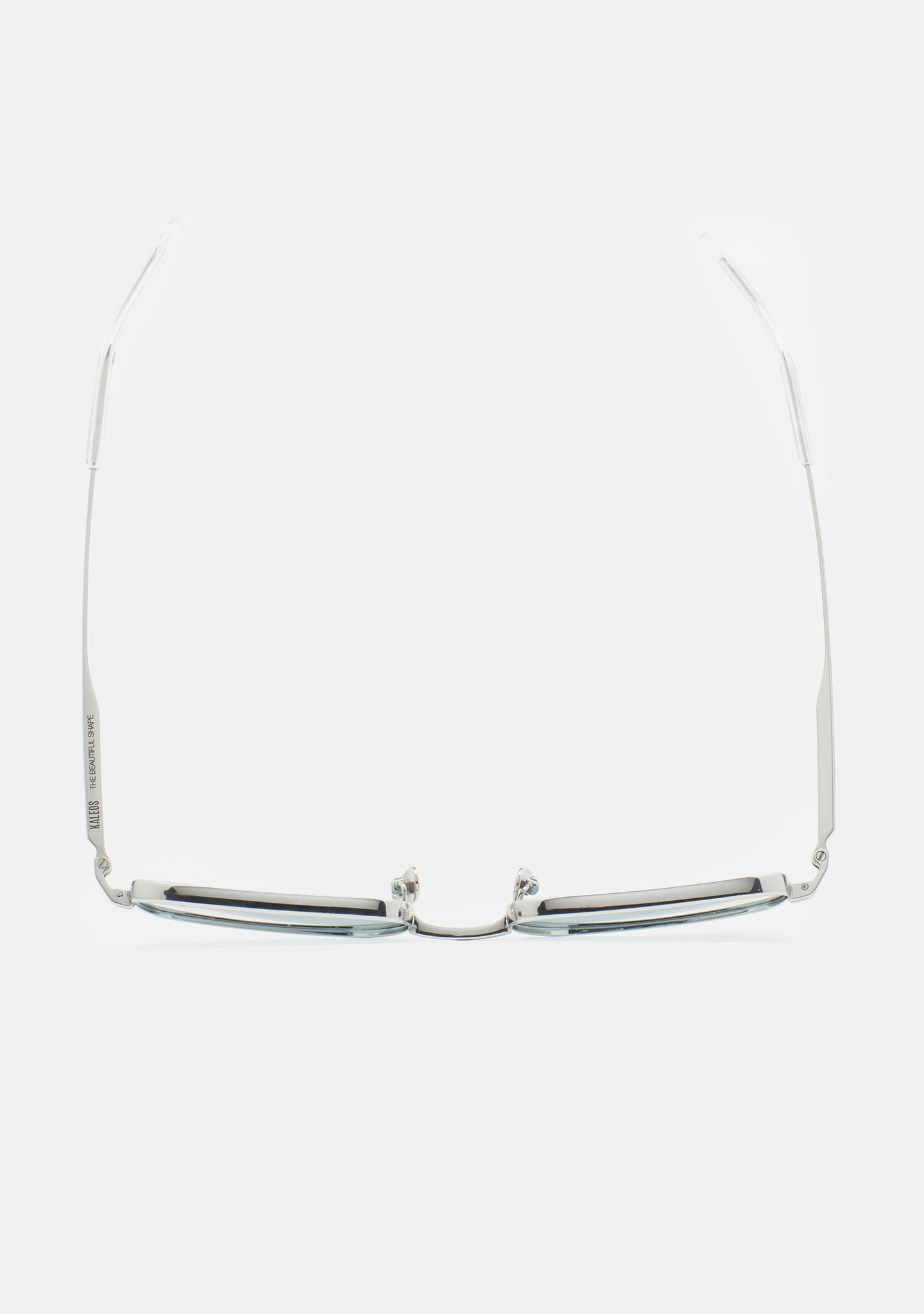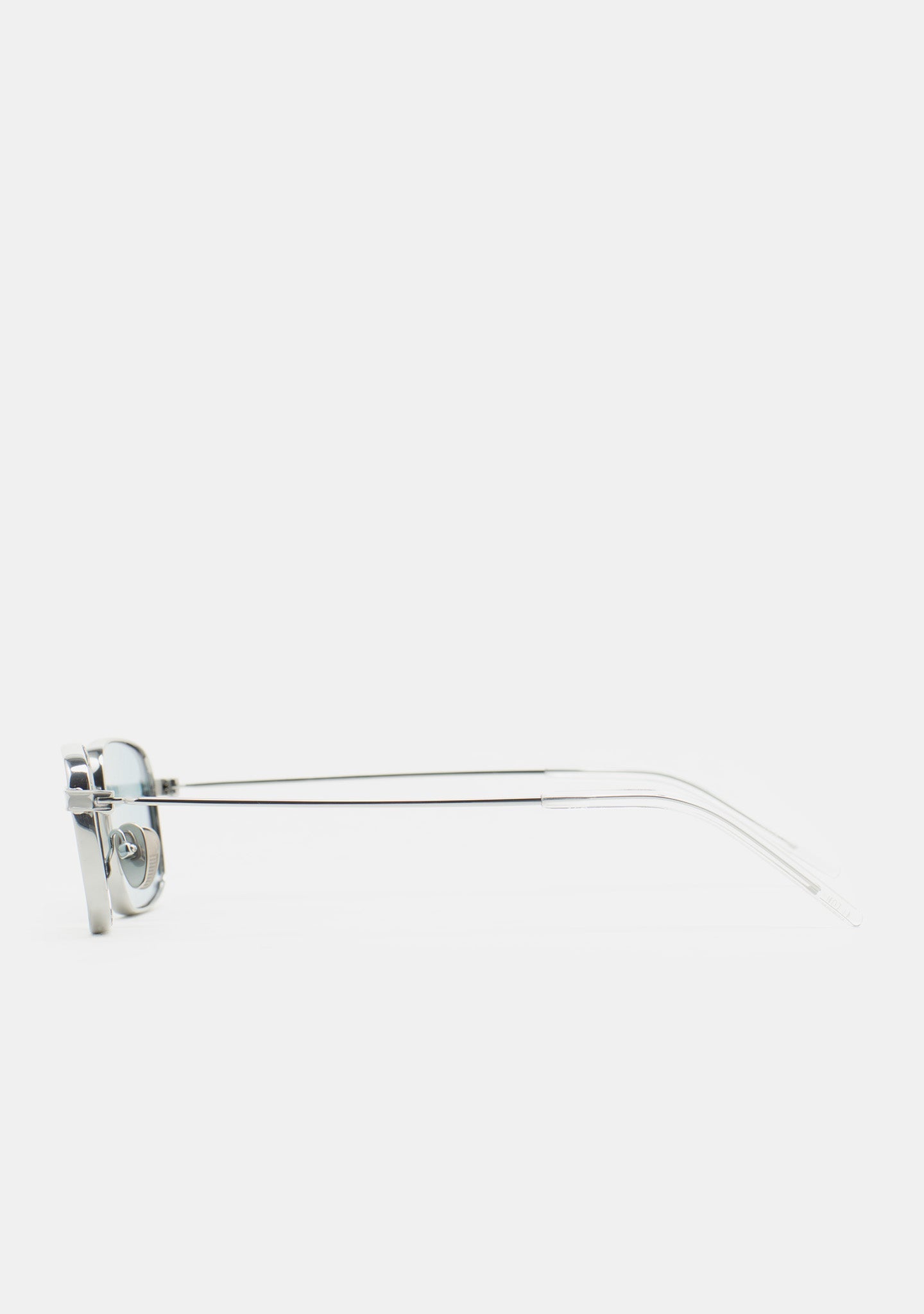 Lunettes de soleil rectangulaires. Artisanales et contemporaines. Face avant et branches en titane argent. Branches avec manchons en acétate cristal transparent. Verres photochromiques bleus base 2 avec protection UV et traitement antireflet. Verres catégorie 1–3. Plaquettes intégrées. Fabriquées à la main.