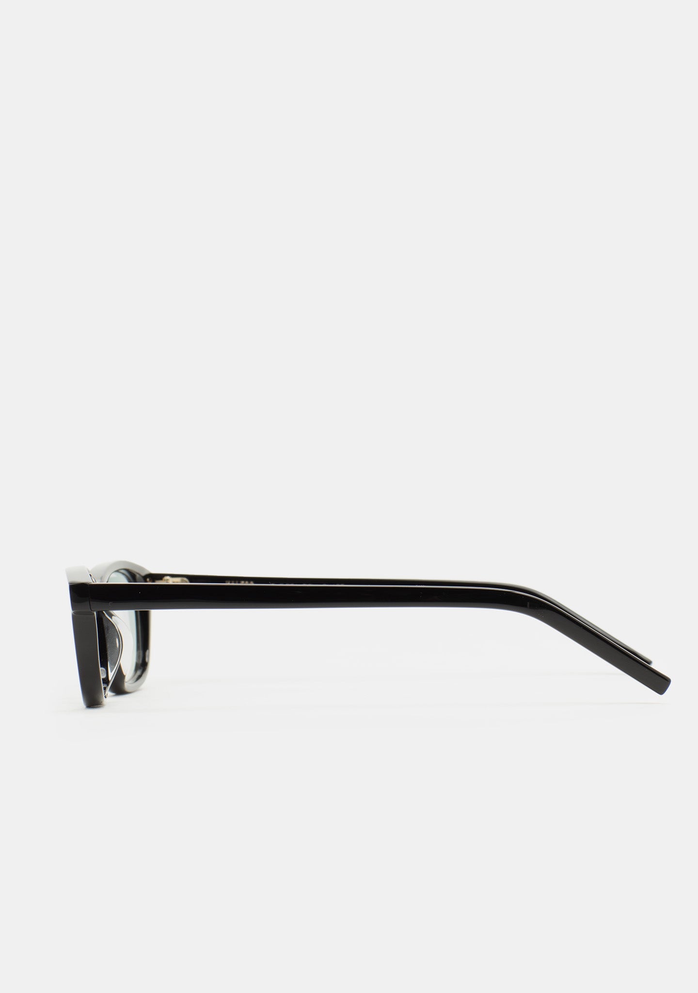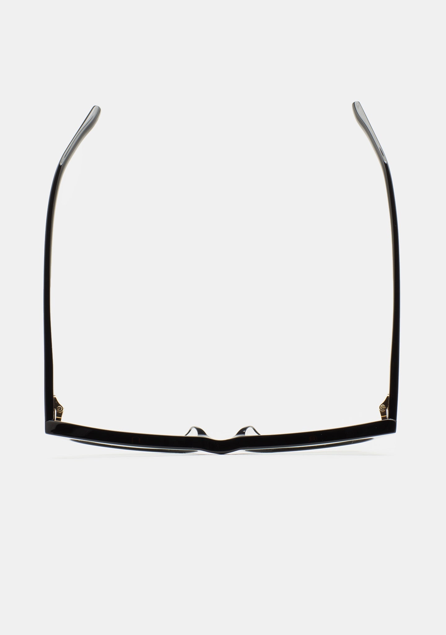 Lunettes de soleil rectangulaires. Minimalisme léger qui inspire confiance. Face avant et branches en acétate noir. Verre photochromique bleu base 2 avec protection UV et traitement antireflet. Catégorie de verre 1-3. Plaquettes en acétate incorporées. Fait main.