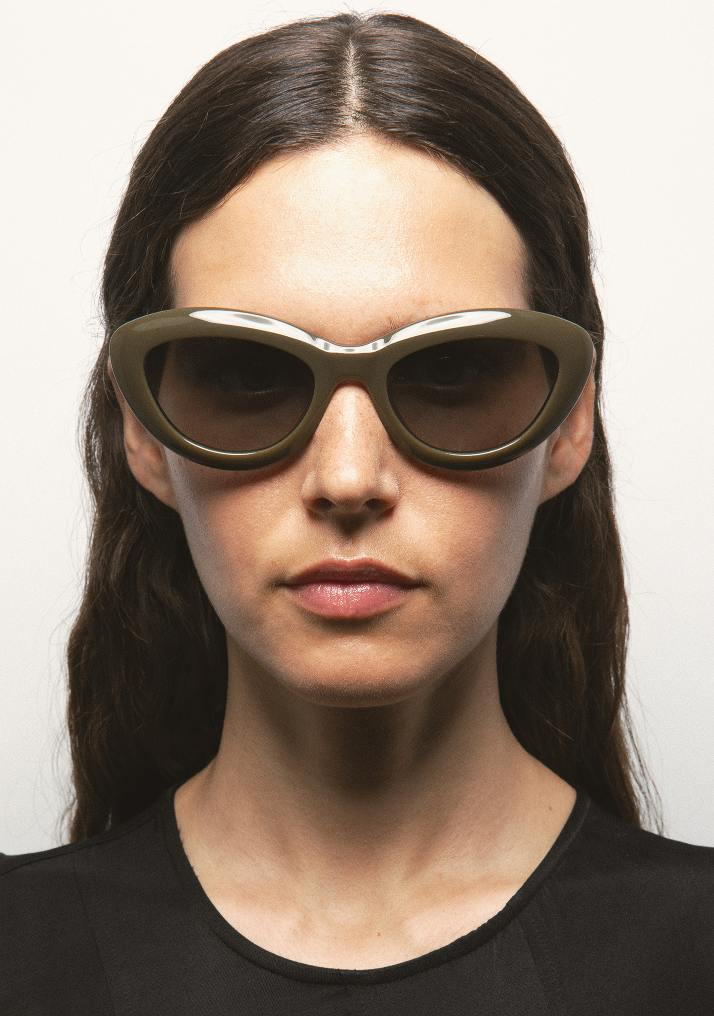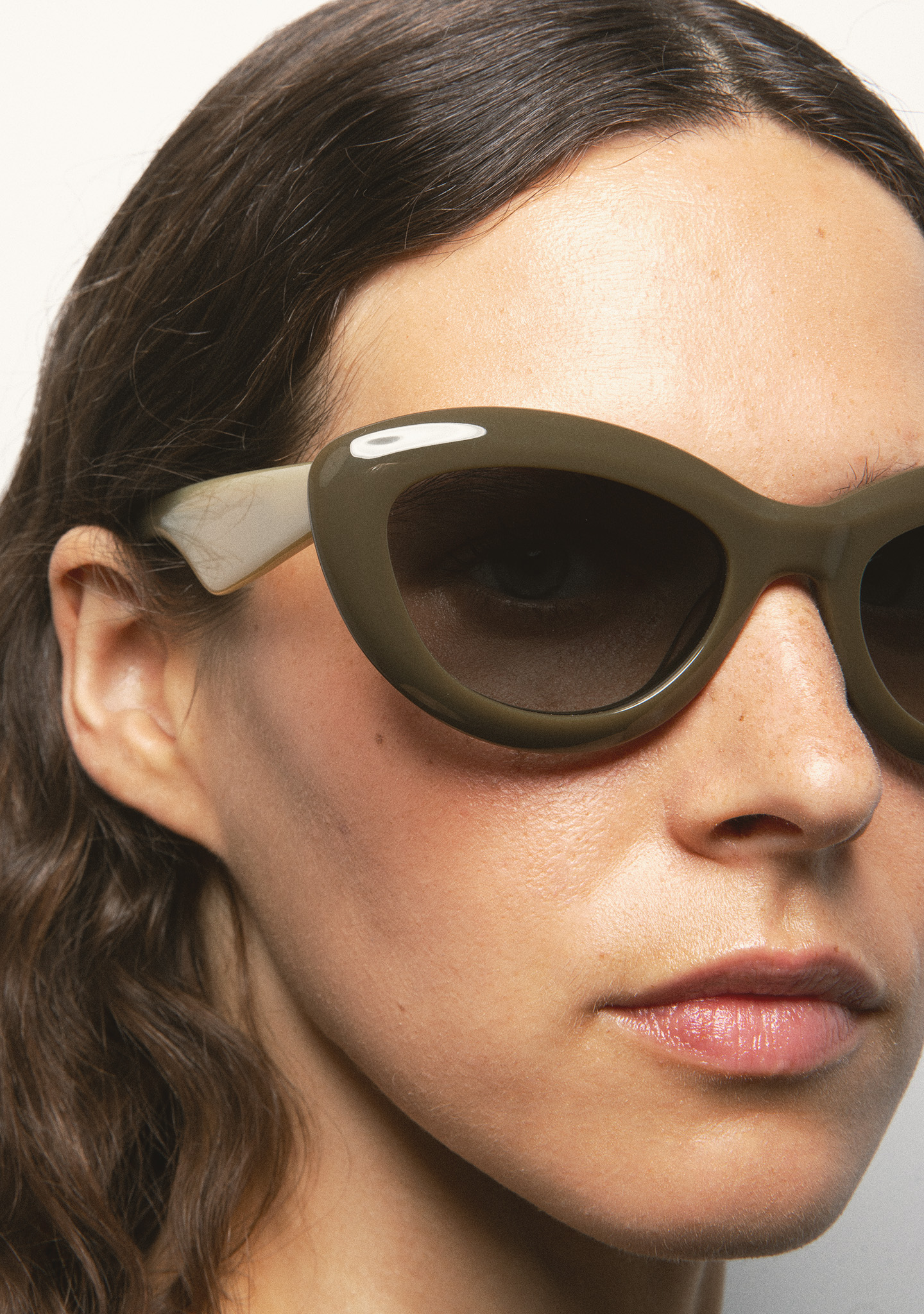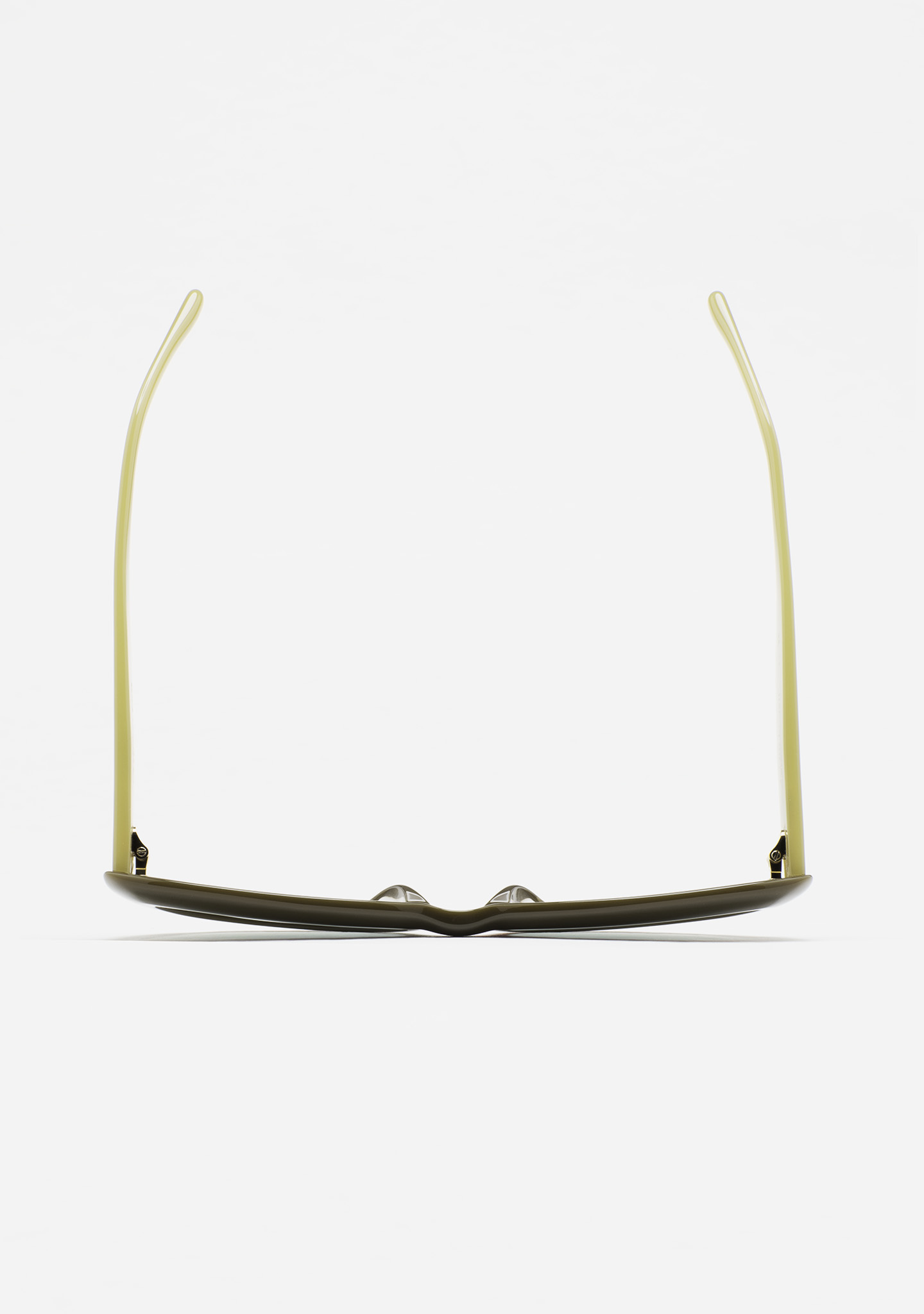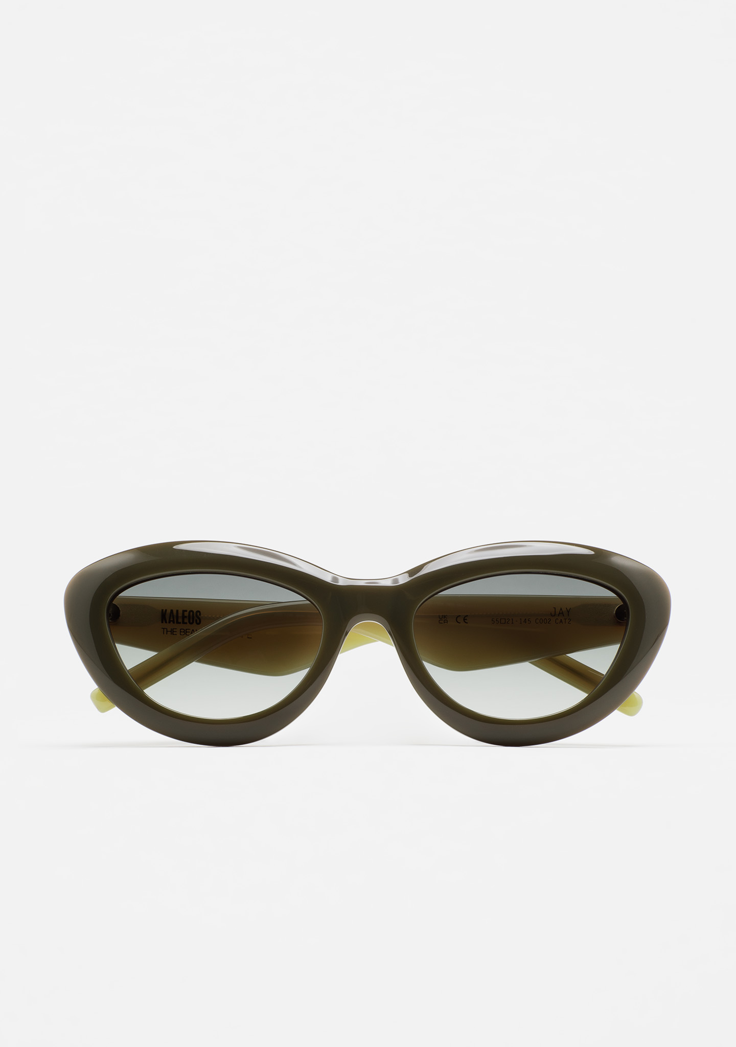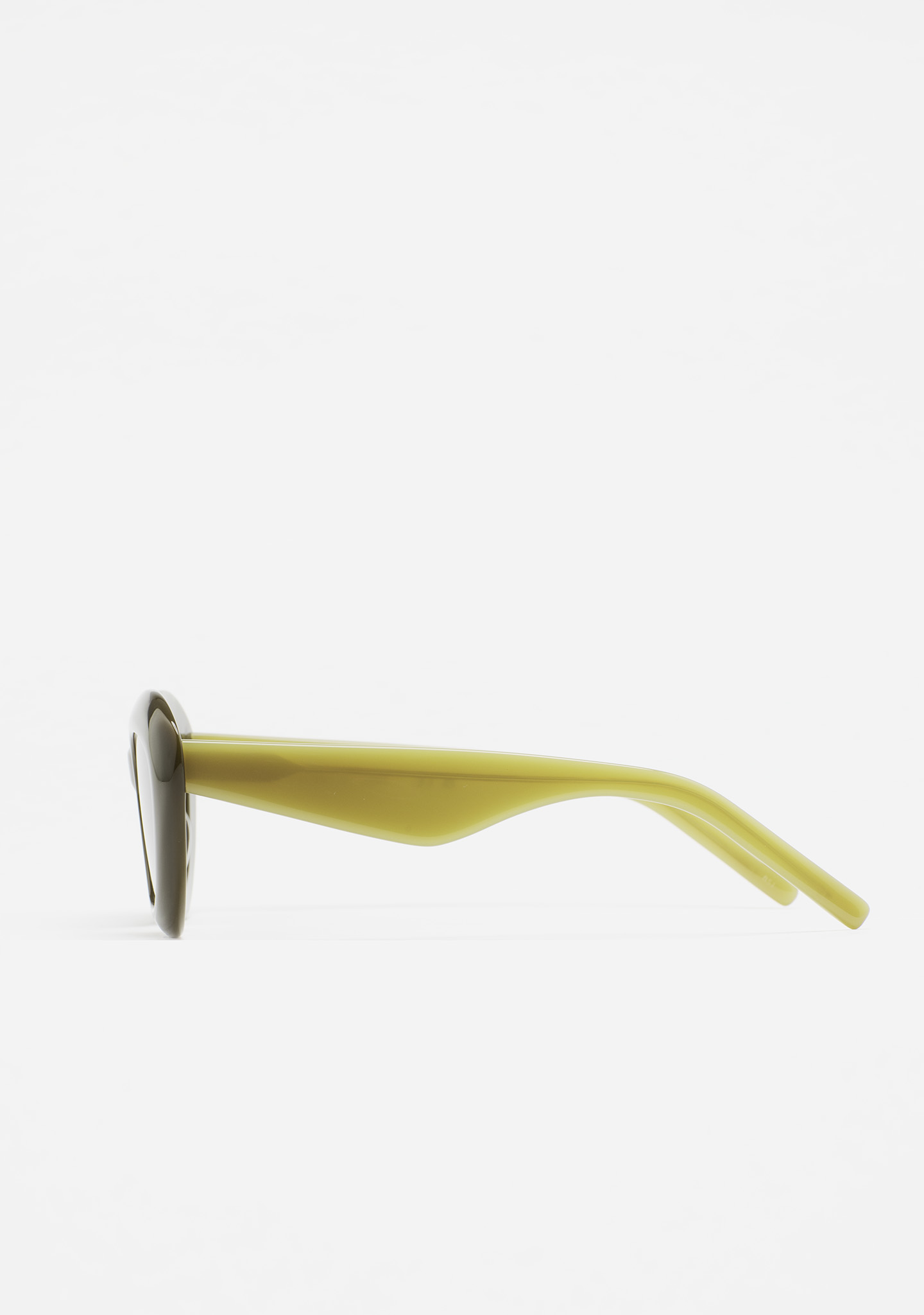 Lunettes de soleil de forme Sil-de-chat avec les coins arrondis. Frontal en acétate vert foncé et branches en acétate vert clair translucide. Verres verts dégradés base 2 avec 100 % de protection UV et traitement antireflet. Verres catégorie 2. Plaquettes en acétate fixes. Fait main.